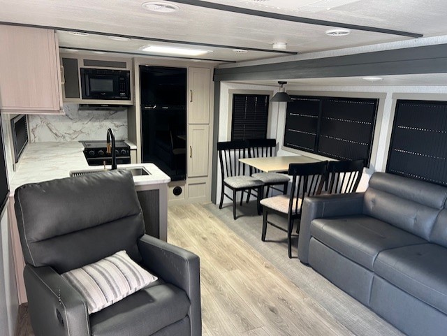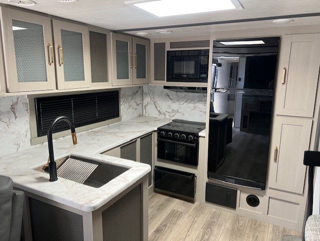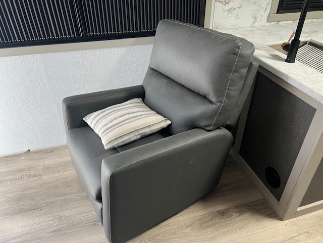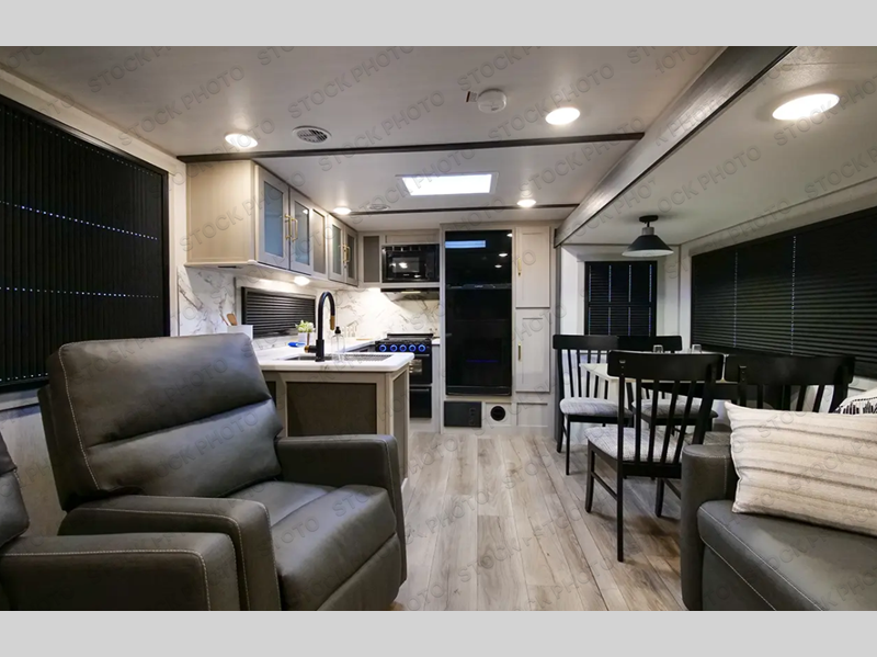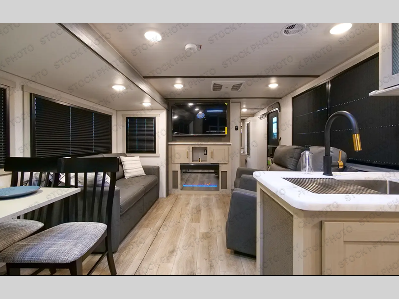 Camping trips just got better with this travel trailer in tow! You can cook in the rear kitchen with a three burner range hood, microwave oven, and a 10 cu. ft. 12V refrigerator. There is also a U-shaped counter to prep all your meals and a pantry to keep snacks close by. Your crew can relax on the tri-fold sofa or booth dinette within the large slide out, and there is an entertainment center with a 40" TV for movie night. Clean up each day in the spacious full bath, then head to the front private bedroom with a walk-around queen bed with Versa-Tilt. There are also dual wardrobes and a closet with washer and dryer prep. Head outdoors to find the 20' power awning, XL Texas size pass-through storage, and exterior griddle!