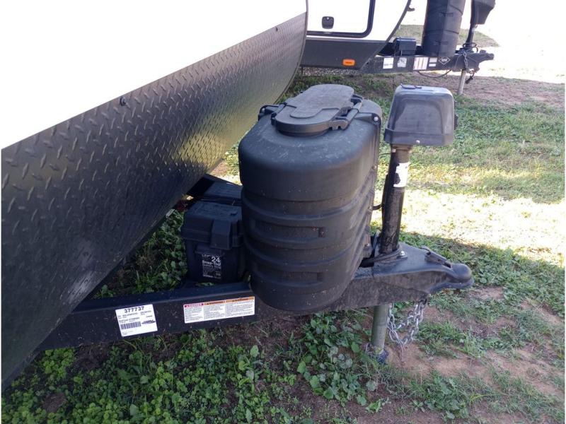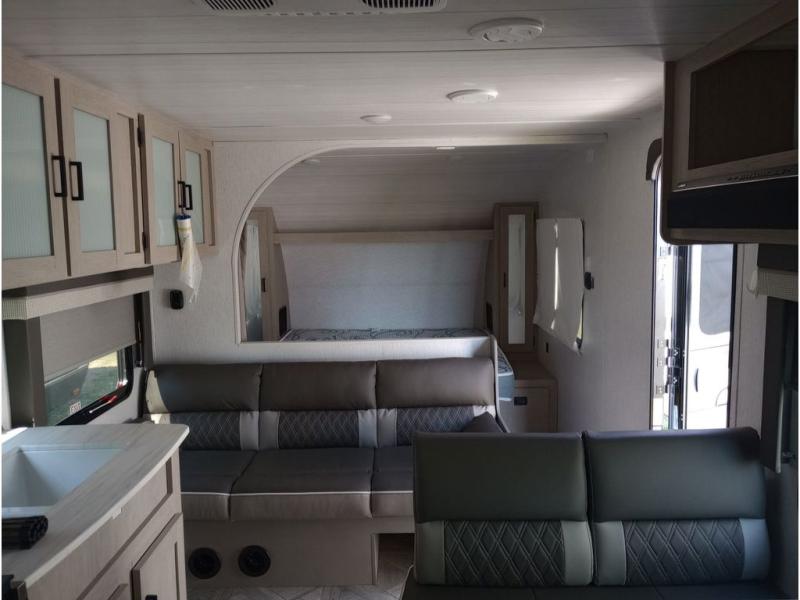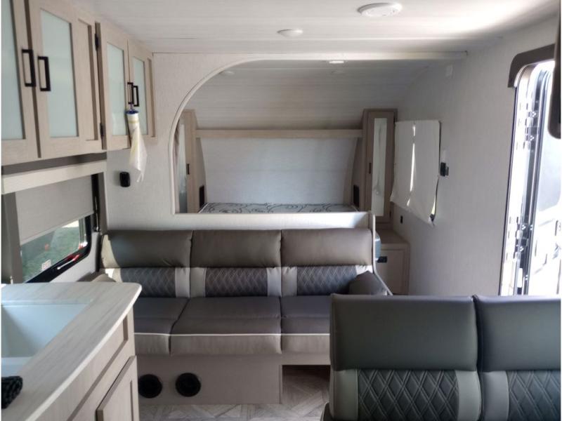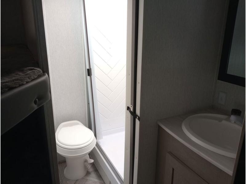 This Wildwood X-Lite travel trailer is packed with features! There is a walk-around custom king bed with Versa-Tilt up at the front that can be sectioned off from the rest of the trailer with a privacy curtain, and the double-size bunks in the back of this trailer will provide you with a compact sleeping space for your little ones. The booth dinette is going to be a great place to sit down together and have a meal when the bugs are too bad outside to sit at the picnic table, and there is also a sofa for relaxation while inside. You will also appreciate the look and function of the seamless countertops in the kitchen, and the 11-cubic foot refrigerator will easily keep your perishable items fresh. There is also an outside camp kitchen option for more choices when cooking for the family.