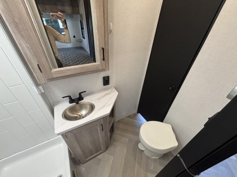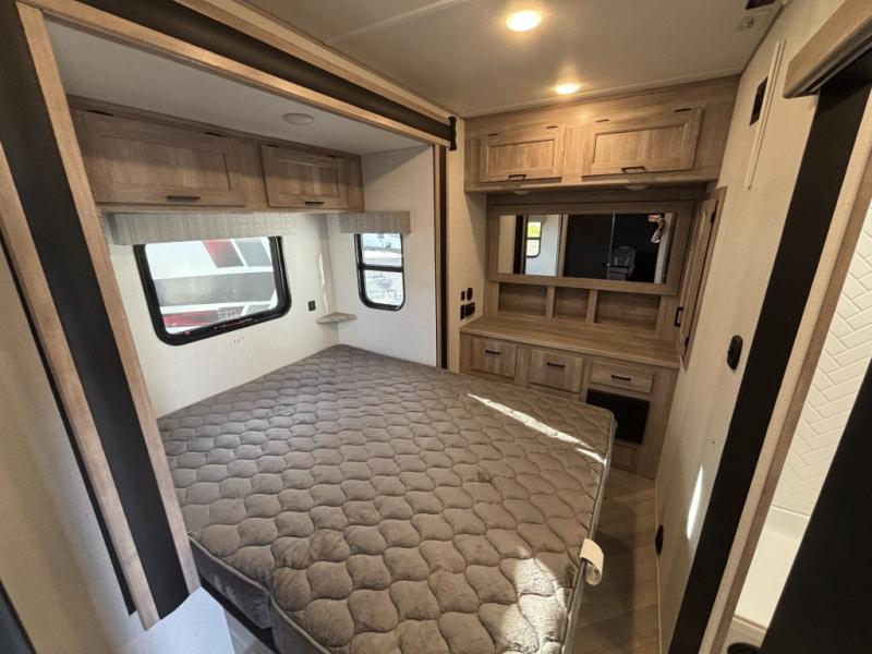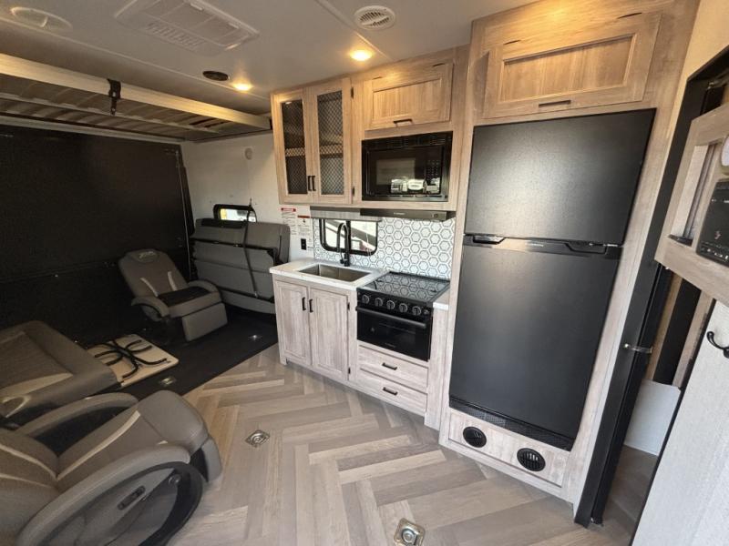 Bring your favorite off-road toys with you in this toy hauler to your favorite camping spots! The 14' garage includes opposing sofa sleepers with a removable dinette table to create a queen bed sleeping area, plus a Euro bed above for your guests to sleep on. Head to the main living/kitchen area to prepare a quick lunch on the three burner cooktop, then relax in one of the two chairs before heading back outside. The front of this toy hauler is shared with the master bedroom and dual entry bath you are sure to love, pus there is a dresser with a mirror to get ready each day. The exterior has many features you will love like the docking station, the outside TV prep area, the 14' power awning, and the outside storage areas!