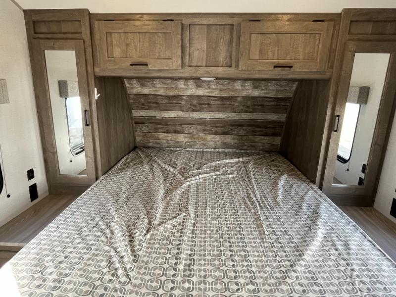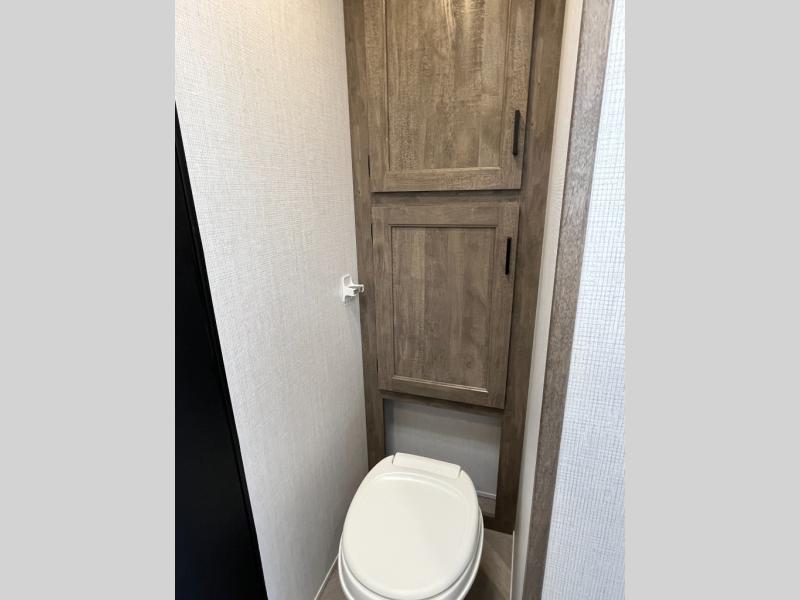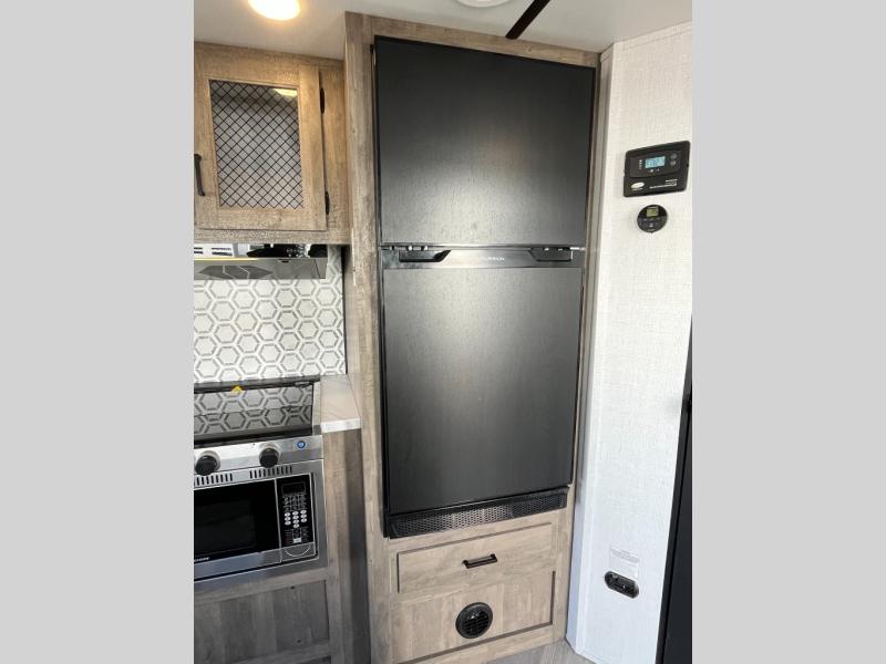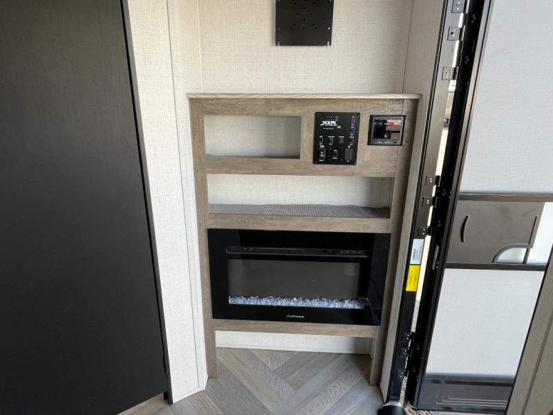 This toy hauler will feel a little more like home with a private bedroom up front and a cozy RV queen bed to sleep on each night. There are dual wardrobes and dual nightstands to keep your things tidy, and a walk-through bath for easy access. Whip up breakfast on the three burner cooktop, and your perishables can go back in the 8 cu. ft. 12VDC black refrigerator. Once your toys are unloaded from the 14' 6" total garage space, you can dine at the gaucho sofas with removable dinette table in between. There is also a Sleep N Store bed system to sleep tired guests above.