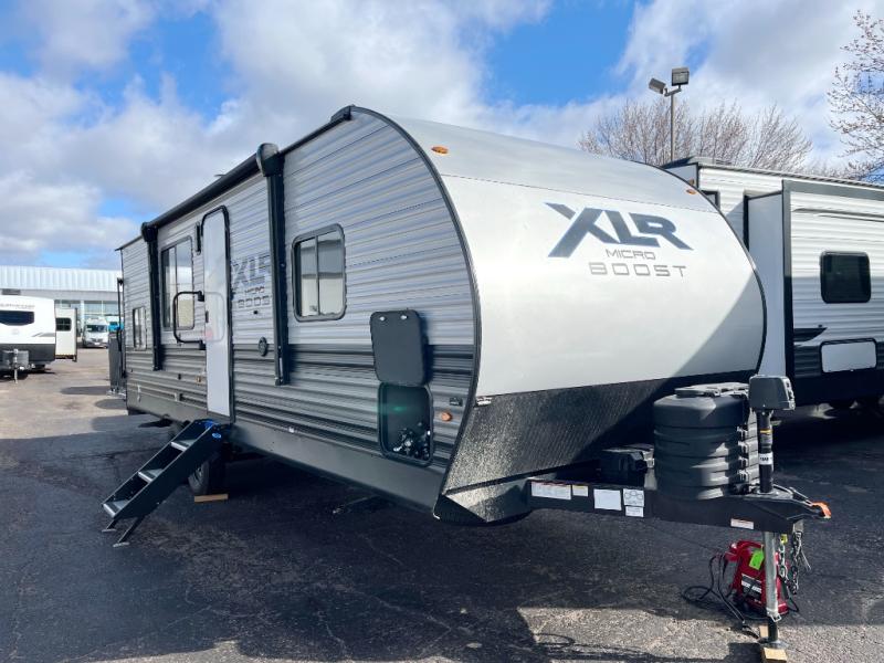 The XLR Micro Boost toy haulers by Forest River are ready to boost your fun outdoors! These travel trailers and fifth wheels are easier to tow and include an Alumifoil insulated enclosed underbelly so you can camp all year long. The industrial garage flooring and 5,000 lb. tie-downs make loading and securing your toys easier than ever, and the VIP patio deck found on each model means you can entertain guests. The interior of these toy haulers will have you feeling right at home with tub/showers with skylight, solid surface countertops, USB charging station, and decorative kitchen backsplash. You'll find many more convenient features found throughout, like the tankless water heater, the magnetic screen wall, plus the Renewable Entergy Package with a 200 watt solar panel for off-grid camping!
