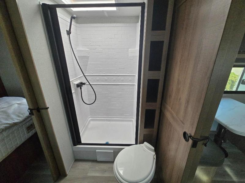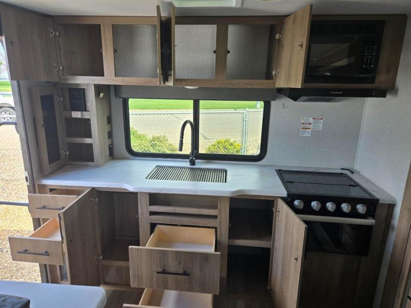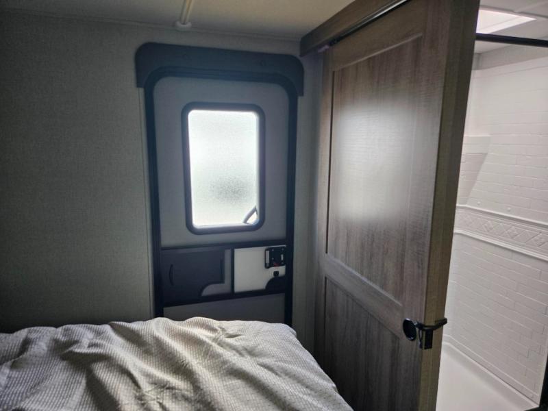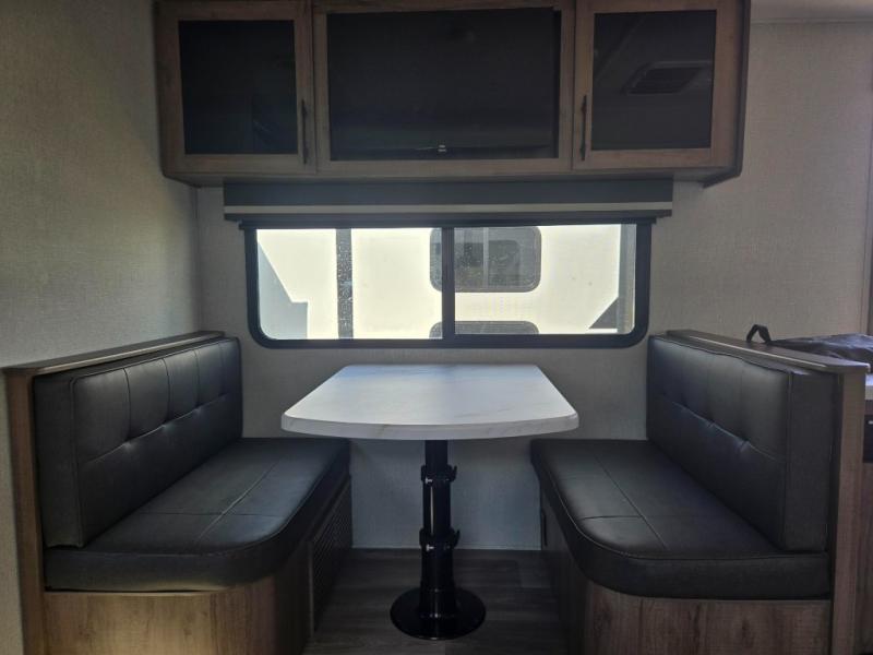 Treat yourself to a weekend of fun in this Imagine XLS travel trailer! Whether it's just you and your spouse, or you've chosen to bring along a group of friends, this trailer will meet the need. The front bedroom can sleep two people on the walk-around queen-size bed. The bedroom is quite functional because it not only contains the second exterior entry door, but it also has a private entrance into the walk-through bathroom since it is located on the other side of the bathroom. The booth dinette is functional too because it can transform from a dining location into a sleeping location, and the theater seating is directly across from the LED TV for easy viewing.