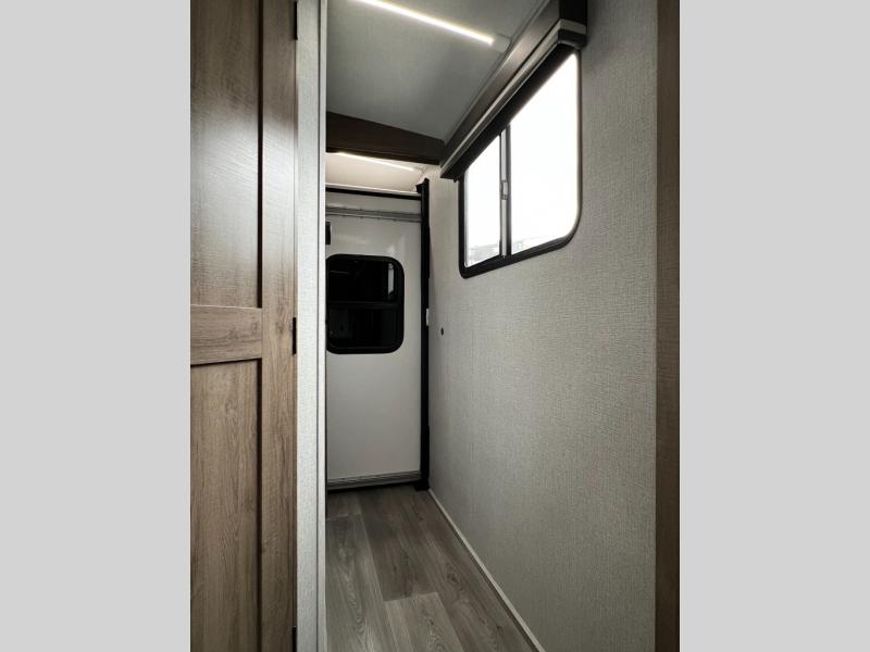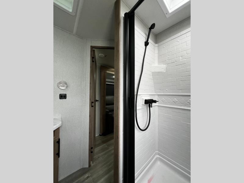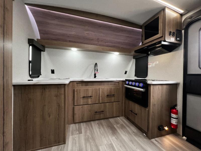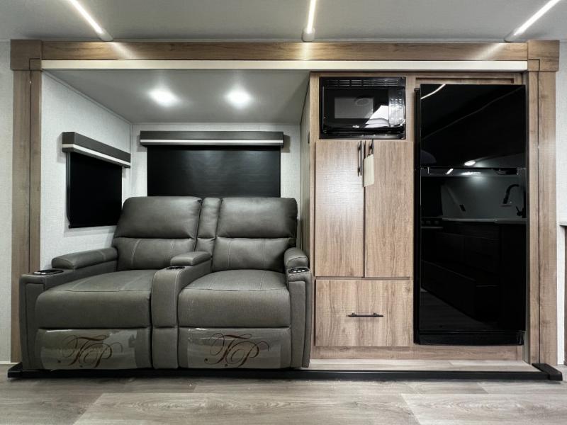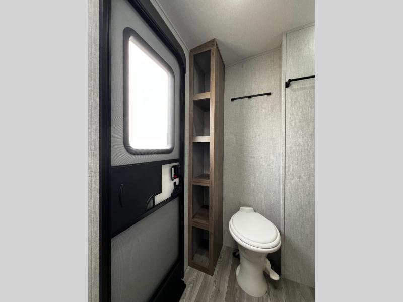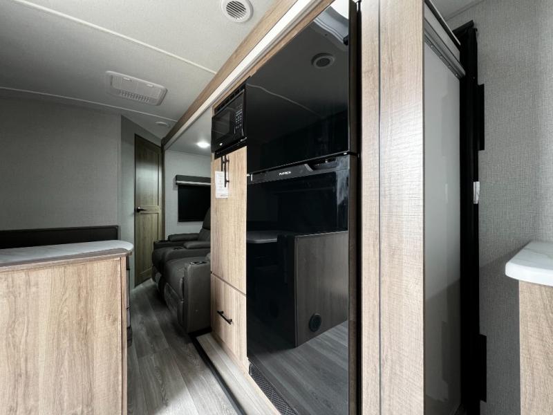 You will love this front kitchen layout couples trailer with dual entry/exit doors with one door leading directly into your full bath! Here you will find a shower, toilet, a corner vanity with sink and overhead cabinet, plus linen storage. The second entry closest to the front leads directly into your spacious front kitchen. Here you will enjoy lots of counter prep space for cooking, a three burner range and oven, plus shelves and storage. Your refrigerator and pantry are within the large slide that also houses theater seating for relaxing, or you could choose the optional tri-fold sofa if you are used to having overnight guests. For you, a rear private bedroom featuring a queen bed slide, a desk and dual wardrobes, plus a space saving sliding door. On the outside, a spray port to rinse off feet or your furry pal, LP quick connect, and a 21' awning to provide added living space to enjoy outdoors!