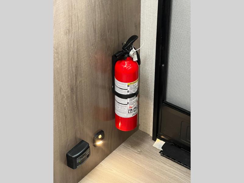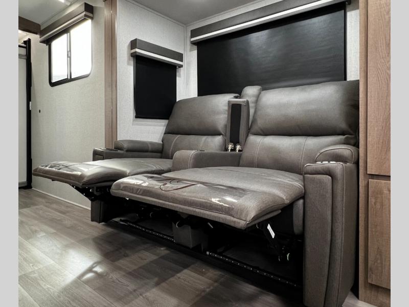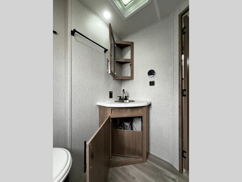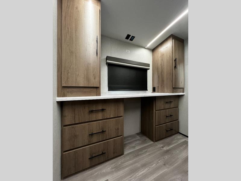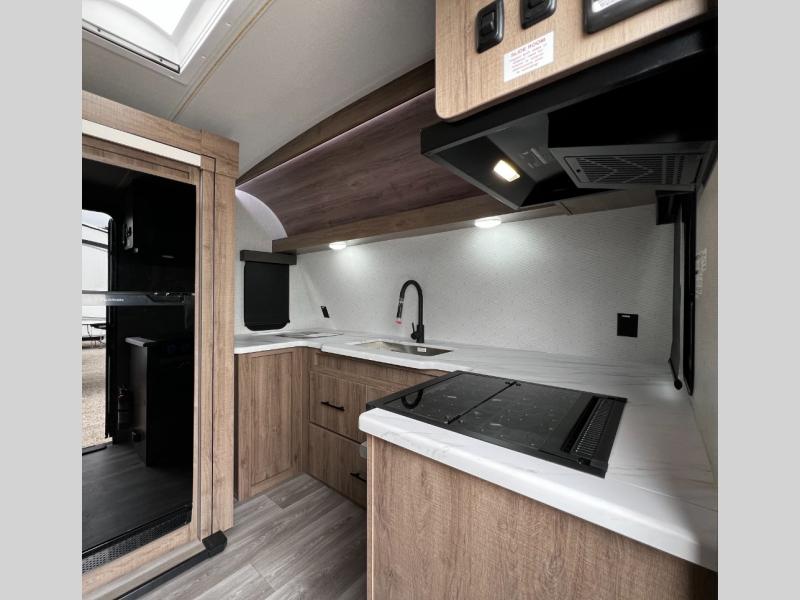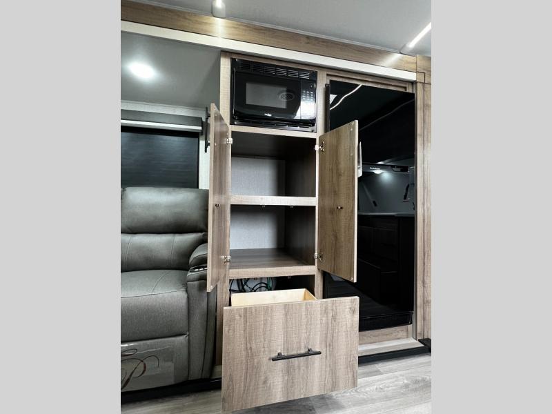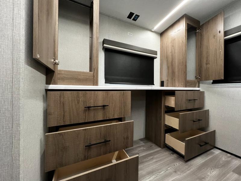 You will love this front kitchen layout couples trailer with dual entry/exit doors with one door leading directly into your full bath! Here you will find a shower, toilet, a corner vanity with sink and overhead cabinet, plus linen storage. The second entry closest to the front leads directly into your spacious front kitchen. Here you will enjoy lots of counter prep space for cooking, a three burner range and oven, plus shelves and storage. Your refrigerator and pantry are within the large slide that also houses theater seating for relaxing, or you could choose the optional tri-fold sofa if you are used to having overnight guests. For you, a rear private bedroom featuring a queen bed slide, a desk and dual wardrobes, plus a space saving sliding door. On the outside, a spray port to rinse off feet or your furry pal, LP quick connect, and a 21' awning to provide added living space to enjoy outdoors!