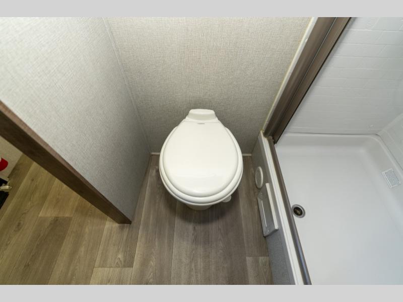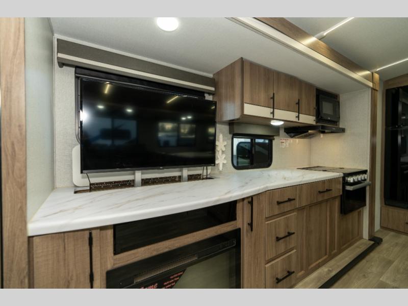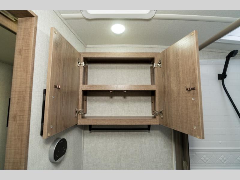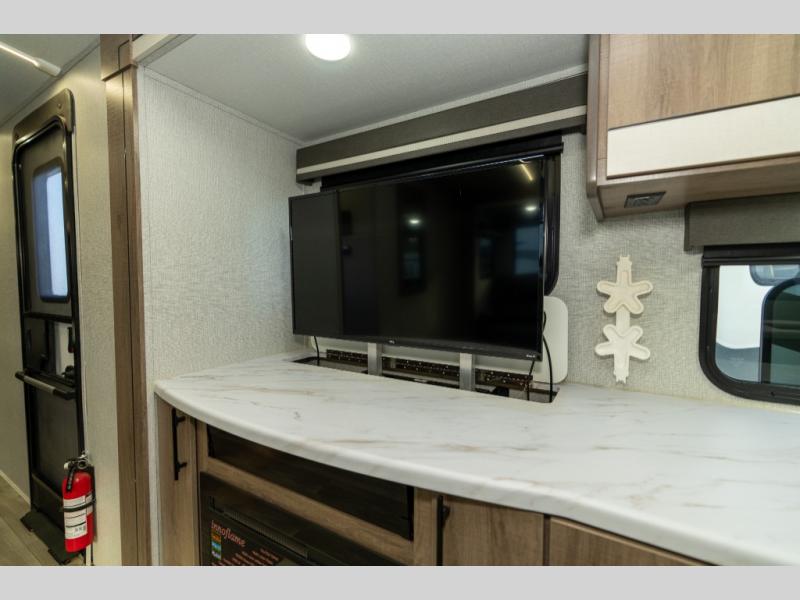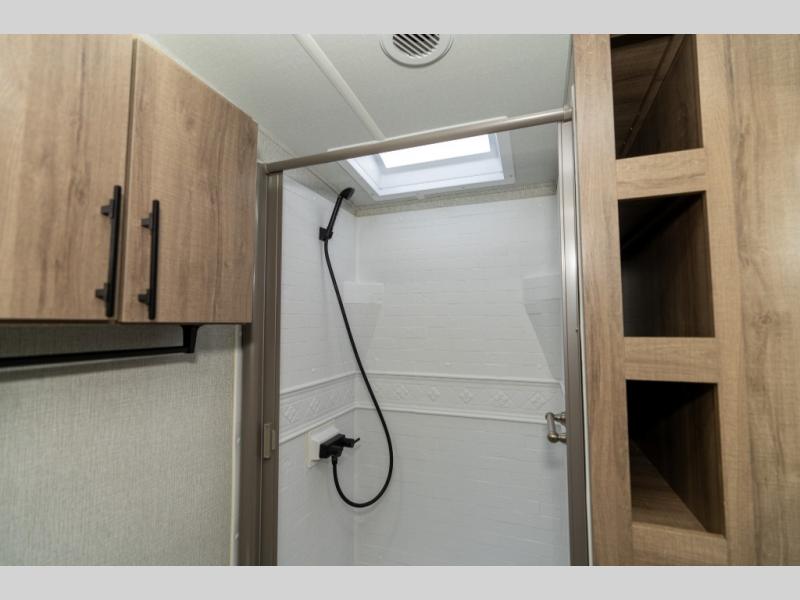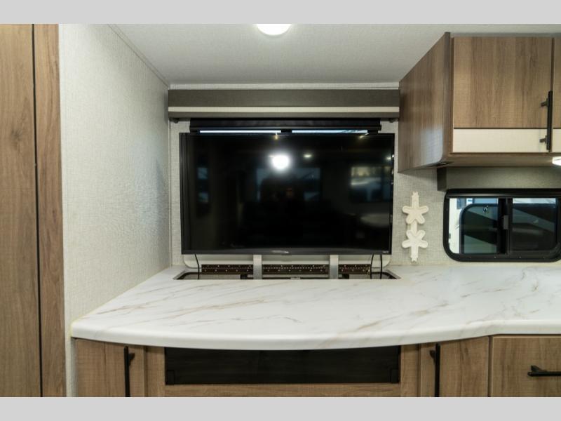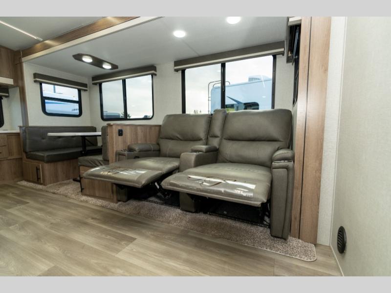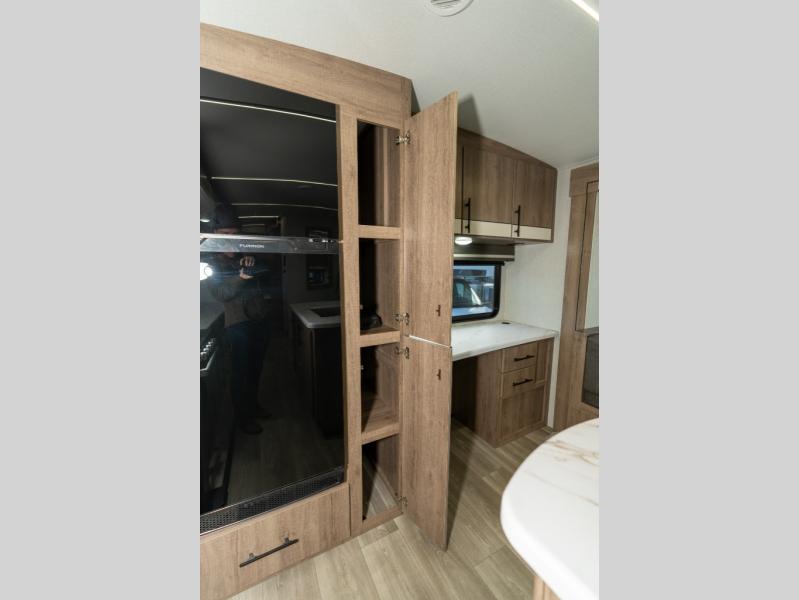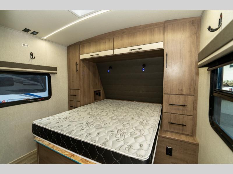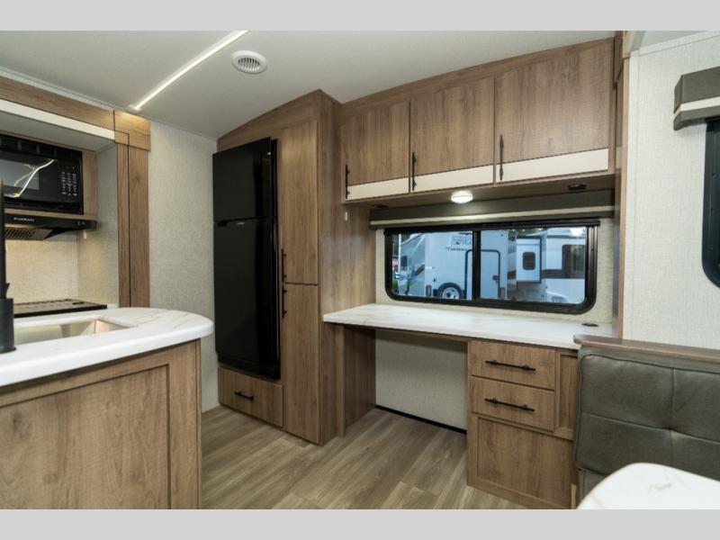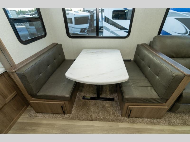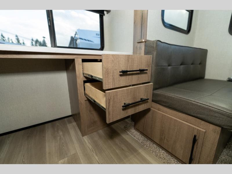 With this Imagine travel trailer, you can work while you're on the road because it offers you a desk in the main living area. You won't have to miss out on the action since you'll be right next to the booth dinette and tri-fold sofa, and there is even a pantry directly to the left of the desk for you to grab a quick snack while you're working. Once you're done with work, you can relax on the tri-fold sofa while you watch the telescoping 40" LED HDTV, and the private bedroom offers you a 60" x 80" queen bed to rest on when you're ready to call it a night.