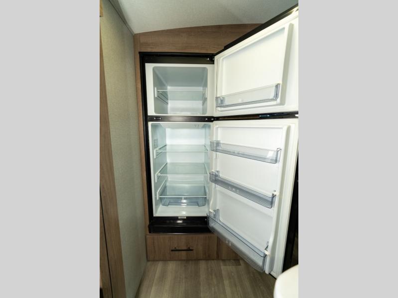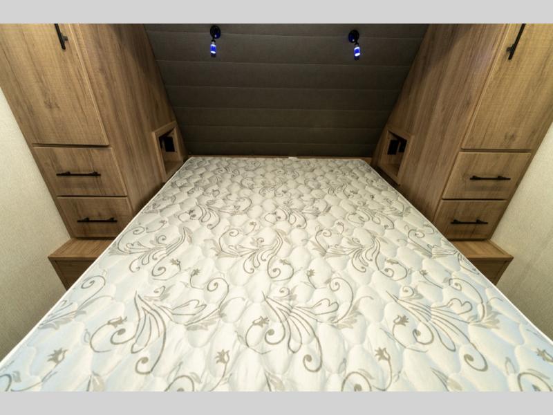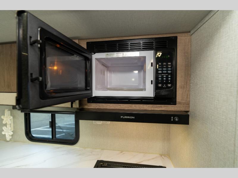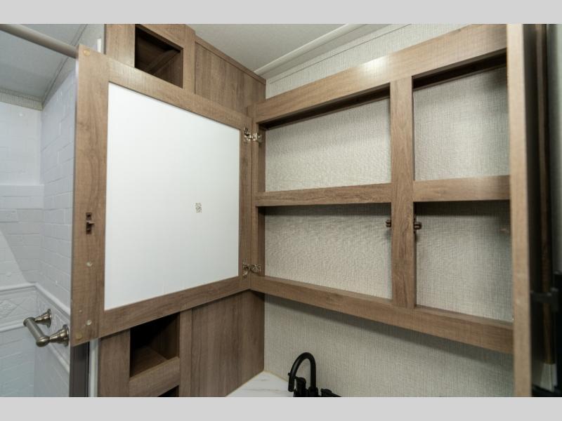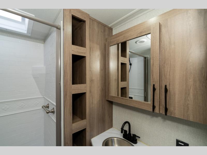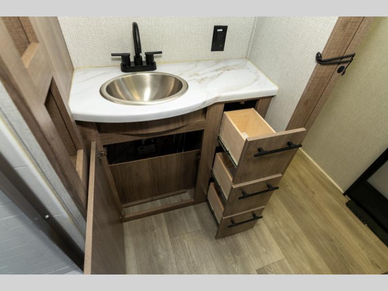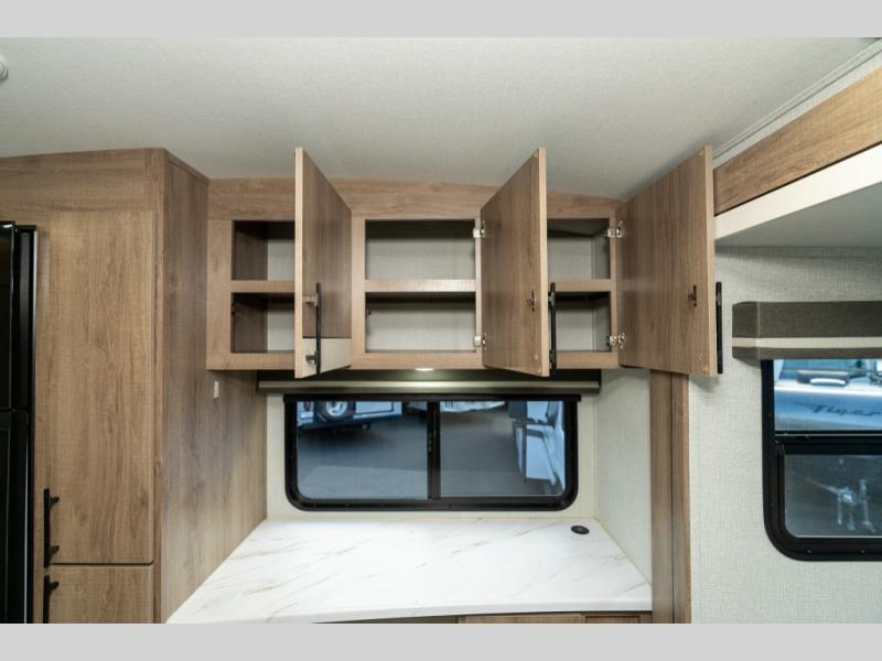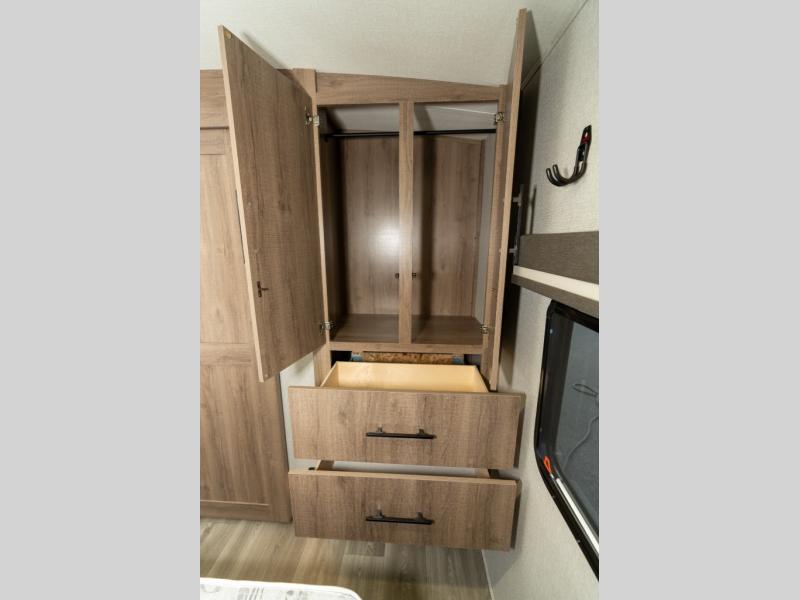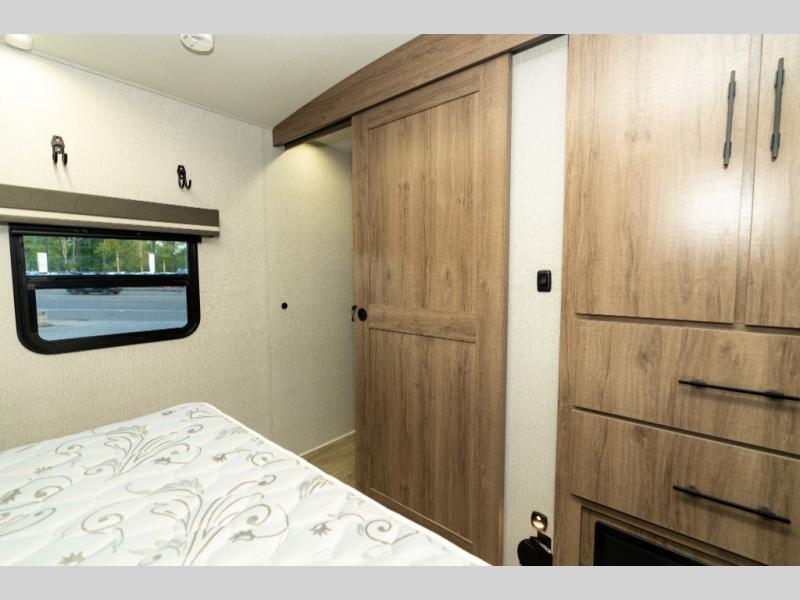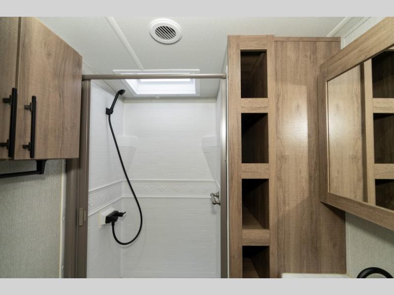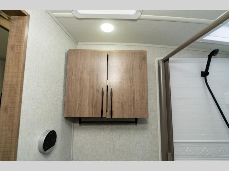 With this Imagine travel trailer, you can work while you're on the road because it offers you a desk in the main living area. You won't have to miss out on the action since you'll be right next to the booth dinette and tri-fold sofa, and there is even a pantry directly to the left of the desk for you to grab a quick snack while you're working. Once you're done with work, you can relax on the tri-fold sofa while you watch the telescoping 40" LED HDTV, and the private bedroom offers you a 60" x 80" queen bed to rest on when you're ready to call it a night.