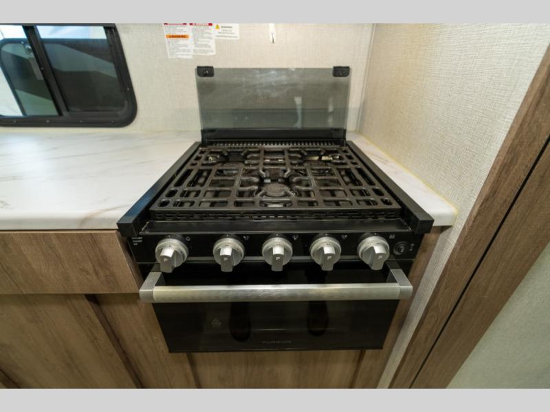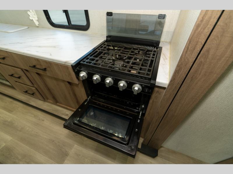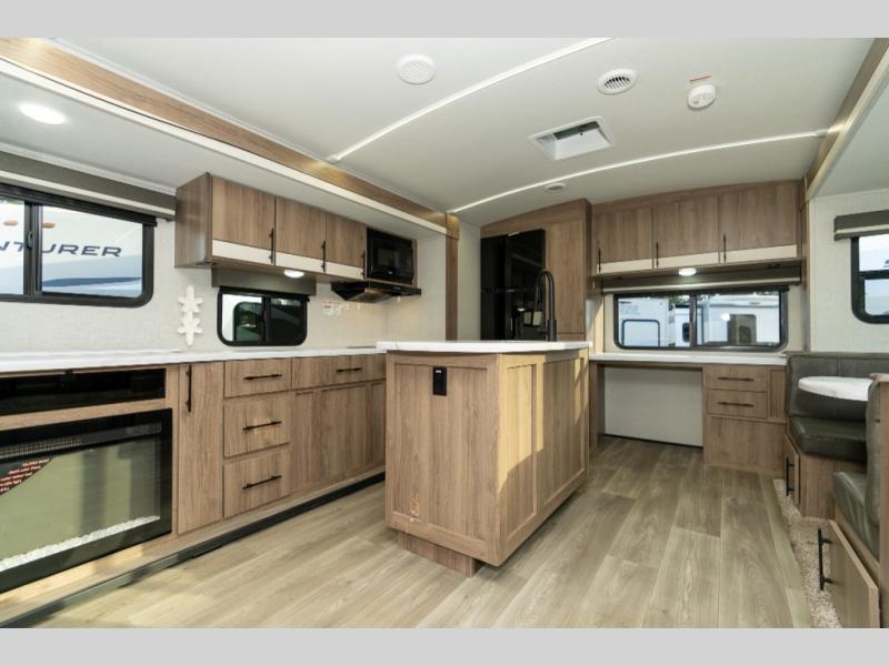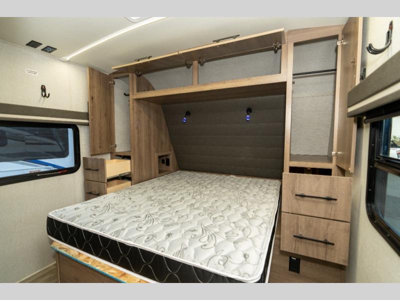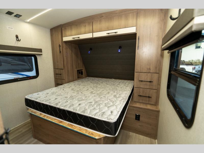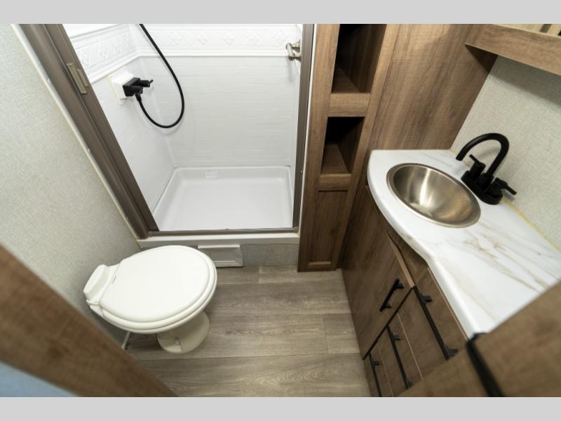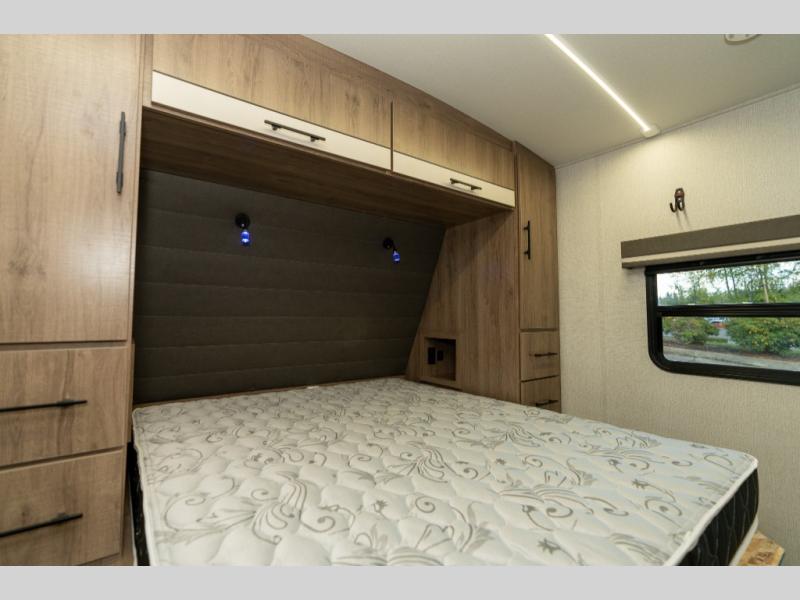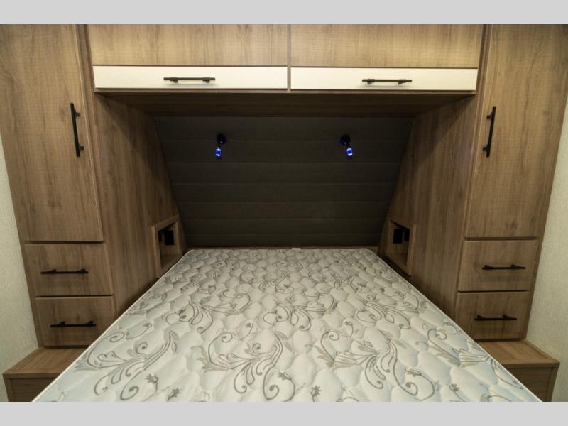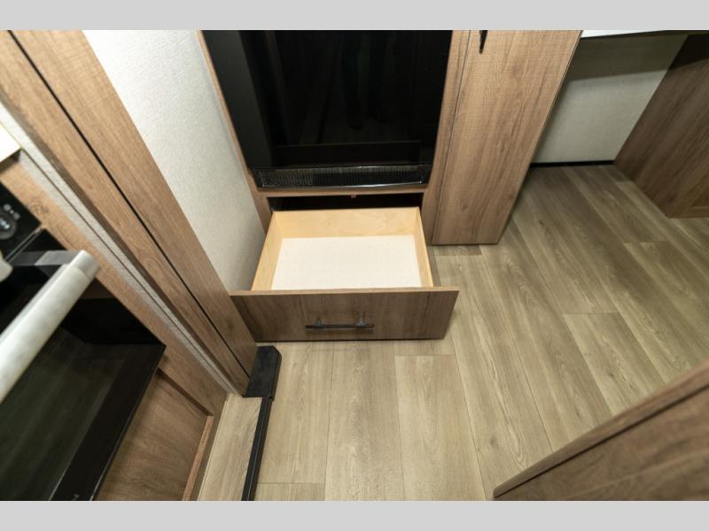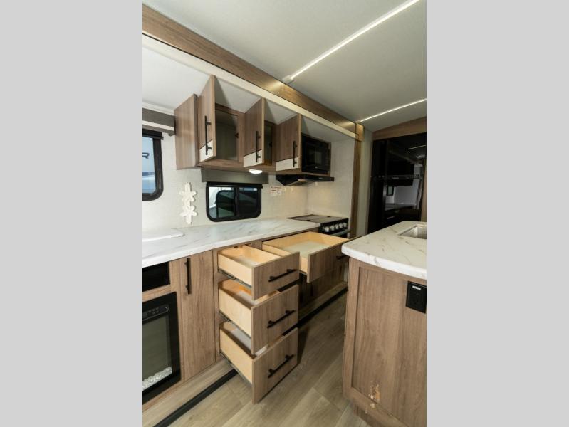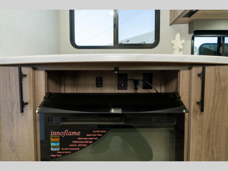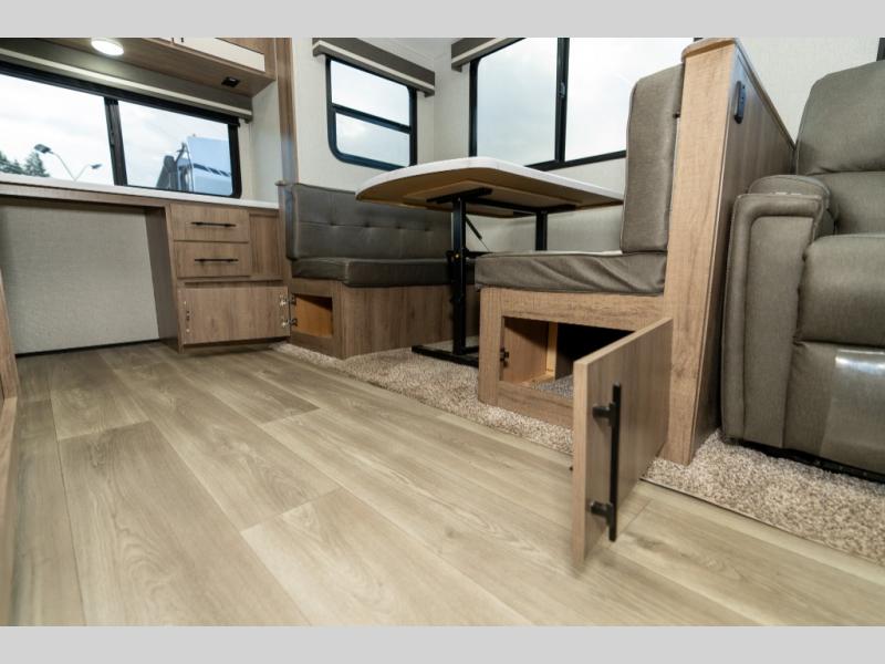 With this Imagine travel trailer, you can work while you're on the road because it offers you a desk in the main living area. You won't have to miss out on the action since you'll be right next to the booth dinette and tri-fold sofa, and there is even a pantry directly to the left of the desk for you to grab a quick snack while you're working. Once you're done with work, you can relax on the tri-fold sofa while you watch the telescoping 40" LED HDTV, and the private bedroom offers you a 60" x 80" queen bed to rest on when you're ready to call it a night.