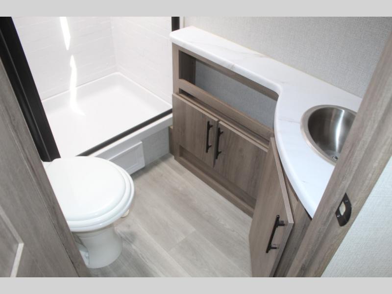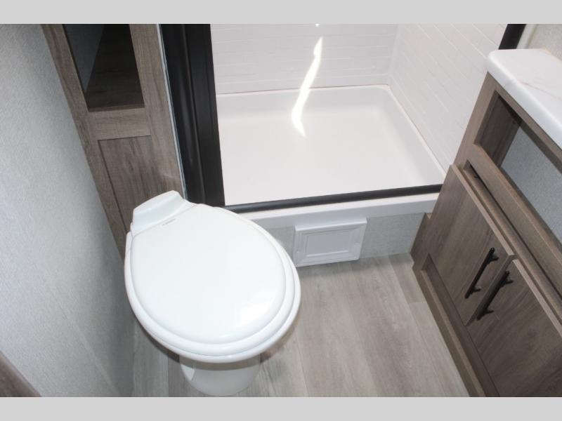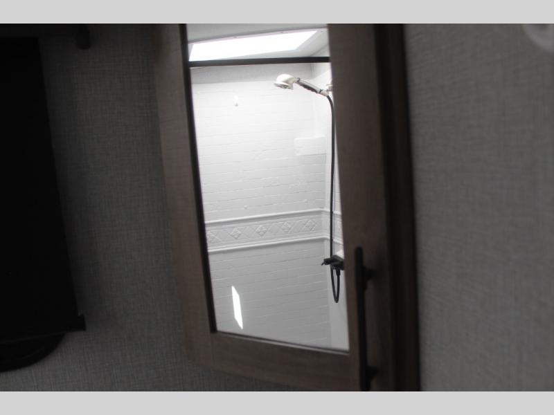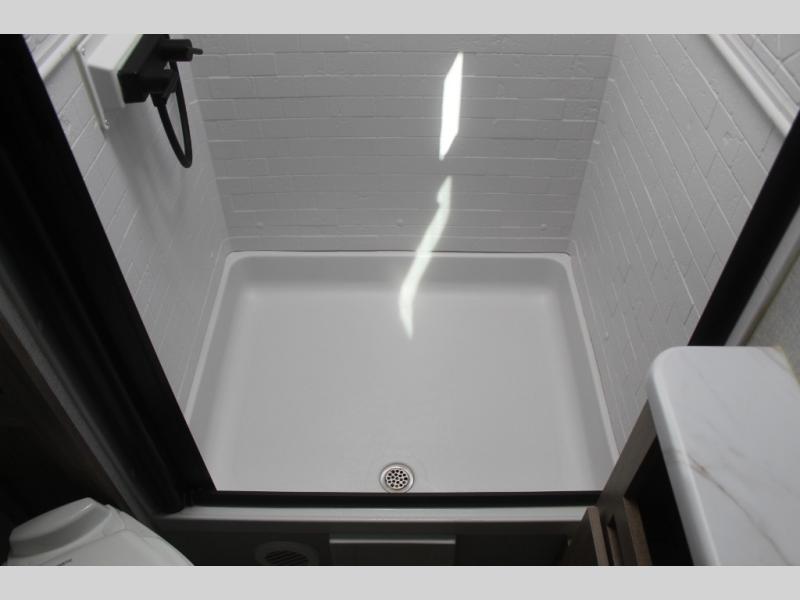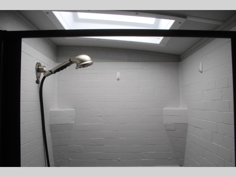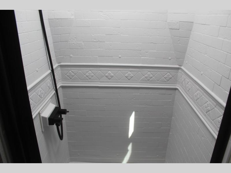 What I liked most: Bunk area area lifts up for additional storage which is very unique. Place for shoes. The bathroom shower surround has a brick molded design look.