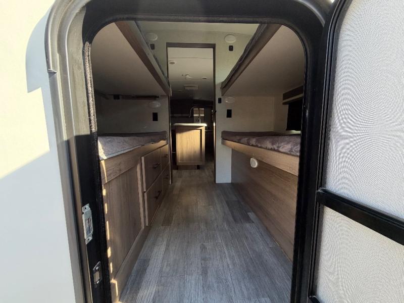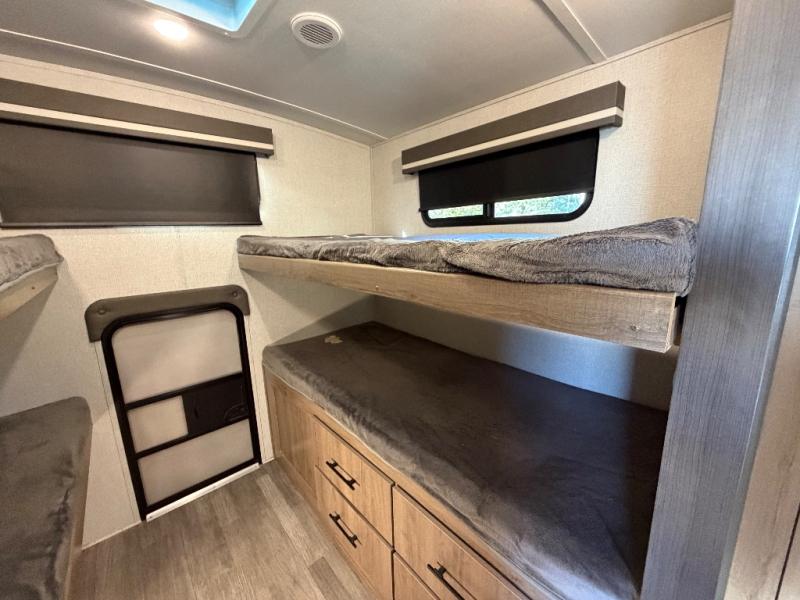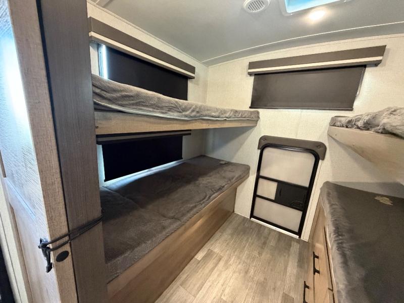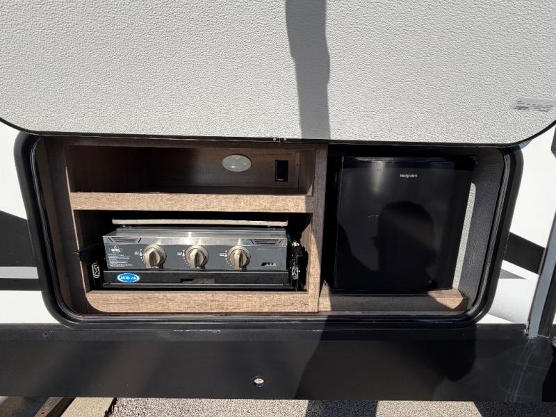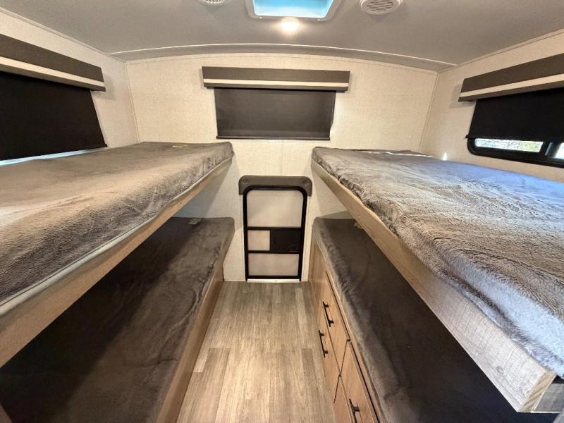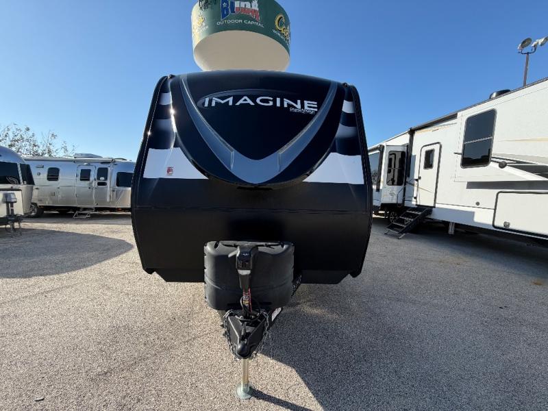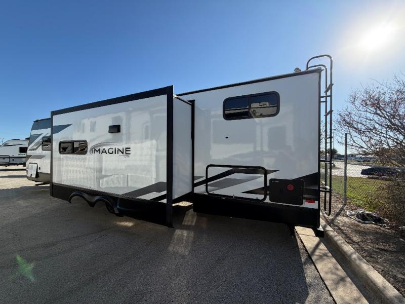 A great travel trailer for larger families or those that enjoy traveling with a few friends! This Imagine quad bunk model features two private bedrooms, with the master up front including a private entry/exit door just beyond a spacious walk-through bathroom that features a 30" x 36" shower with skylight to bring in more natural lighting each day, plus a toilet, sink and linen storage. In the kitchen, a nice island for food prep and cleaning up makes it easy to be part of the conversation in the room while you get meals ready for everyone. Speaking of food prep, how about the outside griddle and 1.6 cu. ft. refrigerator which is perfect for cooking outside, or for making late night snacks when all are enjoying the evening under the stars or in lawn chairs under one of two 9' 6" awnings with LED lighting. Your kids can bring along extra guests with the added sleeping that a quad bunk model provides. And, there is plenty of storage in the private bunkroom with drawers beneath for their things, plus a rear baggage door that is 42" x 22" for even more storage space for extra toys and gear.