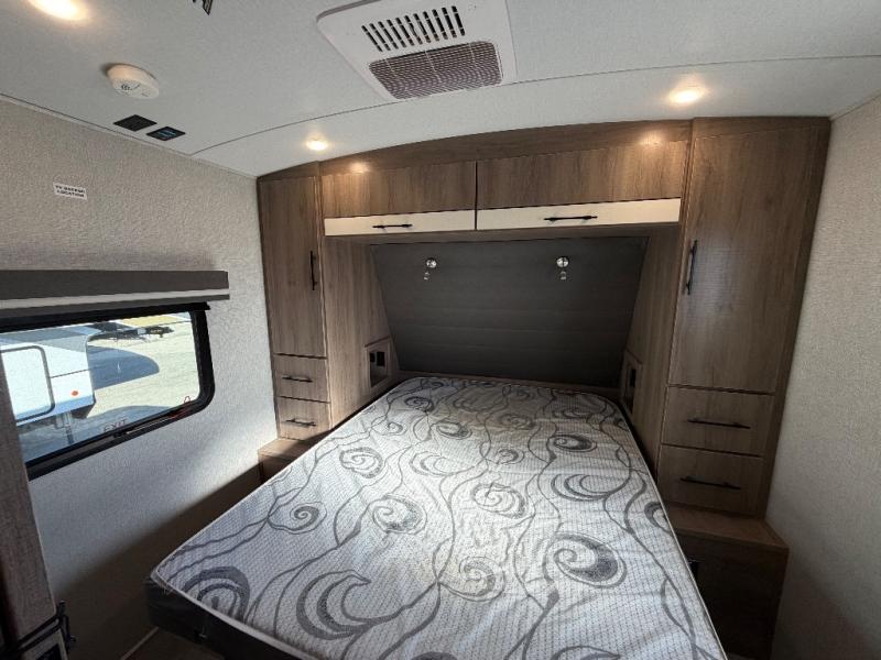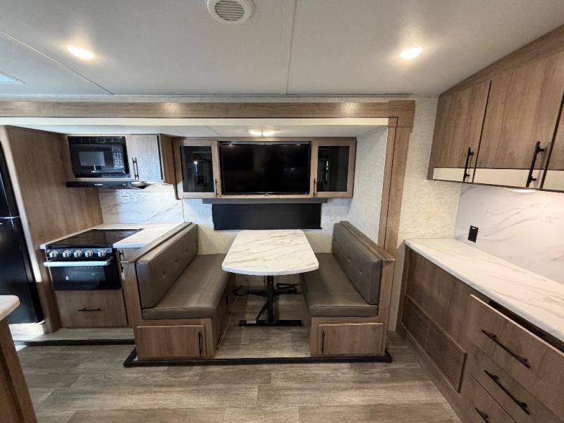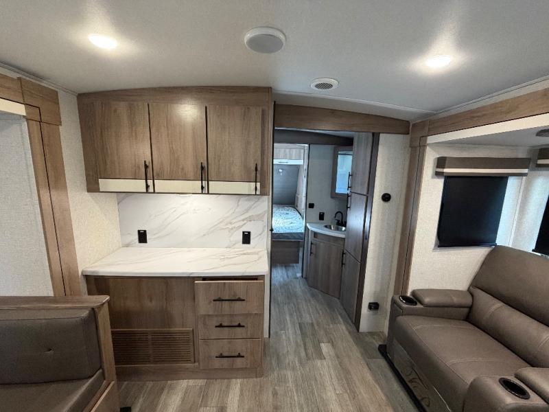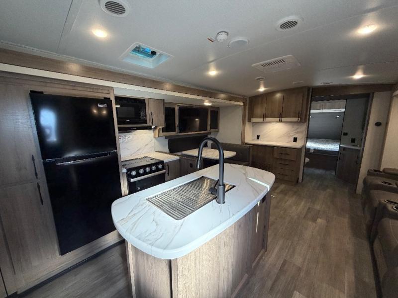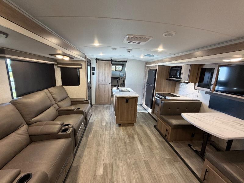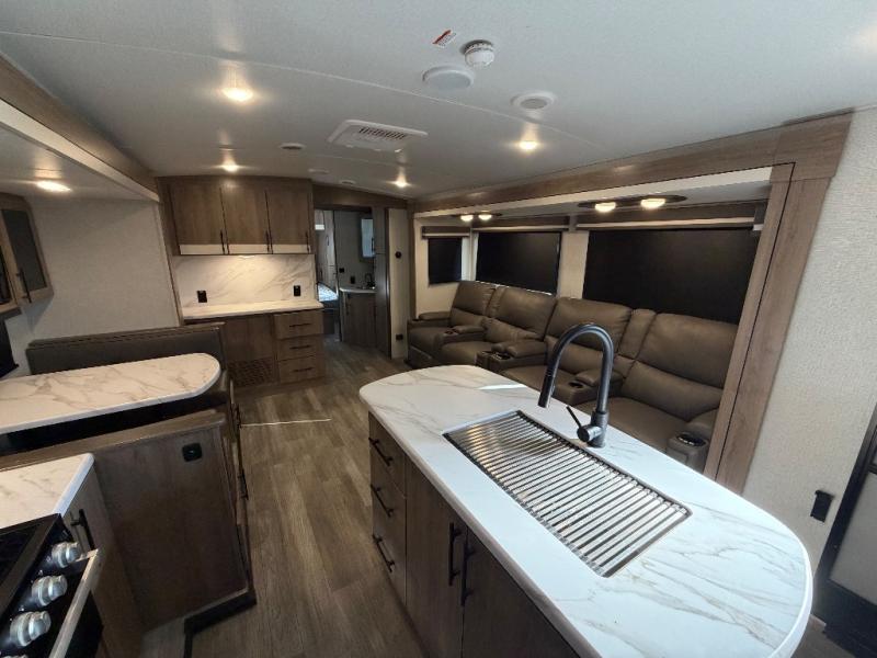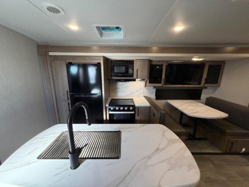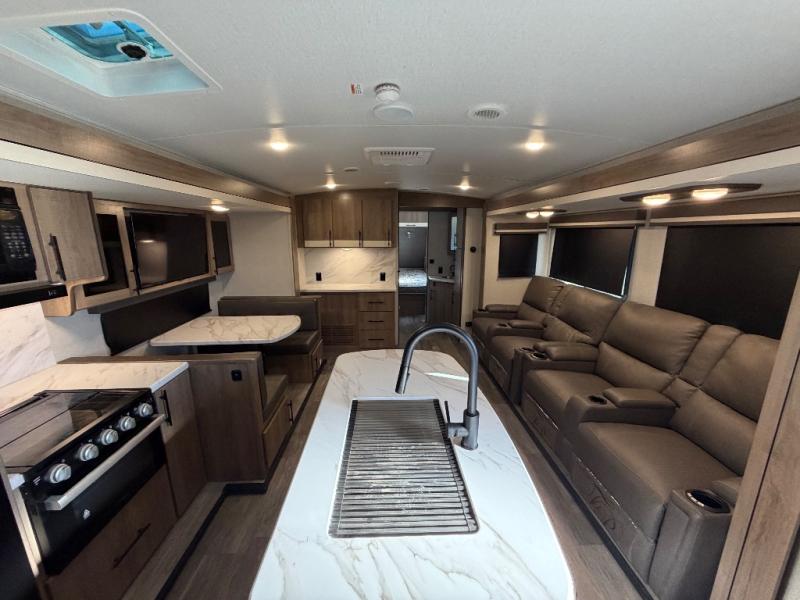 A great travel trailer for larger families or those that enjoy traveling with a few friends! This Imagine quad bunk model features two private bedrooms, with the master up front including a private entry/exit door just beyond a spacious walk-through bathroom that features a 30" x 36" shower with skylight to bring in more natural lighting each day, plus a toilet, sink and linen storage. In the kitchen, a nice island for food prep and cleaning up makes it easy to be part of the conversation in the room while you get meals ready for everyone. Speaking of food prep, how about the outside griddle and 1.6 cu. ft. refrigerator which is perfect for cooking outside, or for making late night snacks when all are enjoying the evening under the stars or in lawn chairs under one of two 9' 6" awnings with LED lighting. Your kids can bring along extra guests with the added sleeping that a quad bunk model provides. And, there is plenty of storage in the private bunkroom with drawers beneath for their things, plus a rear baggage door that is 42" x 22" for even more storage space for extra toys and gear.