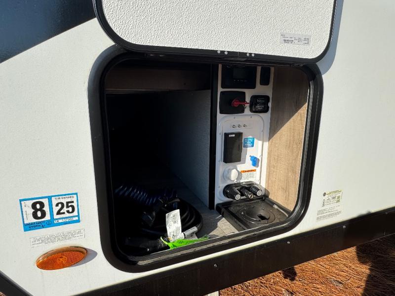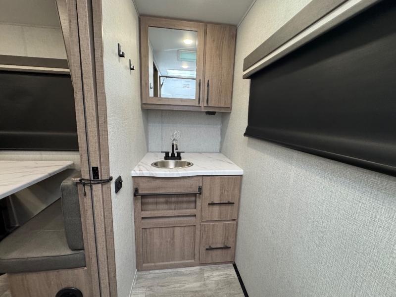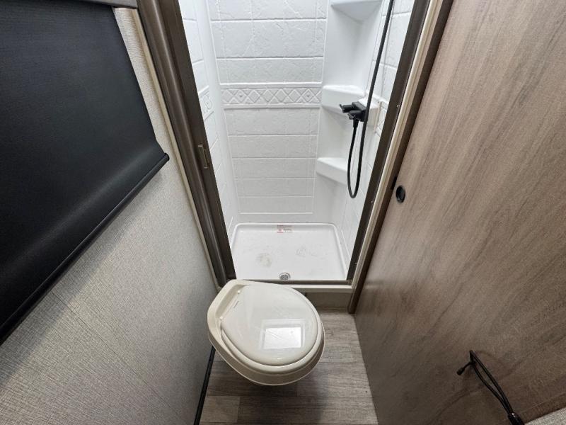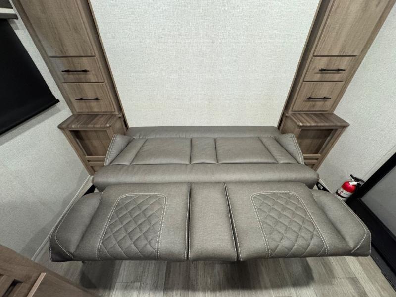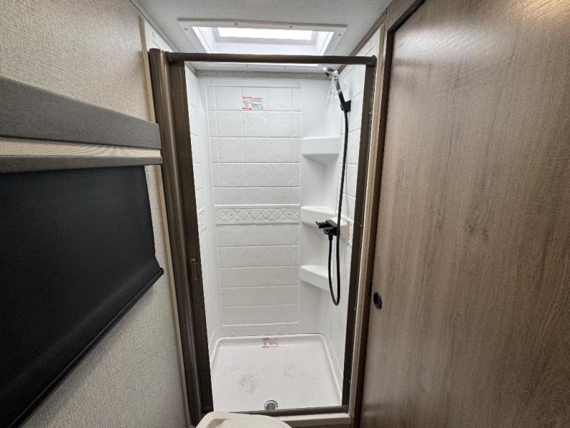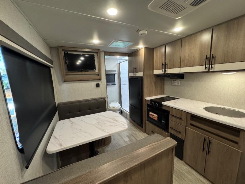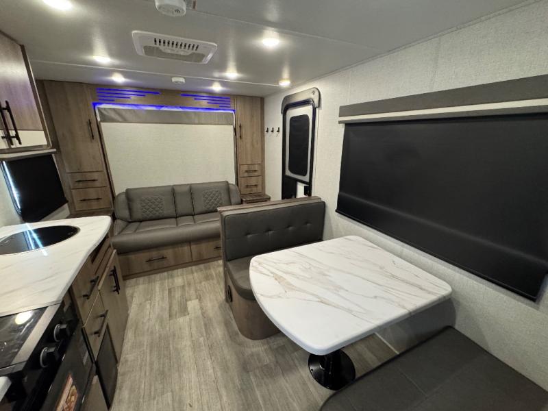 Start looking for your favorite campground to take this travel trailer to! After a fun day at the beach, you can rinse the sand out of your hair with the walk-in shower with a skylight in the full rear bathroom. Depending on what time you enter the unit will determine whether you see the Murphy bed or sofa with drawers underneath and wardrobes on either side of it. The booth dinette is not only great for enjoying meals prepared with the two burner cooktop or outside griddle, but also for transforming into an extra sleeping space!