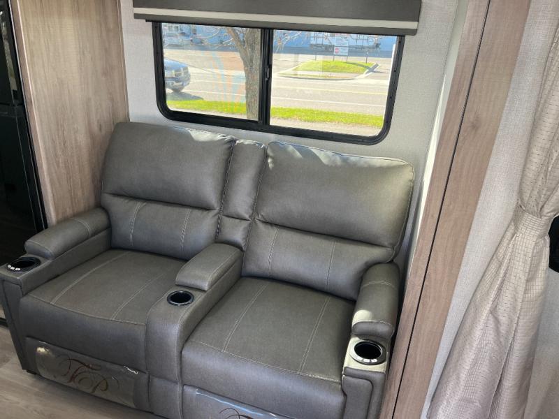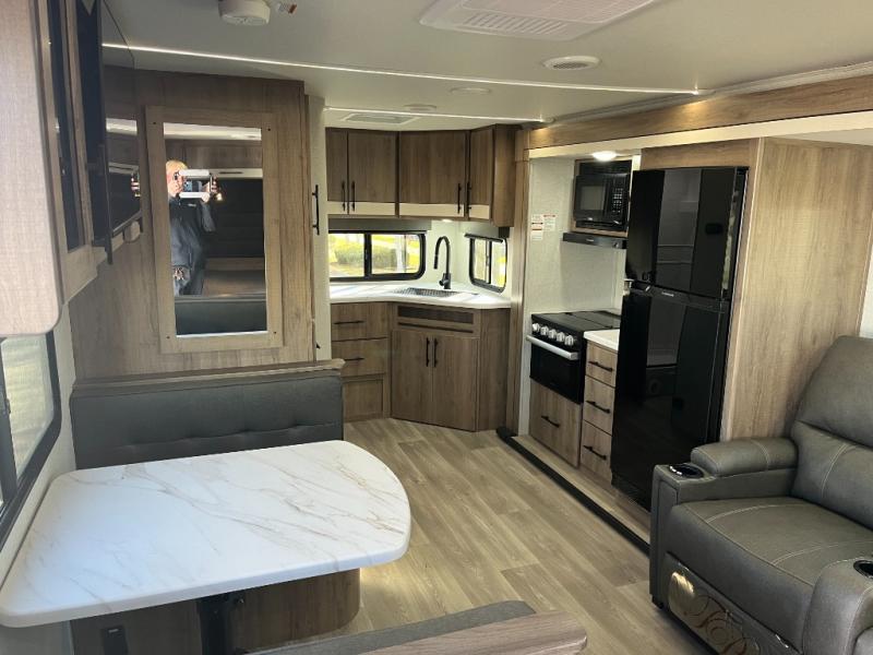 This Imagine XLS travel trailer has theater seating and a booth dinette that you can use any time you need a little break from the outdoors. If you want to come in and grab a coffee, put together a puzzle, or work on your itinerary for the week, just put up your feet and relax. You could even switch on the LED HDTV if you want a little entertainment. The front queen-size bed has a privacy curtain that you can draw to create a semi-private bedroom, and in the back of the trailer you will find the rest of your amenities, like the kitchen and the bathroom. The large slide makes it easy to enjoy spending your time indoors, but if you do want to get back outside, you can sit underneath the 18' electric awning for some shade.