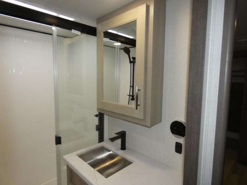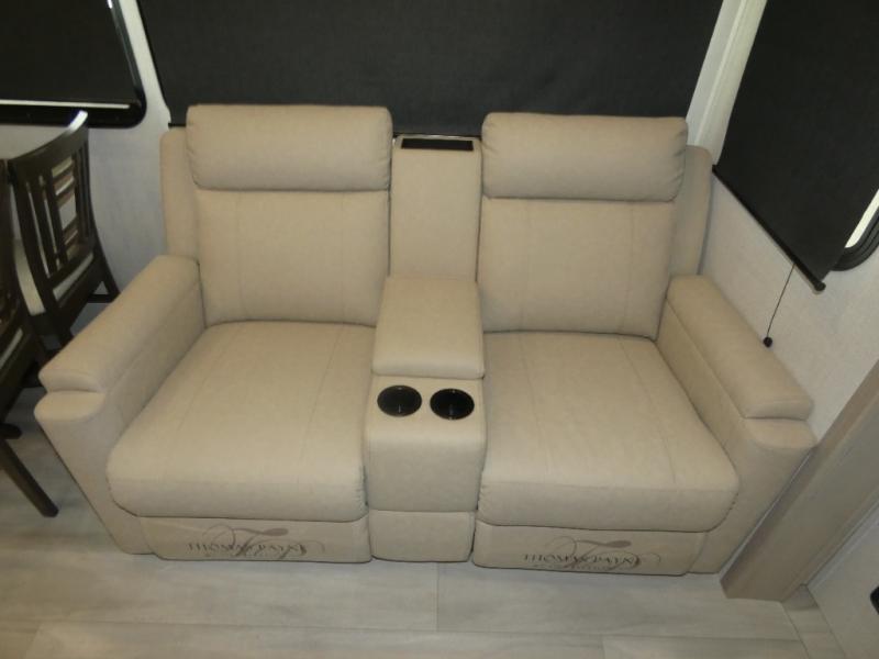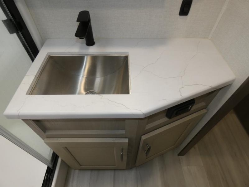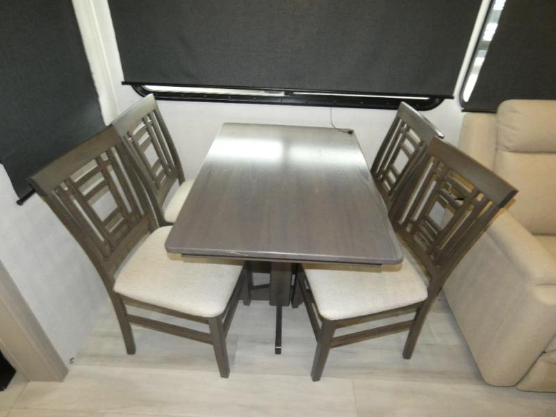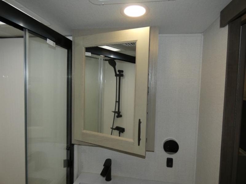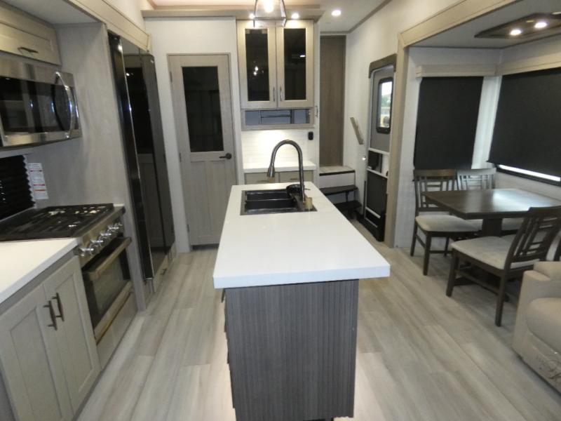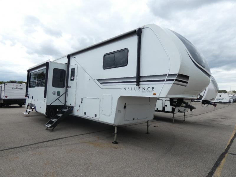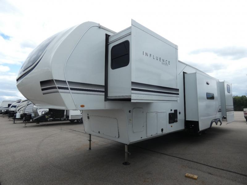 Any Grand Design Influence fifth wheel features five-sided aluminum cage construction with a walk-on roof and a fully enclosed underbelly with heated tanks and storage for all weather camping. For peace of mind, the MORryde CRE3000 Suspension system and ABS braking system will provide safe and smooth towing, and the 101" widebody construction offers all the room you need and that is before multiple slides are fully engaged. You will appreciate the keyed alike locks, slam-latch baggage doors with magnetic door catches, exterior security light, and solid surface entry steps. On the inside, Congoleum flooring, premium roller shades for privacy, a hallway handrail for safety, and nightstands with USB ports to keep all of your electronics fully charged. You will also love the On Demand tankless water heater when showering, plus the added heat and ambiance from an electric fireplace, and so much more!