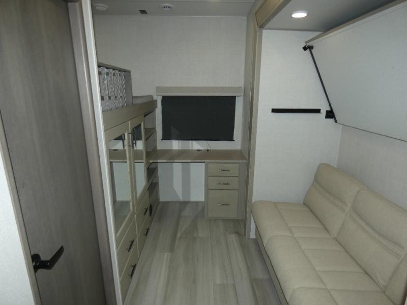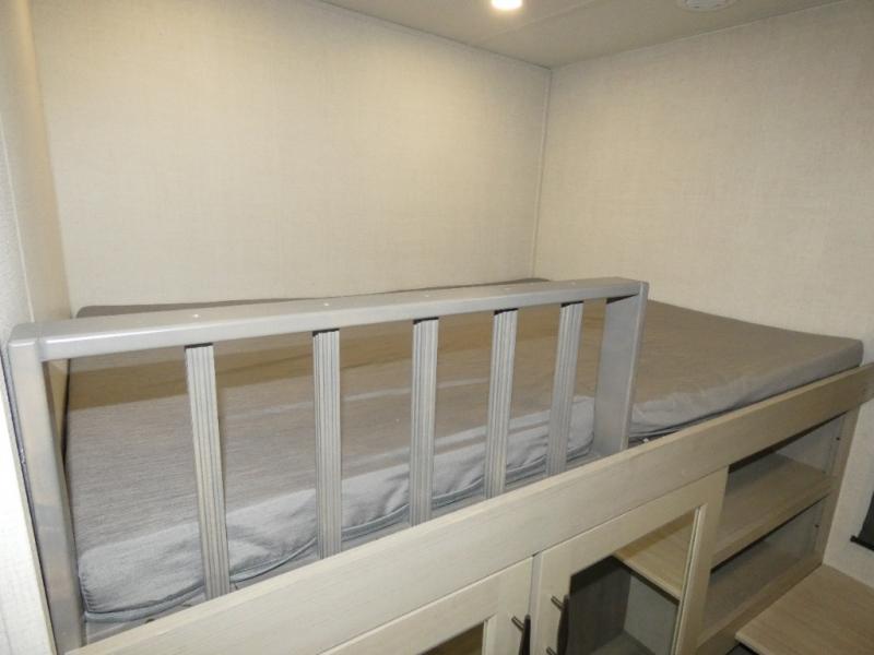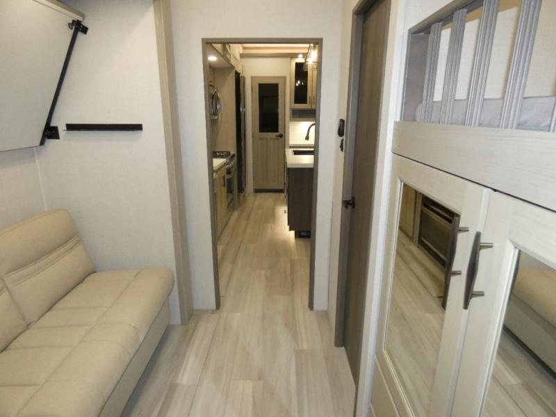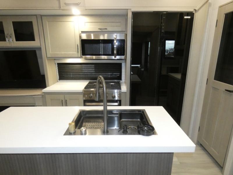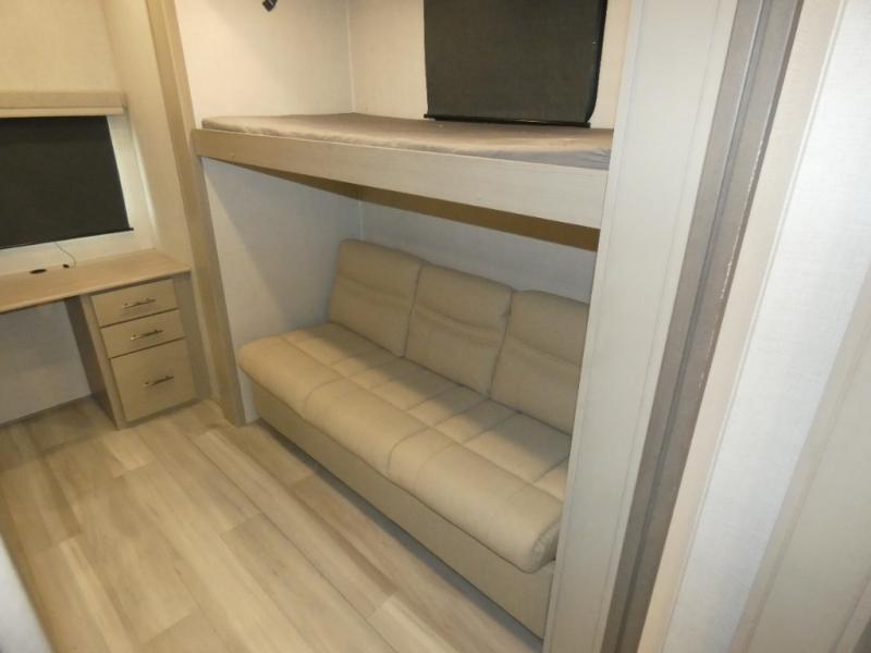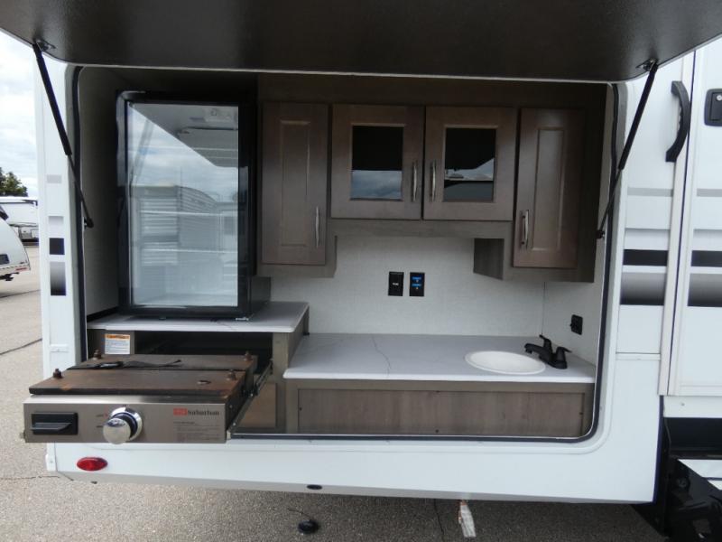 Grab the whole gang and head out in this fifth wheel featuring a private bunkhouse that sleeps five. This unit also features dual entry doors for added convenience with one set leading into a half bath, and quad slides for even more space in this widebody layout. The combined kitchen and living area featuring dual opposing slides offer space to dine and relax including theater seating for two opposite the entertainment center and fireplace. The chef in your group will appreciate the amenities for dreaming up dishes to feed everyone, and the outside griddle, sink and beverage cooler provides even more options.