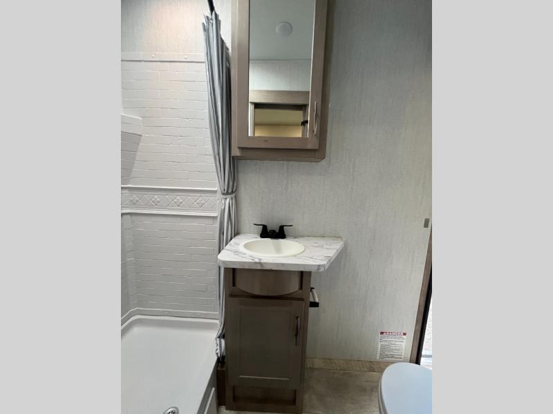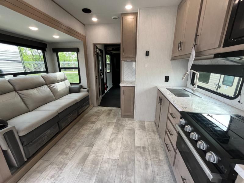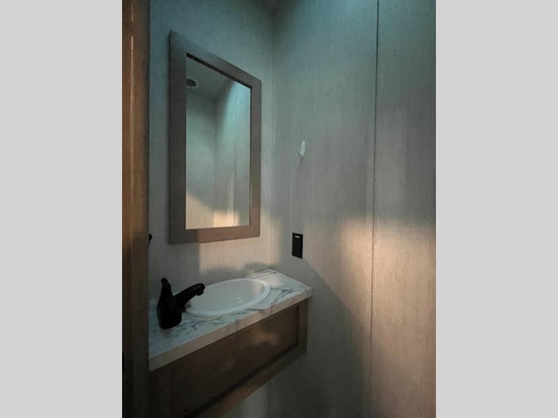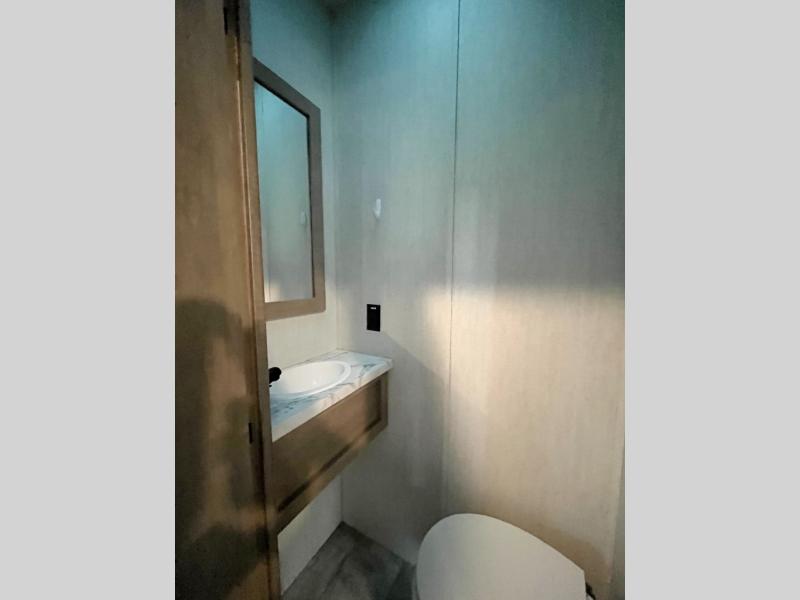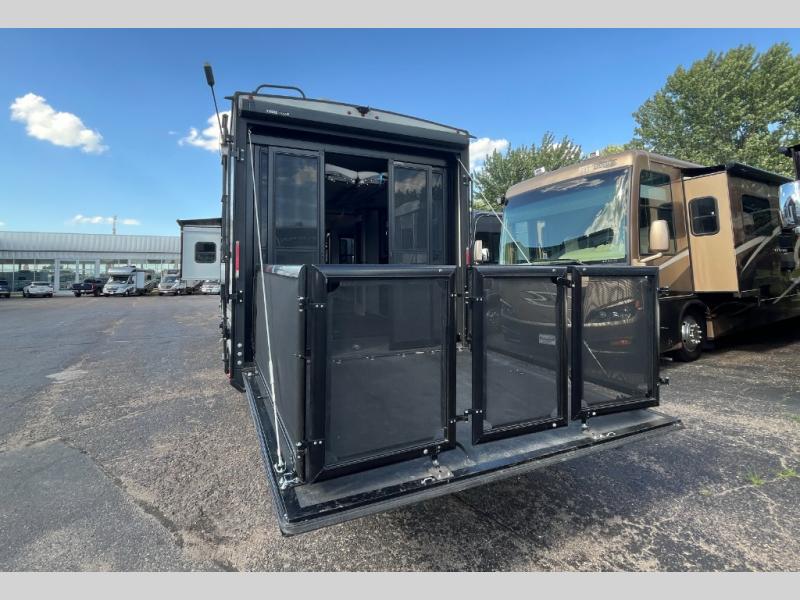 Start your engines for a fun weekend with your toys and your family in this Momentum G-Class toy hauler. The 11' separate garage includes Happi-Jac rollover sofas with a table and an optional top bed, plus a half bath! There is even a second entry door which leads directly into the garage so that you don't have to walk through the entire trailer just to get to your cargo. Now that's helpful! In the front of this unit, you will have your own master suite that has private access to the residential walk-in shower in the dual-entry bathroom. The main living and kitchen area offers everything you need and would want, plus more. This is the one!