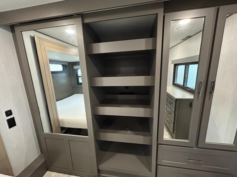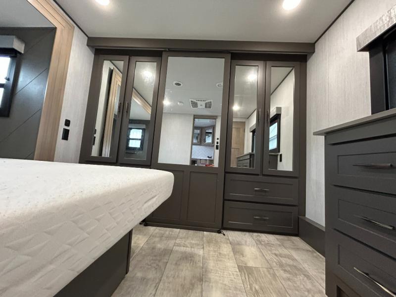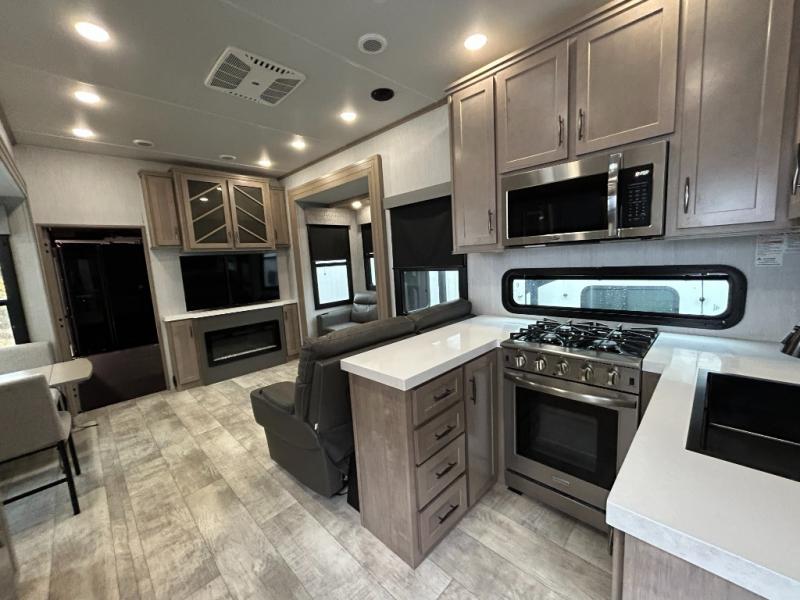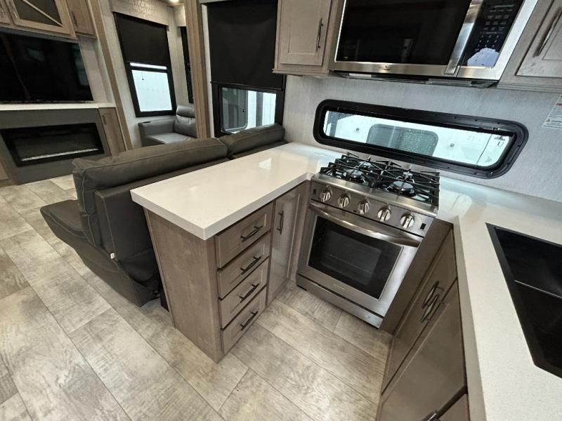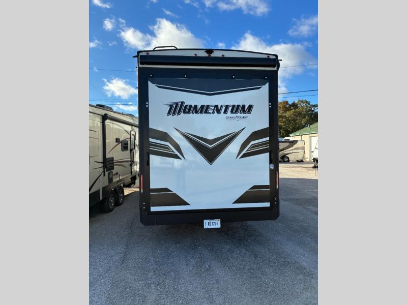 With any Momentum M-Class toy hauler by Grand Design, you will enjoy luxury at every turn! They have been constructed to a superior standard with a thermal roof design, triple insulated main floor and garage floor, and a Rail-Tite underbelly seal that will allow you to camp in all elements. Each model also features a, 8' 5" wide body chassis with a wide rail design, no wheel wheels, and a dovetail entry for easier loading. The Stealth A/C system provides maximum cooling power, and the CRE3000 suspension system means you can enjoy a smooth tow each time. You will love the luxurious interior with a professional grade stainless steel cooktop, interior color changing LED accent lighting, a fiberglass shower with a glass door, and solid surface countertops.