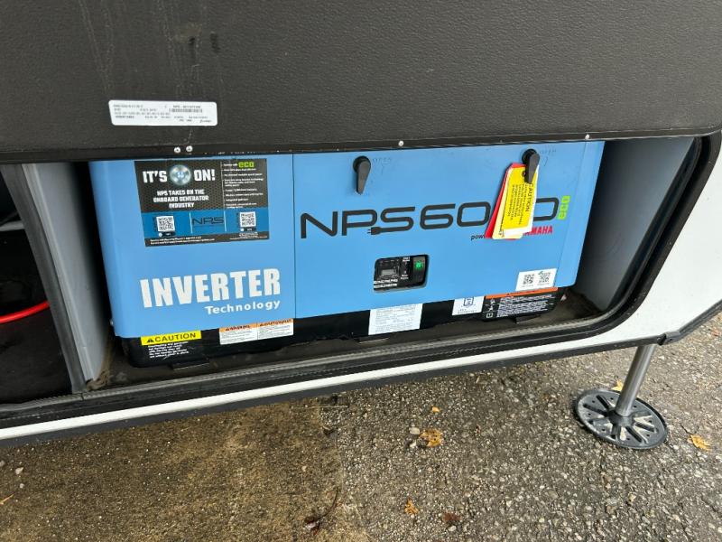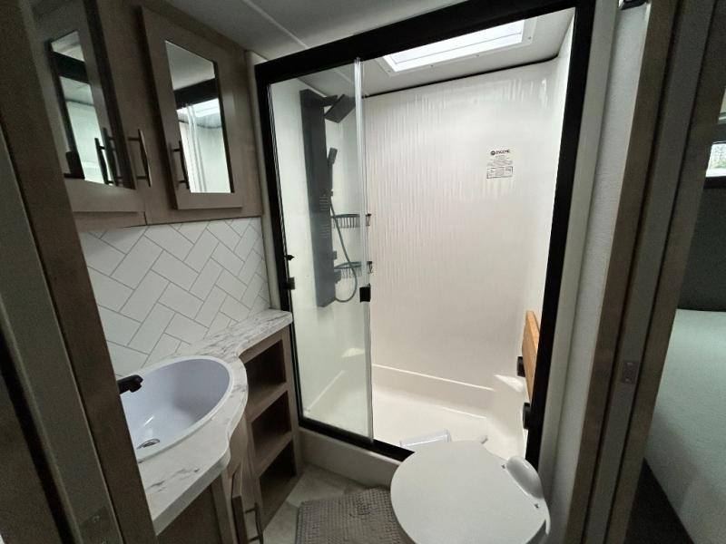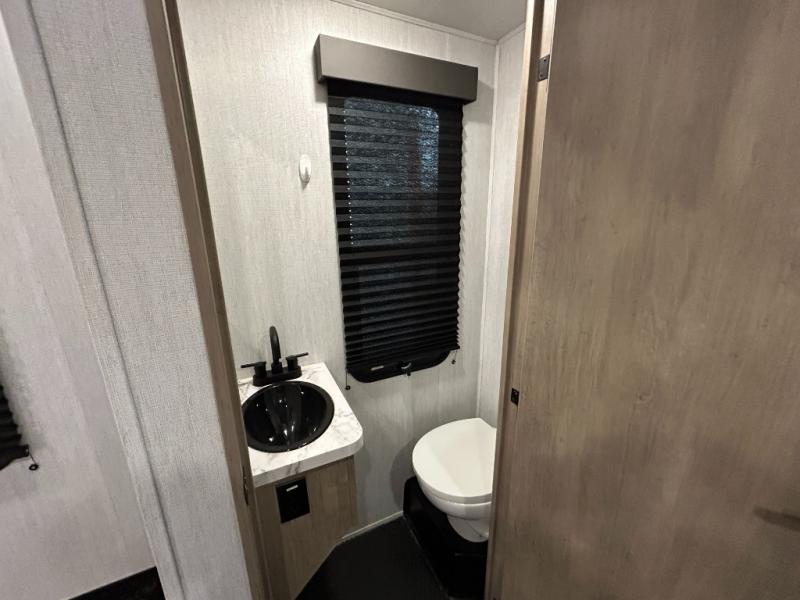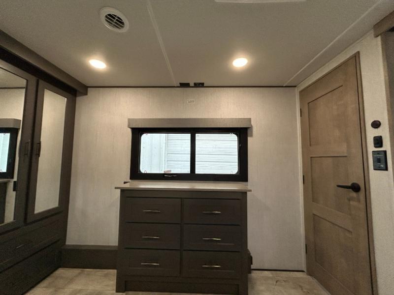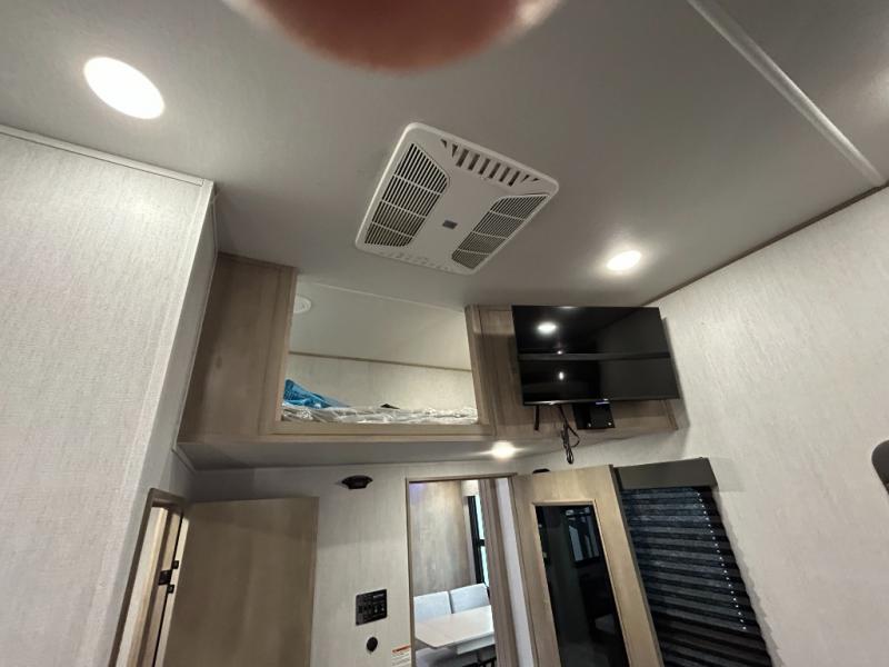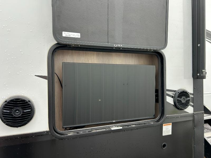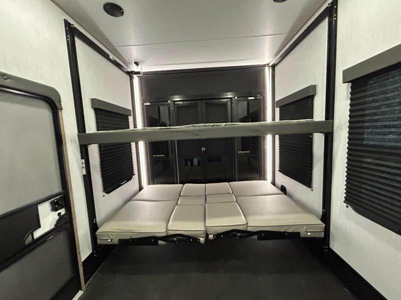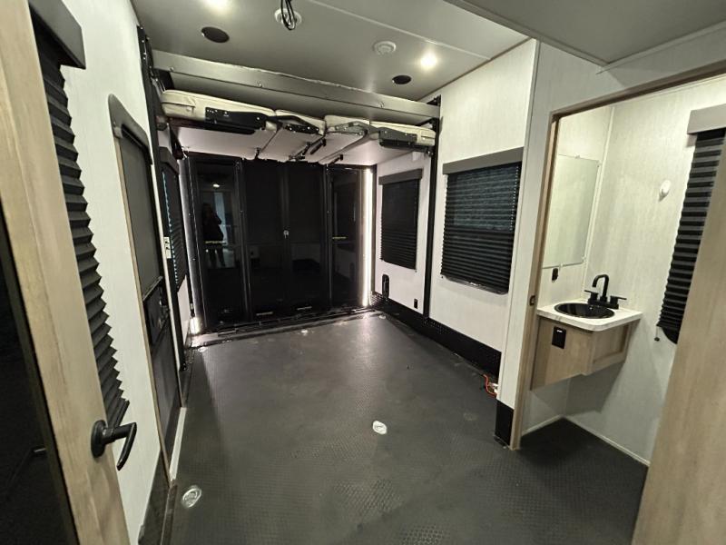 Any time spent in this spacious toy hauler will be time well spent! The 14' garage includes an overhead loft bed and a flip-up pet dish for your furry friends. If you're needing more sleeping space, you might want to choose the optional Happi-Jac rollover sofas and table with a drop down bed and optional half bath! Once you enter in the main living area, you can relax on the tri-fold sofa or theater seating across from the fireplace, and there is a free-standing dinette if you want to play a game or two. The chef of your group will love the generous counter space in the kitchen, and the dual entry bath will let everyone stay clean throughout your trip! Head to the front master bedroom to enjoy the queen bed slide out with an optional king bed, a slide top dresser with TV prep, plus a large front closet, complete with washer and dryer prep!