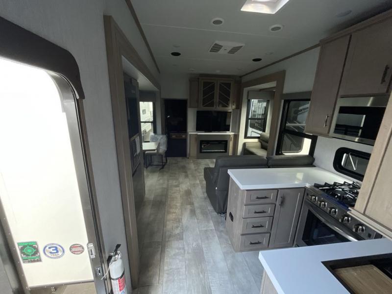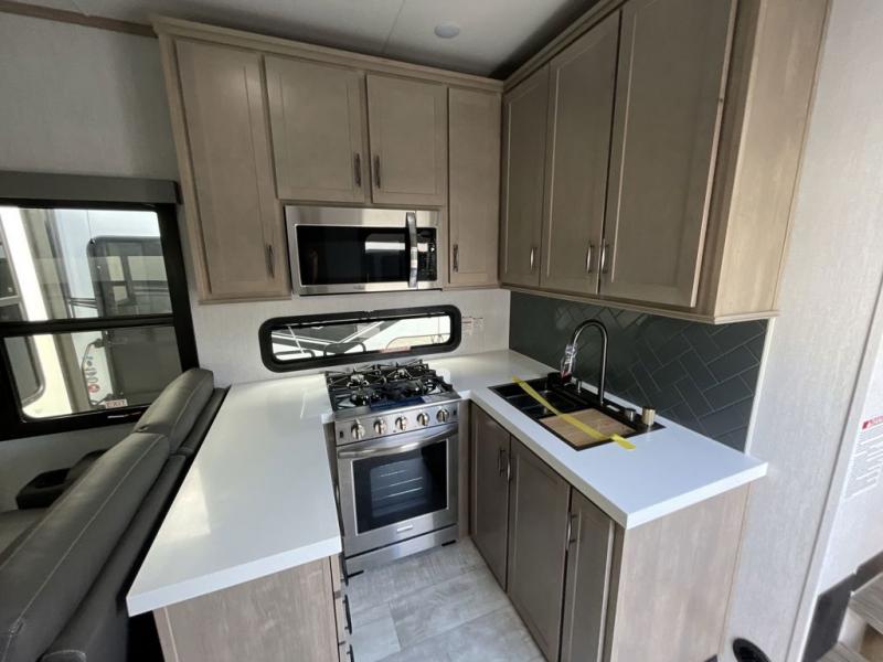 Inside, the main living area is built for relaxation and entertainment. Theater seating and a tri-fold sofa face the fireplace, while a free-standing dinette offers the perfect spot for meals or games. The U-shaped kitchen with ample counter space and a pantry makes meal prep a breeze, whether it’s a quick breakfast or a full dinner for your group.