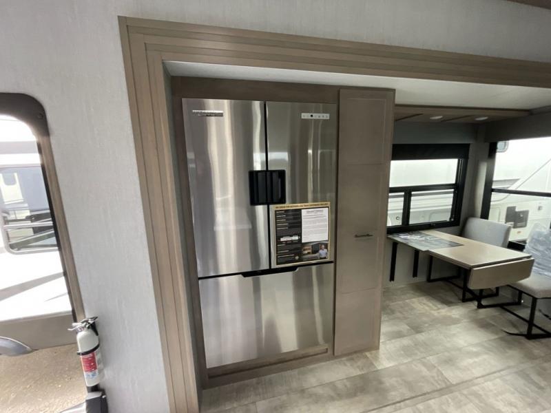 The Momentum M-Class toy hauler by Grand Design is engineered for all-season adventures. With a triple-insulated floor and garage, thermal roof design, and Rail-Tite underbelly seal, you can enjoy comfort no matter the weather. The dovetail entry and wide rail design make loading and unloading a breeze, while professional-grade finishes and premium appliances bring luxury to your campsite.