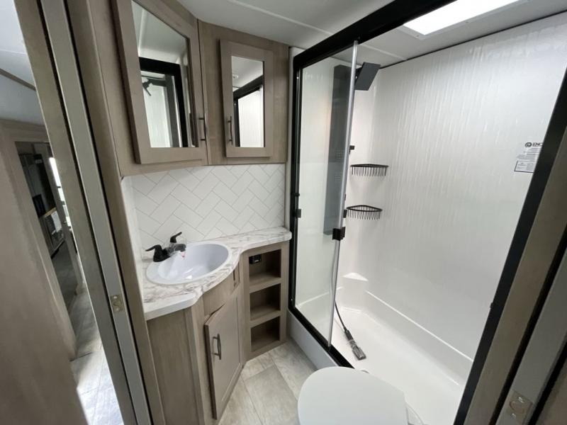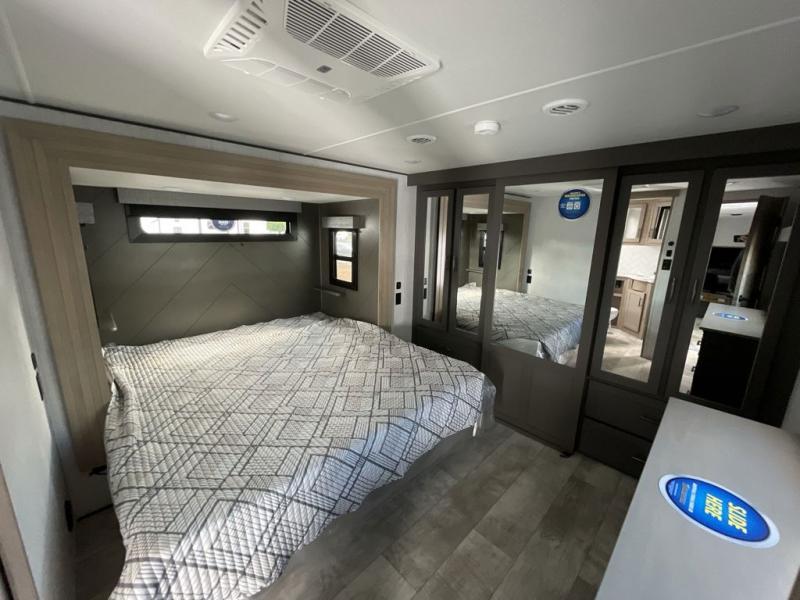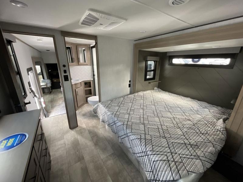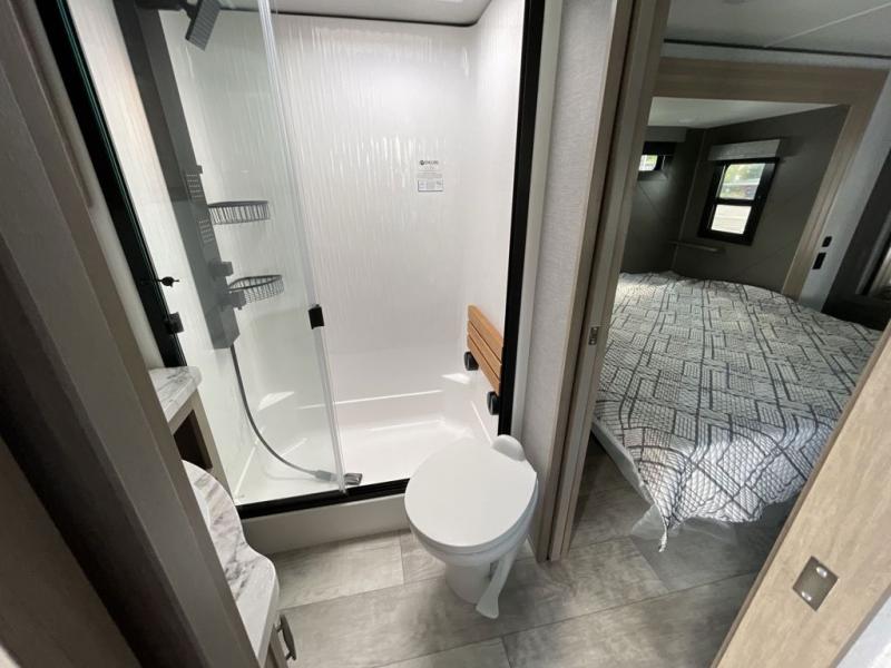 Retreat to the front master bedroom featuring a queen bed slide out (optional king available), a slide-top dresser with TV prep, a large front closet, and washer/dryer prep. The dual-entry bathroom ensures everyone stays clean and comfortable throughout your adventure.