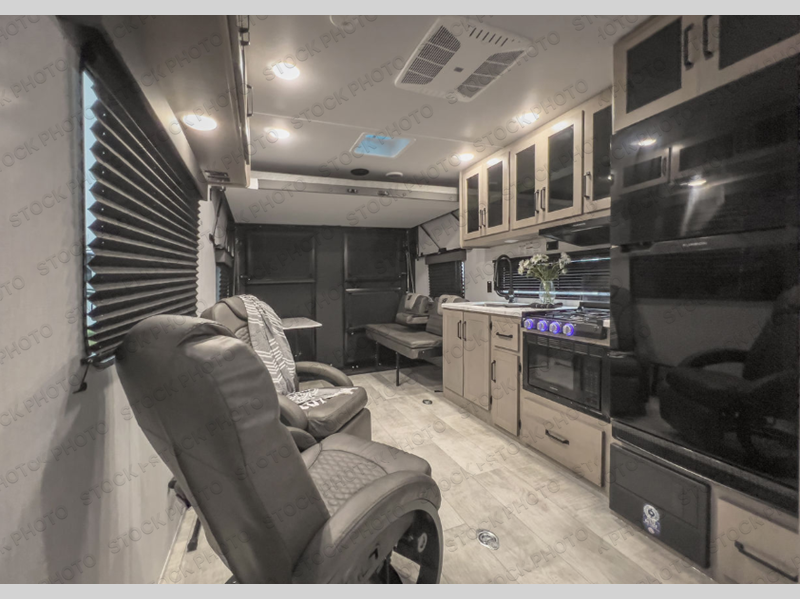 Head for the lake in this toy hauler that can sleep five campers each night. Your crew can relax on the rollover sofa with a table, and the top bed will be perfect for your guests to sleep on. The front corner queen Murphy bed includes drawers to store clothes, plus overhead storage for personal belongings. In the morning, you can prepare breakfast on the three burner range with an oven, pour yourself milk from the 12V 8 cu. ft. refrigerator, then relax on the dual Euro chairs. This model also includes a patio with a pull down screen to let fresh air in without letting the bugs in!
