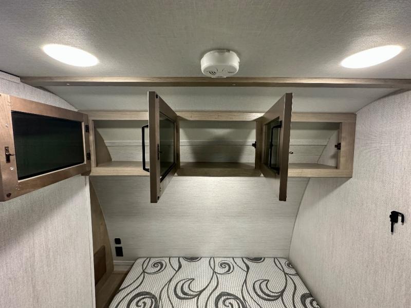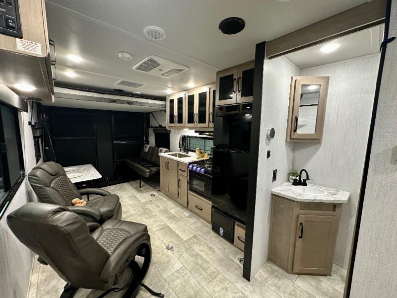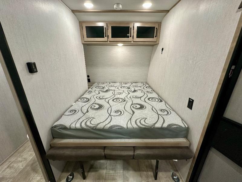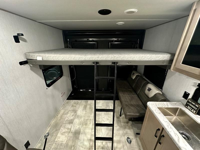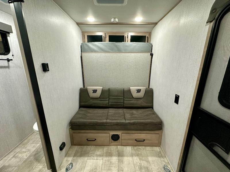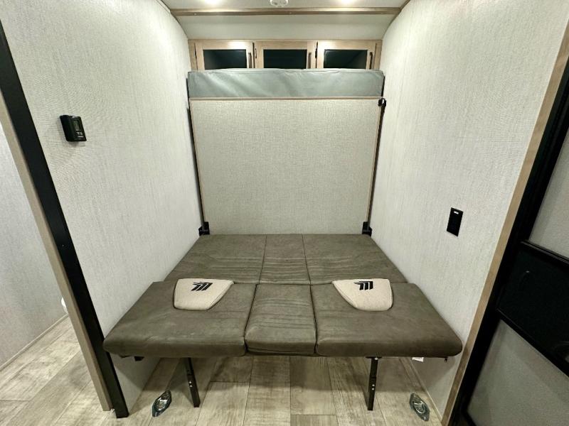Head for the lake in this toy hauler that can sleep five campers each night. Your crew can relax on the rollover sofa with a table, and the top bed will be perfect for your guests to sleep on. The front corner queen Murphy bed includes drawers to store clothes, plus overhead storage for personal belongings. In the morning, you can prepare breakfast on the three burner range with an oven, pour yourself milk from the 12V 8 cu. ft. refrigerator, then relax on the dual Euro chairs. This model also includes a patio with a pull down screen to let fresh air in without letting the bugs in!