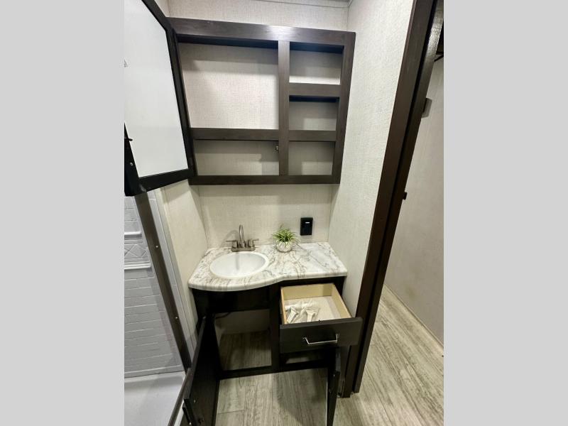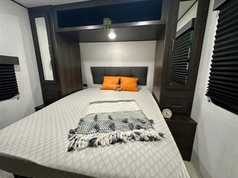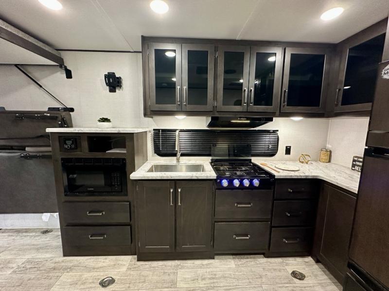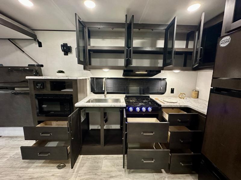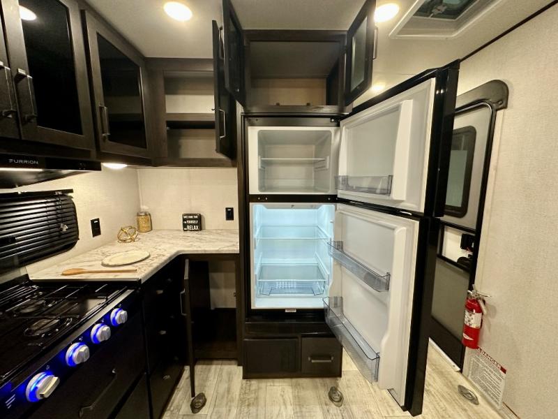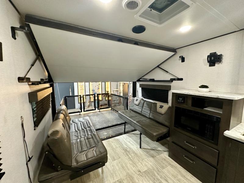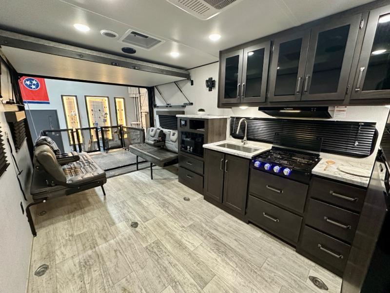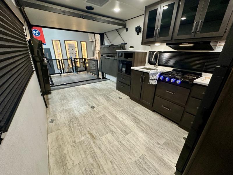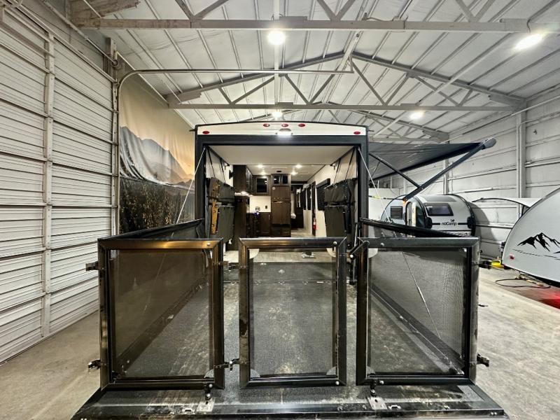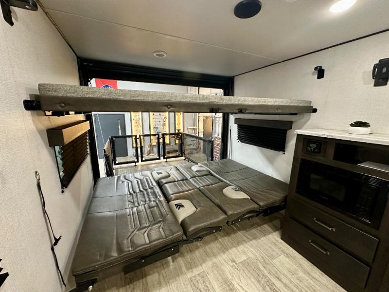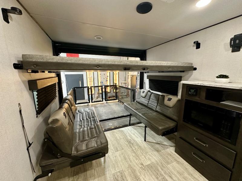 You will love this Momentum MAV toy hauler travel trailer! The front bedroom features a queen bed, and there is plenty of room to walk around. The sliding solid bedroom door helps with space. Overhead storage and a pair of nightstands are convenient storage, plus there is a wardrobe with both drawers and space to hang items. The kitchen offers a microwave, stainless steel sink, and an 8 cu. ft. 12V refrigerator. In the garage, you'll find rollover sofas with a table and a top bed for guests to sleep on. The ramp door/patio will provide additional living space once your toys are unloaded, and the pull down screen will keep bugs out!