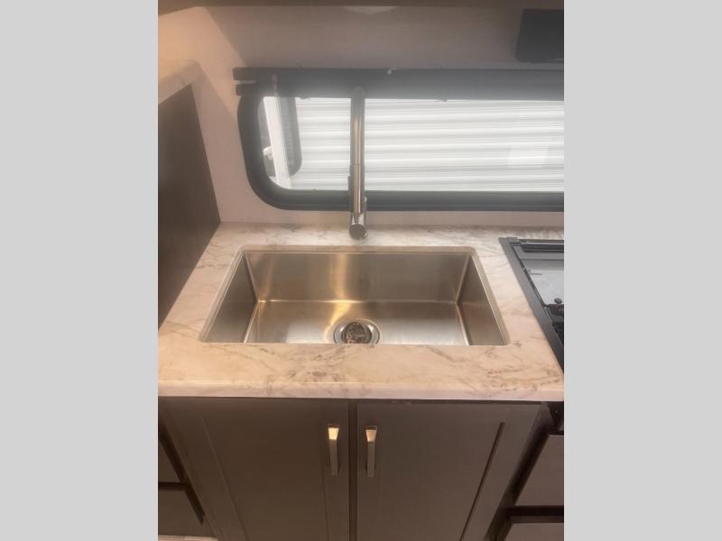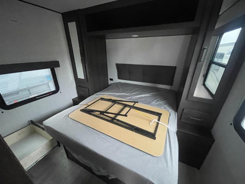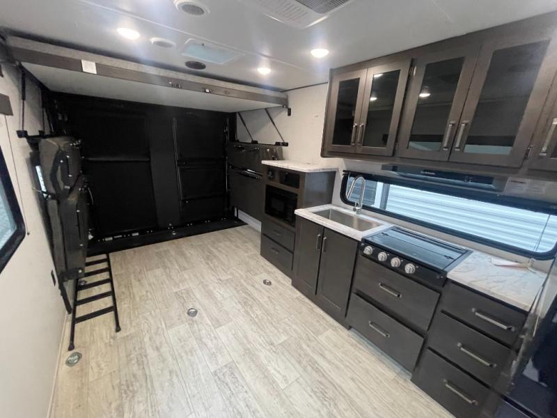 You will love this Momentum MAV toy hauler travel trailer! The front bedroom features a queen bed, and there is plenty of room to walk around. The sliding solid bedroom door helps with space. Overhead storage and a pair of nightstands are convenient storage, plus there is a wardrobe with both drawers and space to hang items. The kitchen offers a microwave, stainless steel sink, and an 8 cu. ft. 12V refrigerator. In the garage, you'll find rollover sofas with a table and a top bed for guests to sleep on. The ramp door/patio will provide additional living space once your toys are unloaded, and the pull down screen will keep bugs out!