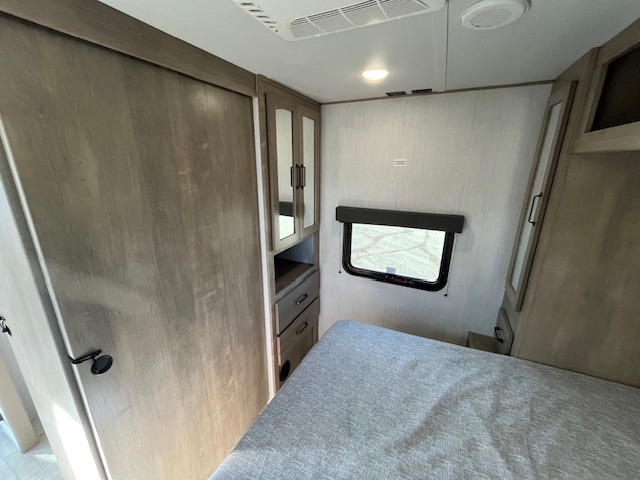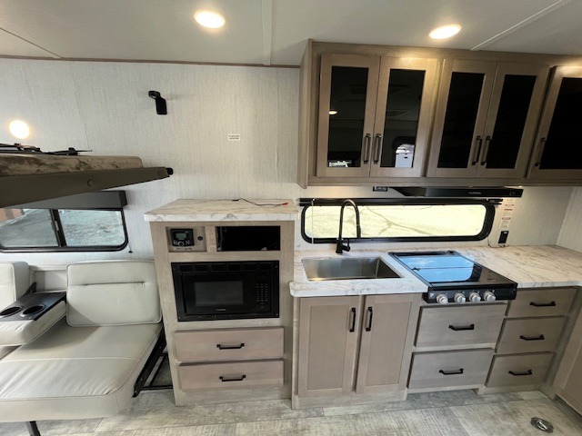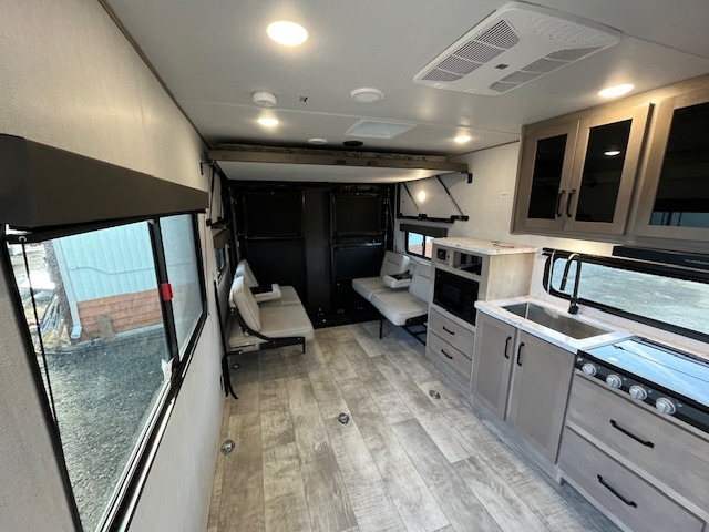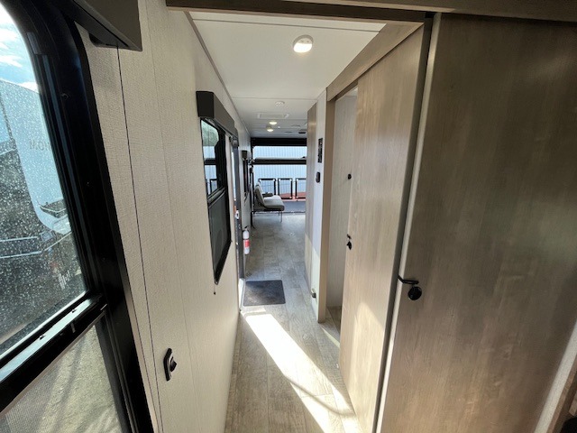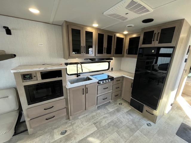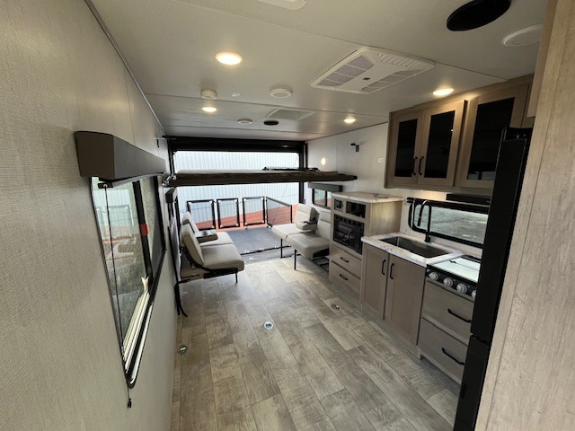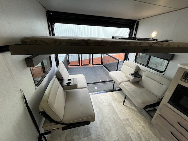You will love this Momentum MAV toy hauler travel trailer! The front bedroom features a queen bed, and there is plenty of room to walk around. The sliding solid bedroom door helps with space. Overhead storage and a pair of nightstands are convenient storage, plus there is a wardrobe with both drawers and space to hang items. The kitchen offers a microwave, stainless steel sink, and an 8 cu. ft. 12V refrigerator. In the garage, you'll find rollover sofas with a table and a top bed for guests to sleep on. The ramp door/patio will provide additional living space once your toys are unloaded, and the pull down screen will keep bugs out!