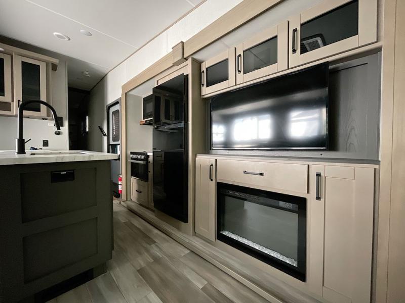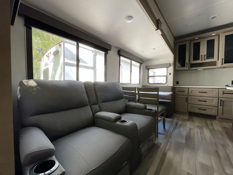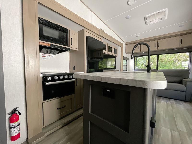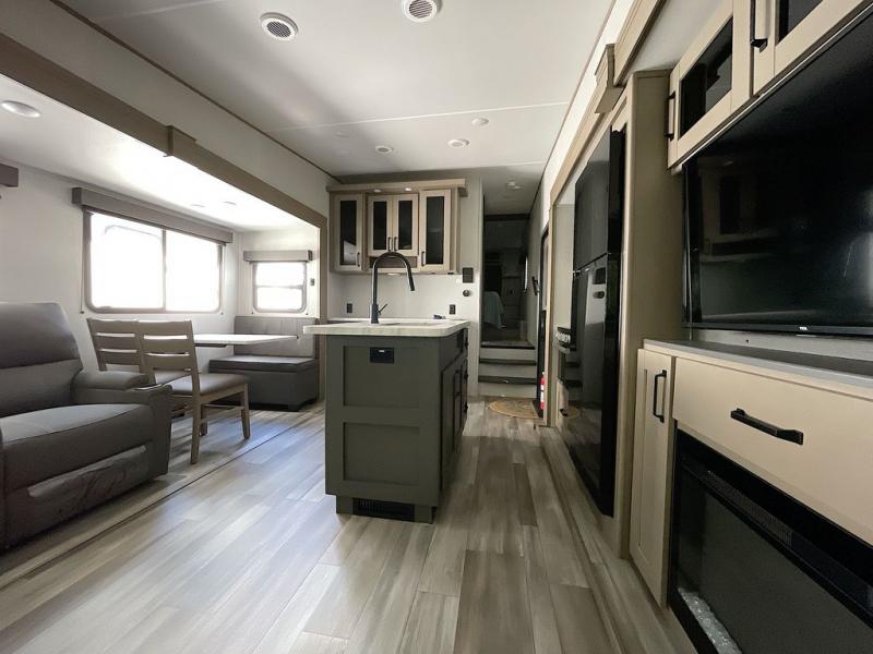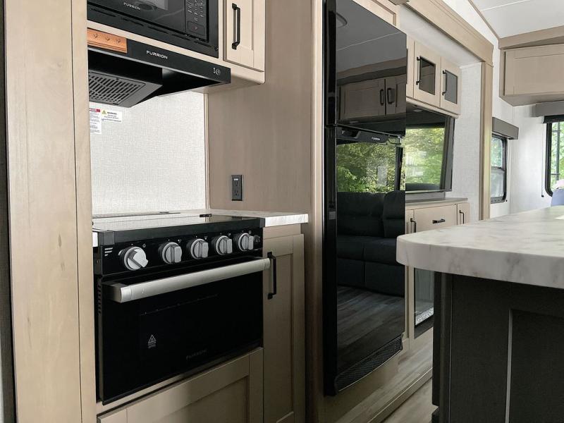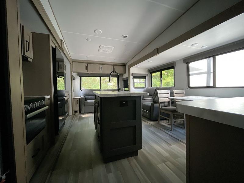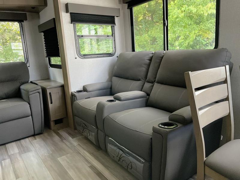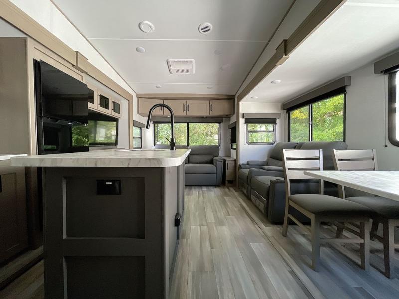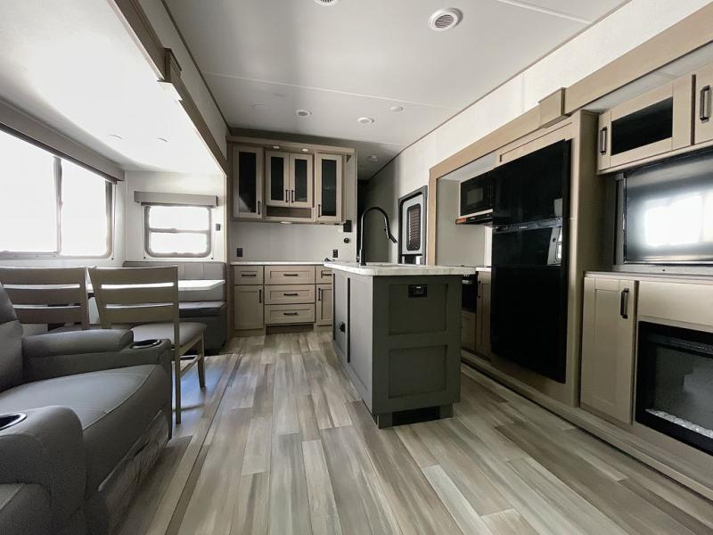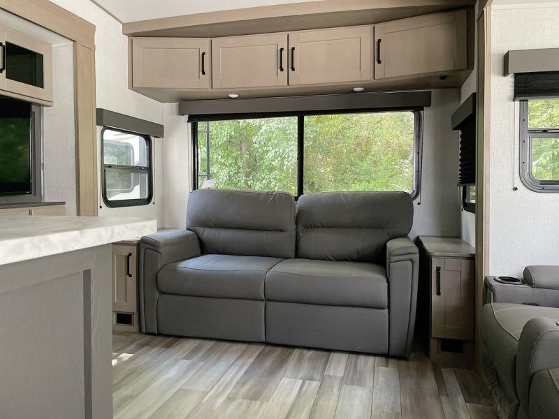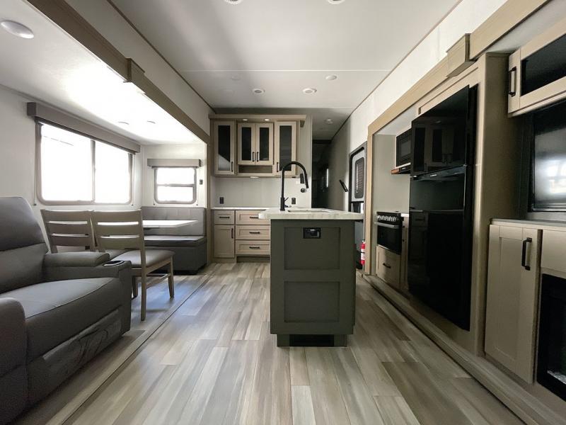 You'll love the amount of space you have in this fifth wheel thanks to the dual opposing slides in the rear living area/kitchen. Your friends and family can relax on the tri-fold sofa or theater seating across from the high-definition 40" LED TV. There is also a booth dinette or you can choose the optional swivel dinette if you prefer that seating. The chef of your group will appreciate having a kitchen island that will provide more counter space, plus there is a hutch with overhead cabinets for nice dishes. A full bath onboard lets you clean up each day and the front private bedroom includes a queen bed just like at home. You'll also love spending time outdoors under the electric awning, and there is an unobstructed pass-thru storage for fishing poles, hiking gear, and camp chairs!