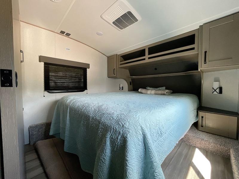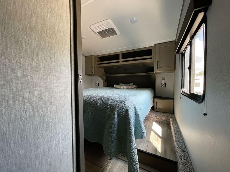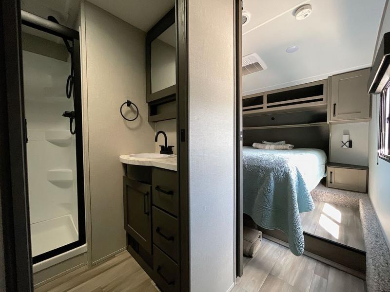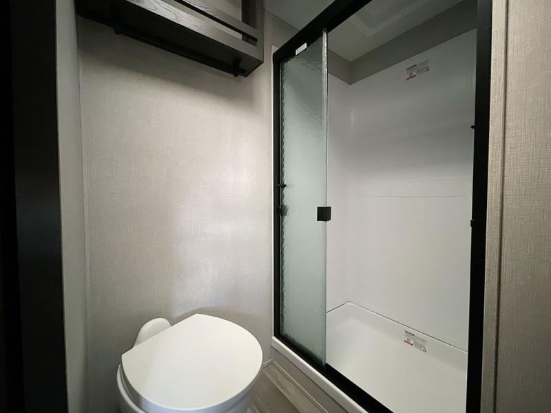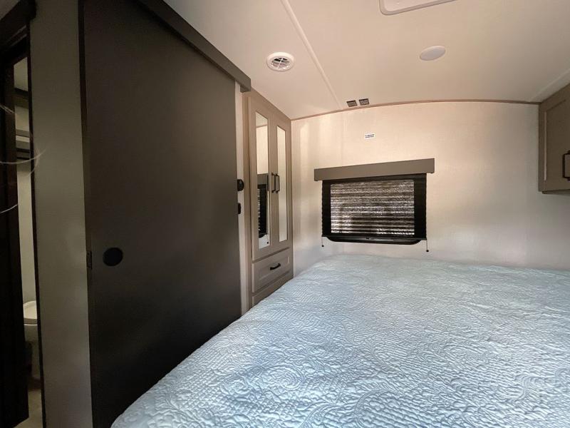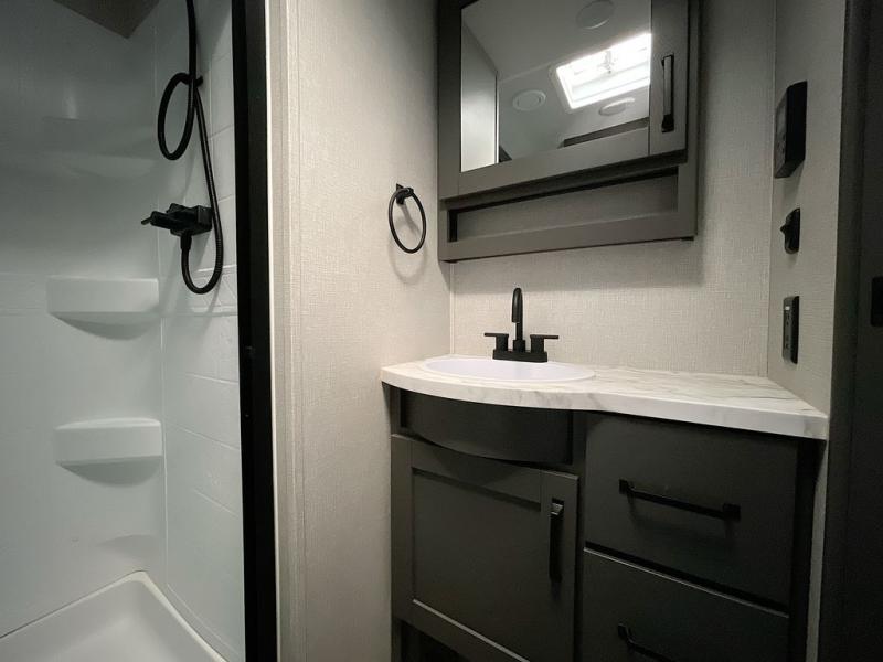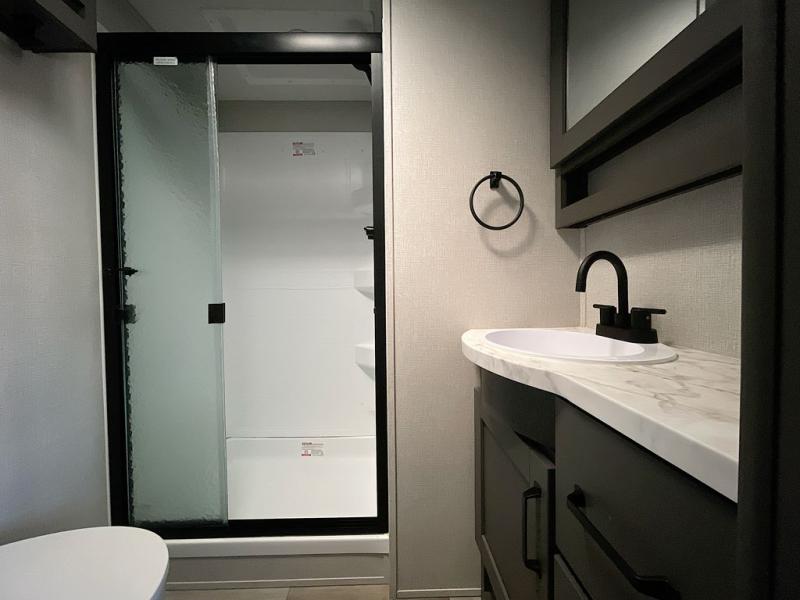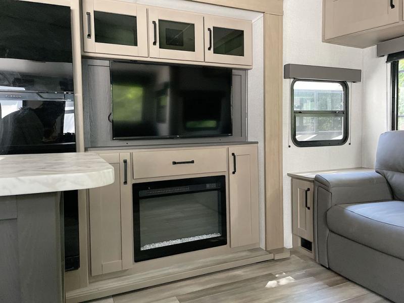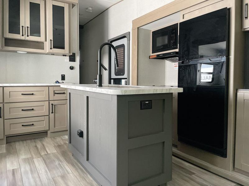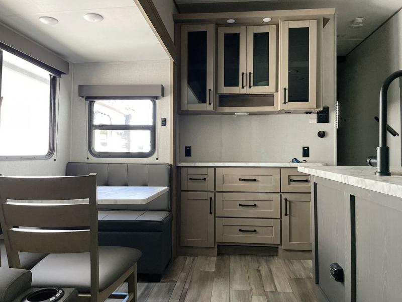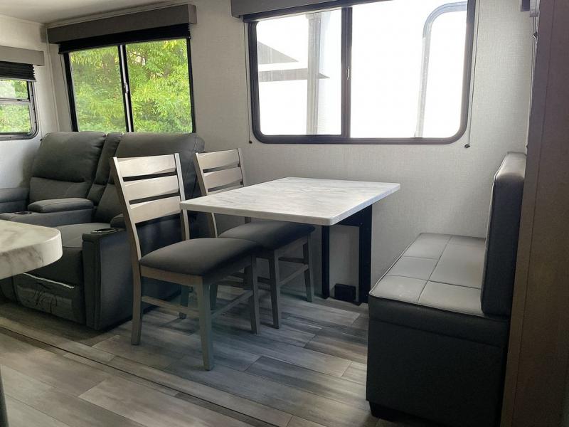 You'll love the amount of space you have in this fifth wheel thanks to the dual opposing slides in the rear living area/kitchen. Your friends and family can relax on the tri-fold sofa or theater seating across from the high-definition 40" LED TV. There is also a booth dinette or you can choose the optional swivel dinette if you prefer that seating. The chef of your group will appreciate having a kitchen island that will provide more counter space, plus there is a hutch with overhead cabinets for nice dishes. A full bath onboard lets you clean up each day and the front private bedroom includes a queen bed just like at home. You'll also love spending time outdoors under the electric awning, and there is an unobstructed pass-thru storage for fishing poles, hiking gear, and camp chairs!