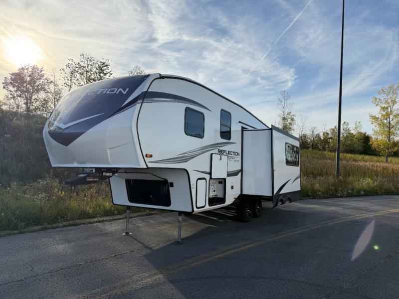 Feel right at home in this Reflection 150 Series with a private bedroom that includes a walk-around queen bed with storage on each side, windows, and a space savings sliding door. The full bathroom offers a walk-in shower, storage for your linens and a sliding door for easy access. When you get hungry, the cook will have an L-shaped kitchen area to make meals, plus full amenities including a 30" microwave, a flip-up counter extension, a pantry for your dry goods and a 16 cu. ft. refrigerator to store lots of food and cold beverages. You can dine at the rear U-shaped dinette lounge and enjoy the view out of all the windows or outside under the 18' electric awning. And the 78" theatre seating will be a nice place to relax and watch the 40" LED HDTV.