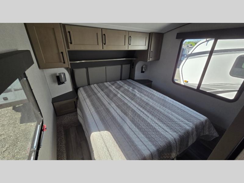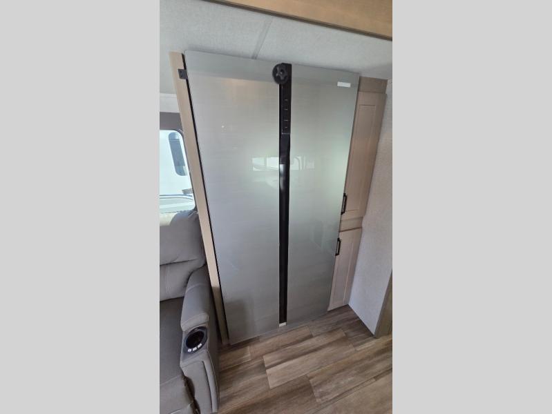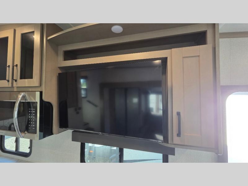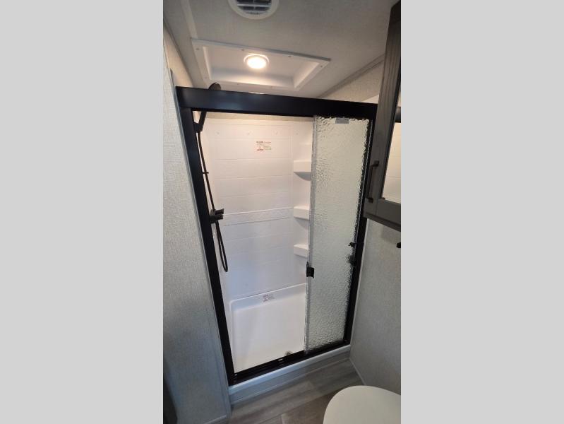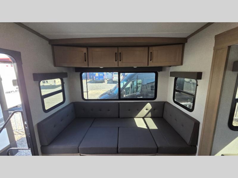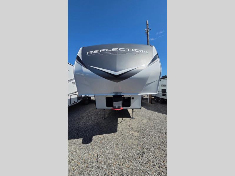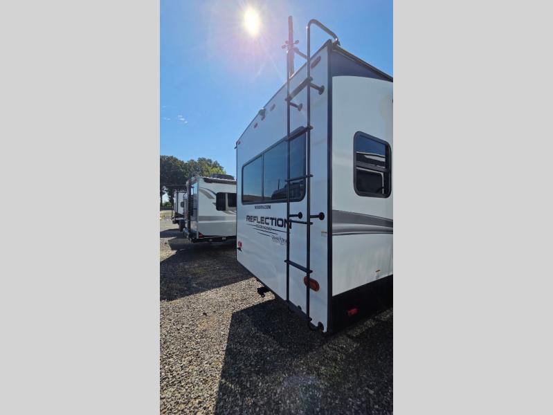 Feel right at home in this Reflection 150 Series with a private bedroom that includes a walk-around queen bed with storage on each side, windows, and a space savings sliding door. The full bathroom offers a walk-in shower, storage for your linens and a sliding door for easy access. When you get hungry, the cook will have an L-shaped kitchen area to make meals, plus full amenities including a 30" microwave, a flip-up counter extension, a pantry for your dry goods and a 16 cu. ft. refrigerator to store lots of food and cold beverages. You can dine at the rear U-shaped dinette lounge and enjoy the view out of all the windows or outside under the 18' electric awning. And the 78" theatre seating will be a nice place to relax and watch the 40" LED HDTV.