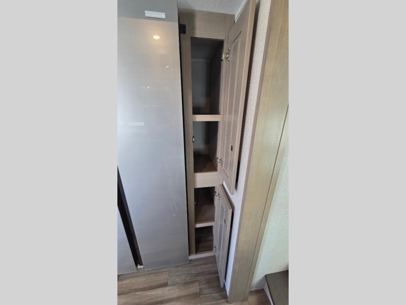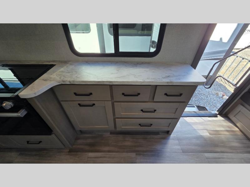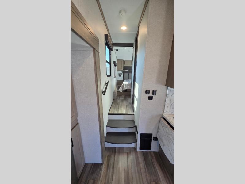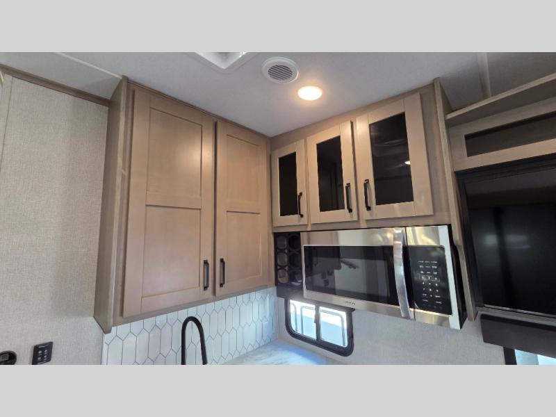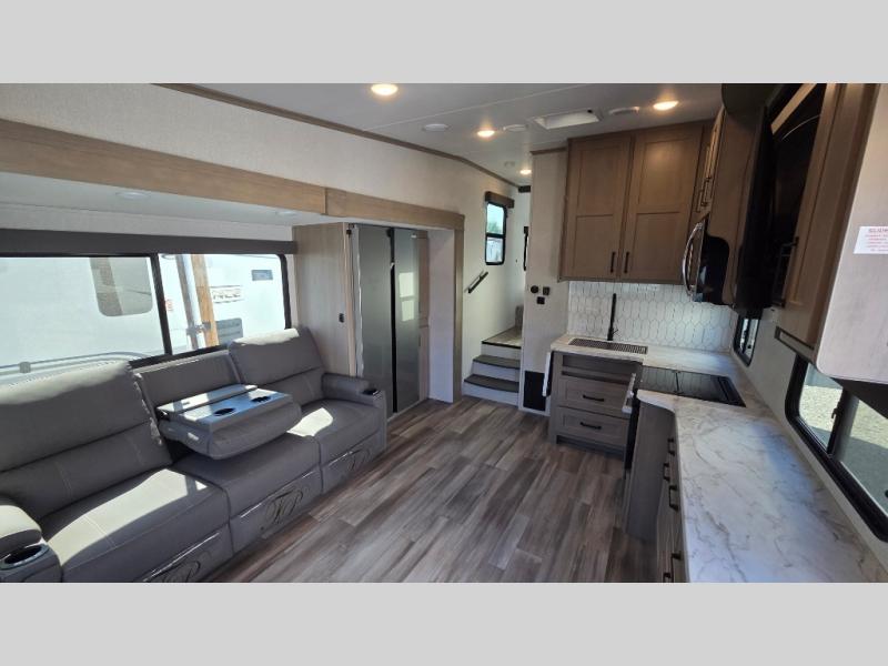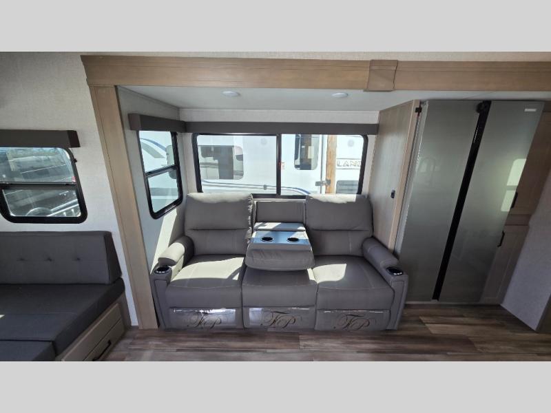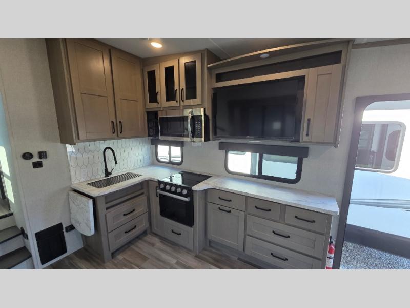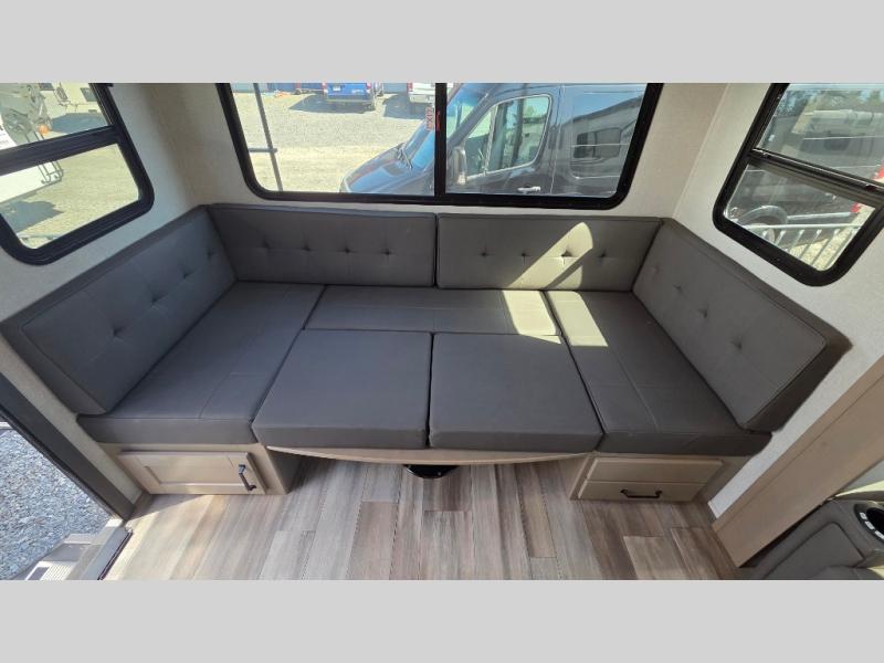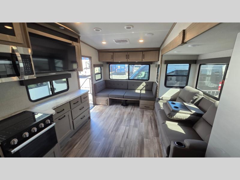 With any Reflection 150 Series fifth wheel by Grand Design, there is more available payload capacity and a broader range of half-ton trucks capable of towing this fifth wheel, and no slider hitch is needed thanks to the 90-degree turning radius which makes them short bed friendly and easier to tow. The mandatory Ultimate Power package provides a "One-Touch" automatic leveling system and a detachable power cord with LED light for easy setup, plus motion sensor pass-through lighting and entry lighting, and the Tire Linc TPMS will help you stay safe on the road. The interior offers residential luxury from the cabinetry and premium congoleum flooring, plus the booth dinette to the residential-style window treatment. Make your refined decision today!