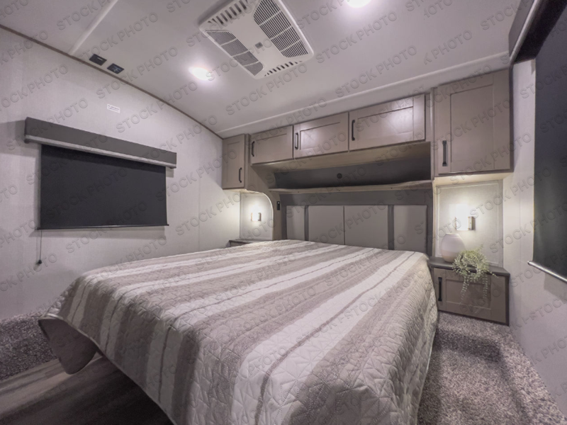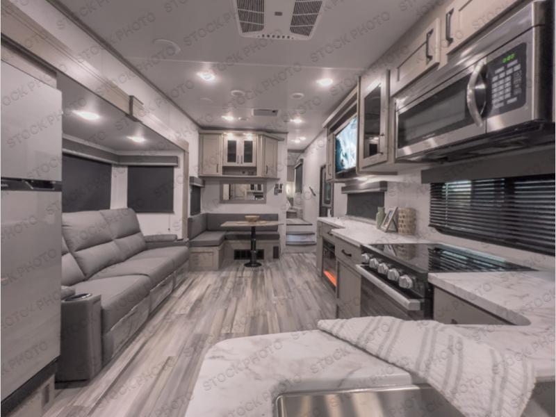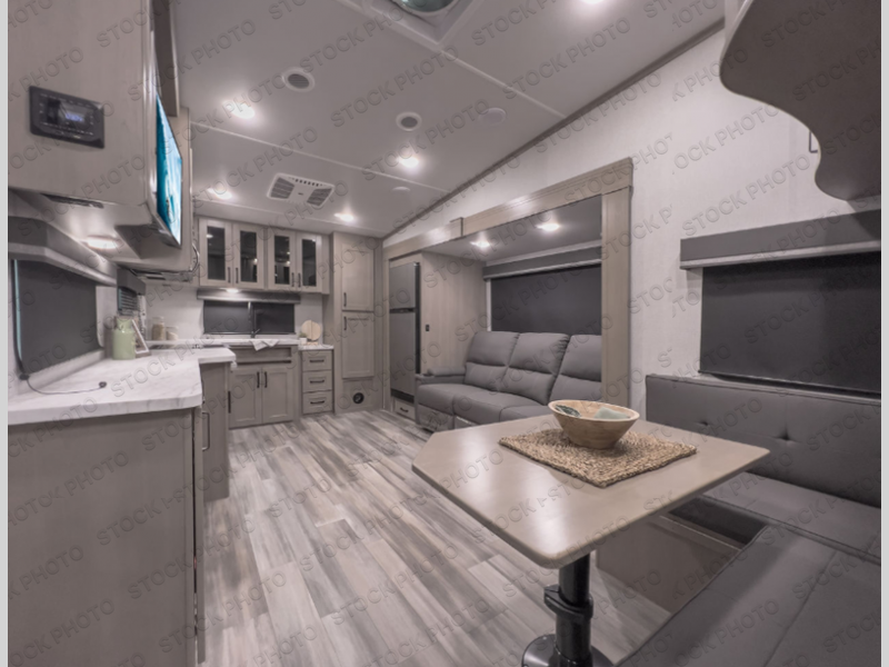 Your short bed truck will love this fifth wheel with swivel pin box and a 90 degree turning radius without a slider hitch. You will love this fifth wheel featuring a single slide for added interior living space and all the comforts and conveniences it provides you while you travel. The slide features a 78" theater seat plus there is a breakfast nook for more seating. Both can easily view the entertainment center with 40" TV. A rear kitchen indoors provides everything you need to create meals like home while on the road, and if you want to spend as much time outside as possible, then the outdoor griddle will certainly accommodate you for meals. Up front, a cozy private bedroom with queen bed, wardrobe, and overhead cabinets. Right next door, you will find a large walk-in shower with skylight for more natural lighting, as well as a toilet, and a vanity with sink and linen cabinet for your towels and toiletries. This unit offers ample storage both inside and out. You will love the full unobstructed pass-through compartment for all of your gear, plus so much more!