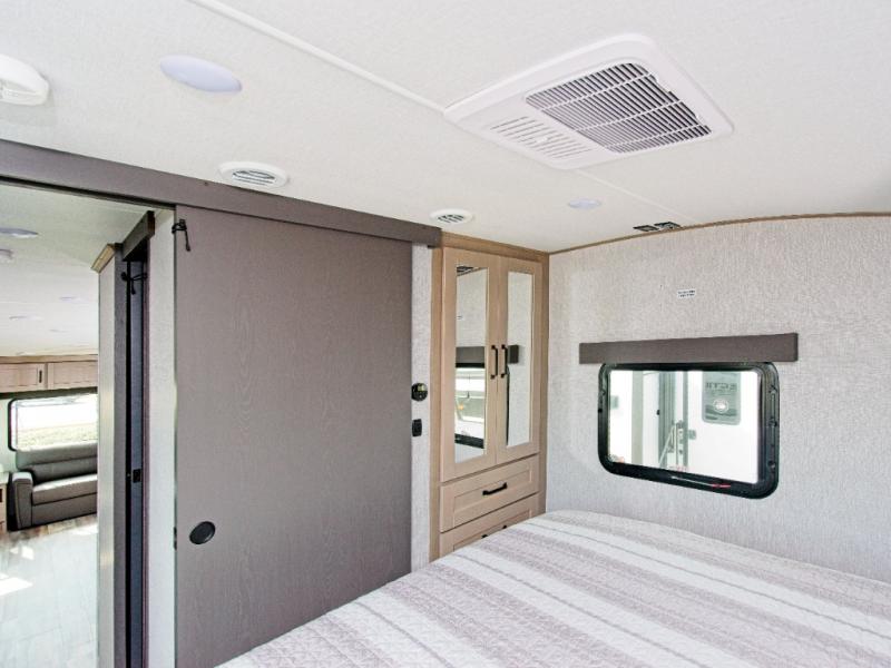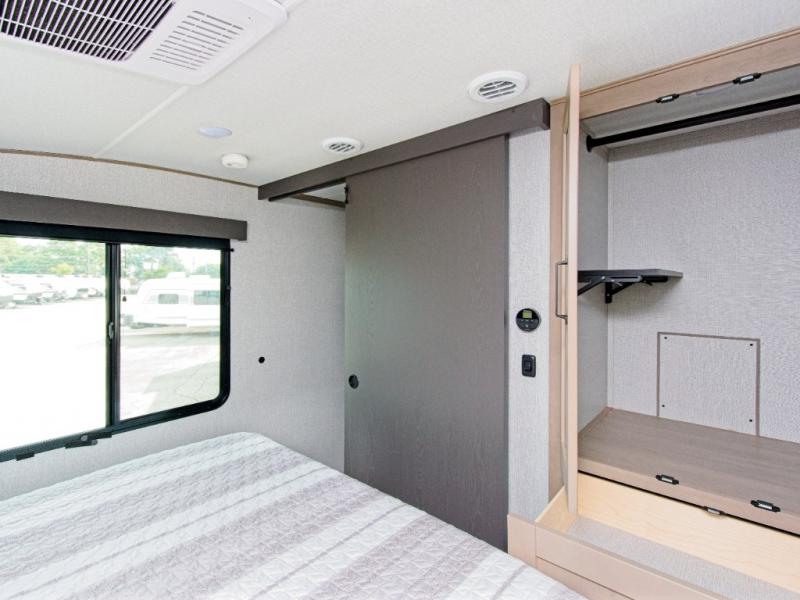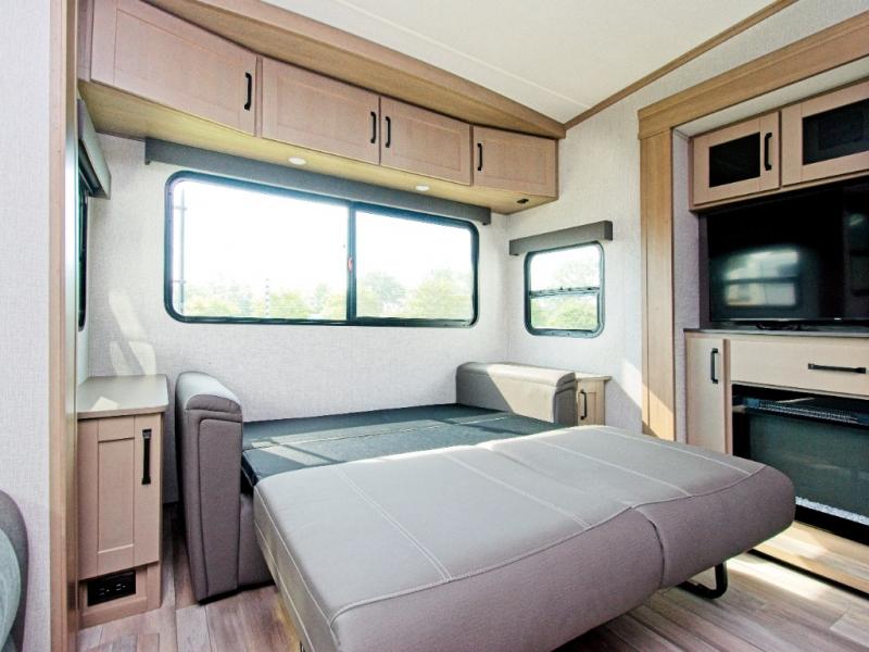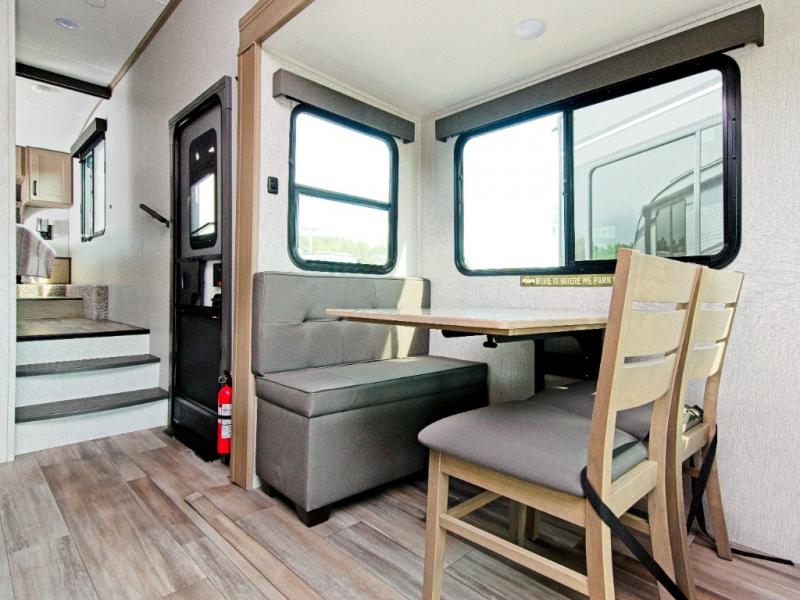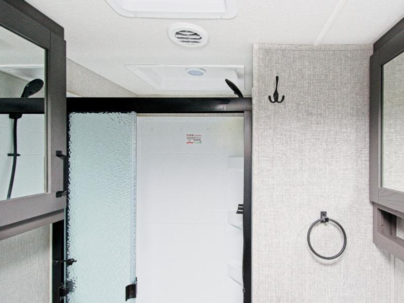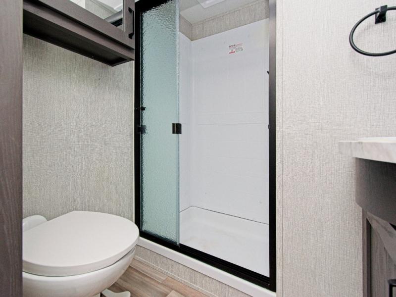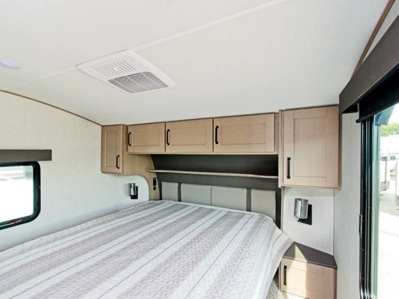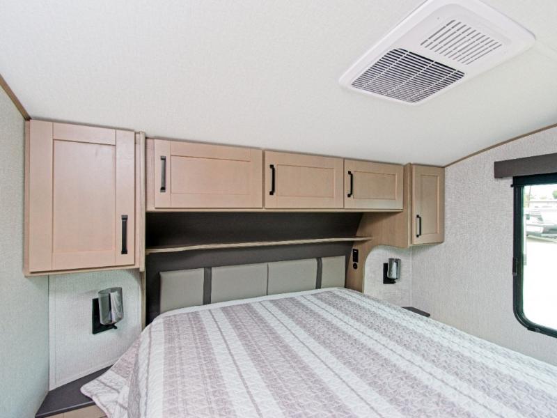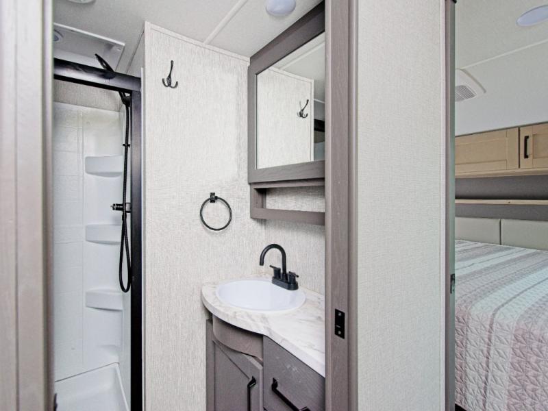 The front bedroom features a walk-around queen bed, overhead storage, and easy access to the full bathroom, located just steps away. Whether you're winding down after a day of adventure or getting ready for the next one, this layout offers privacy and convenience.