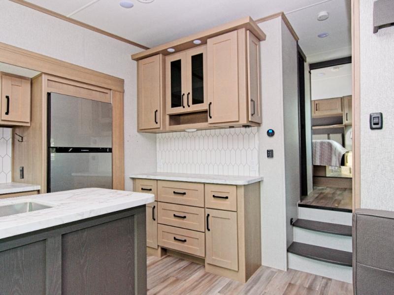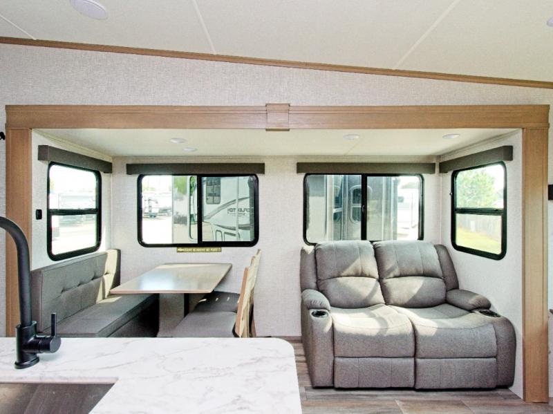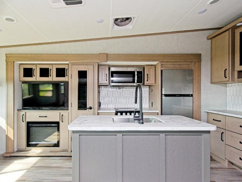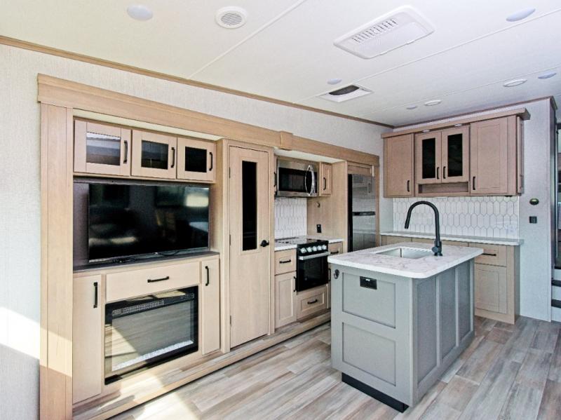 Inside, enjoy a spacious open-concept living area with dual slide-outs, theatre seating, and a tri-fold sofa for relaxing or hosting guests. The booth dinette (or optional swivel dinette) offers a cozy spot for meals, while the kitchen island and hutch provide generous counter space and storage. A large pantry keeps your essentials within reach, and the fireplace with 40" LED HDTV adds warmth and entertainment for quiet evenings or rainy days.