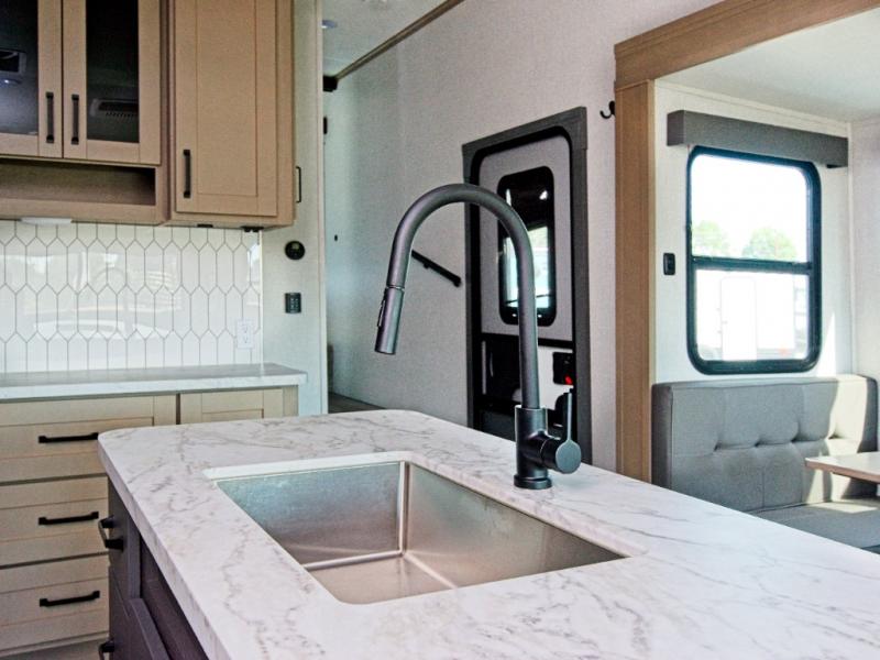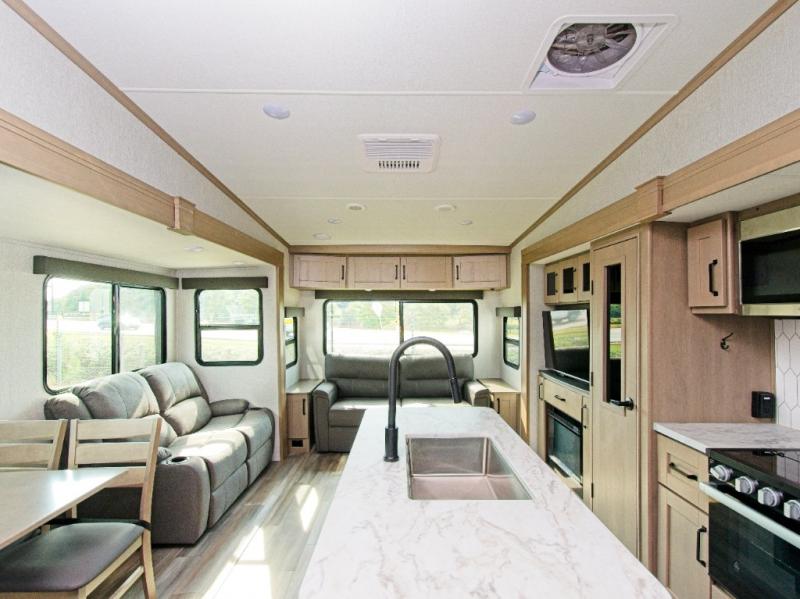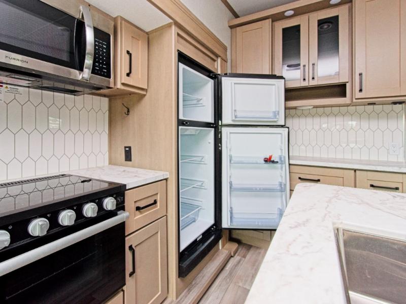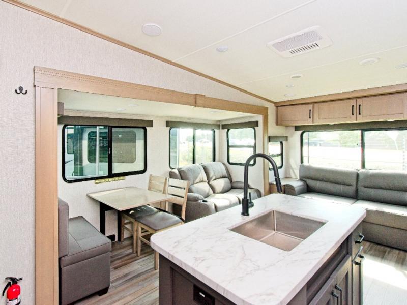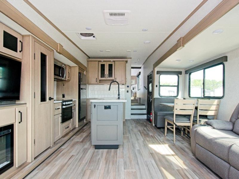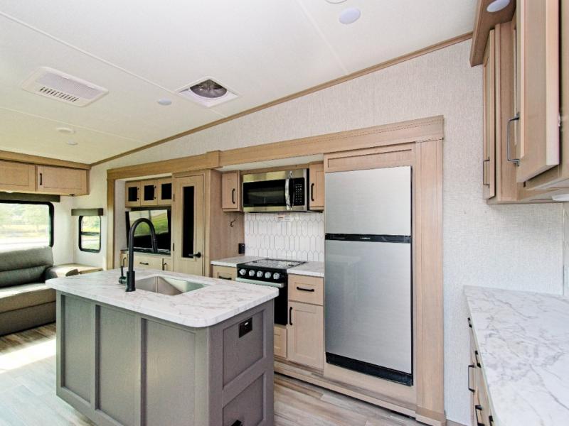 Towable by many half-ton trucks, the Grand Design Reflection 150 Series 295RL offers residential luxury with theatre seating and a spacious kitchen island for elevated camping comfort.