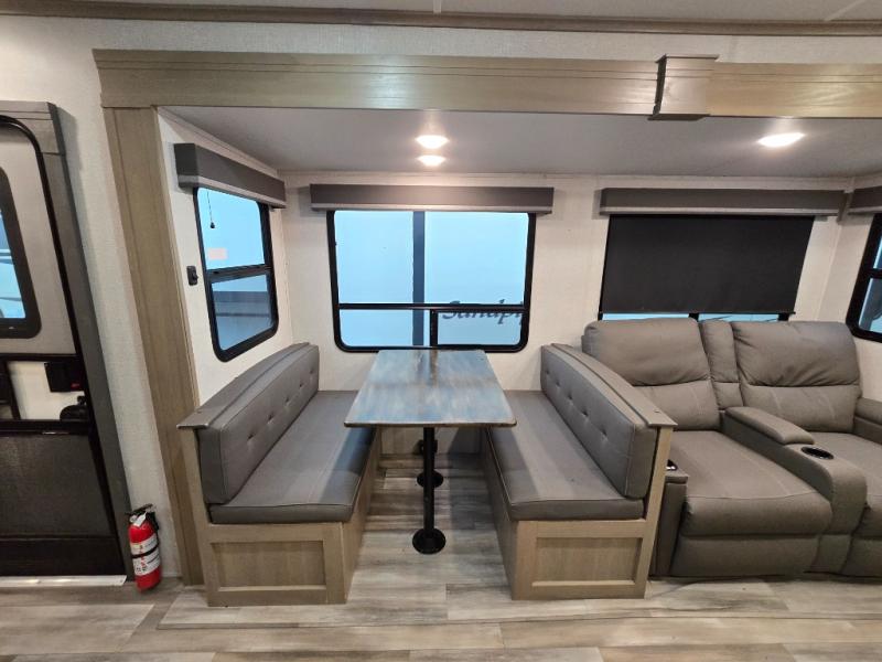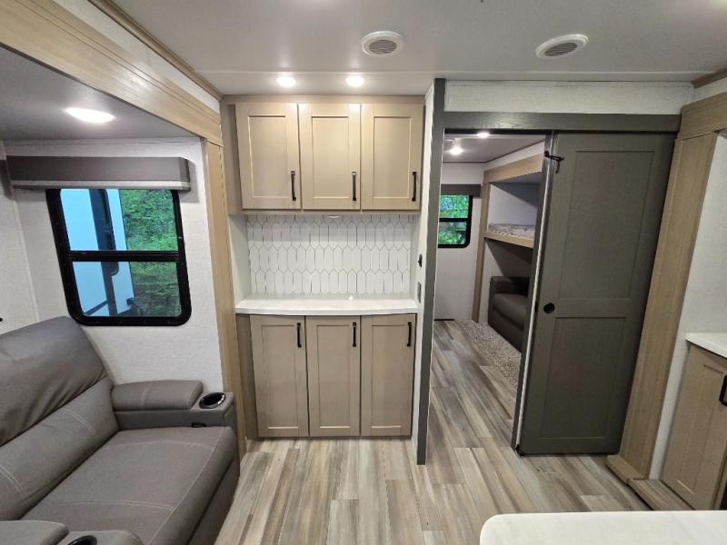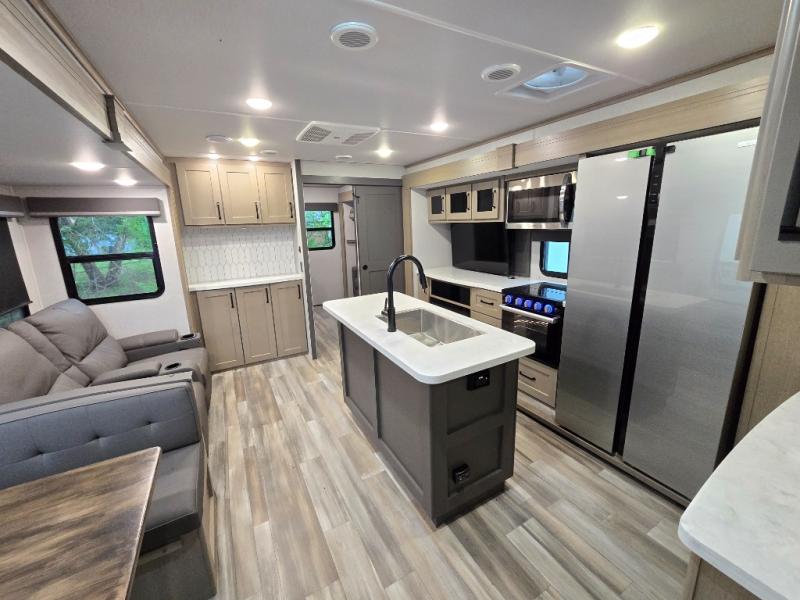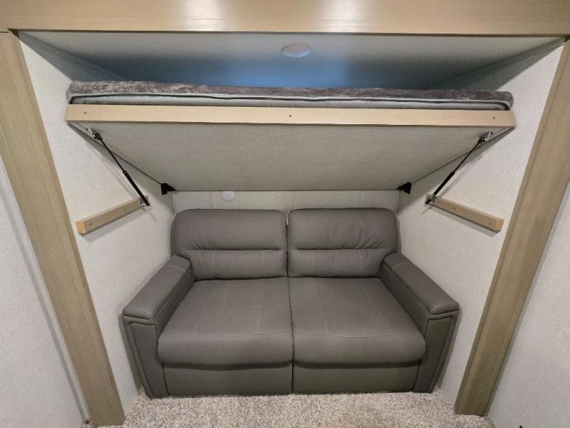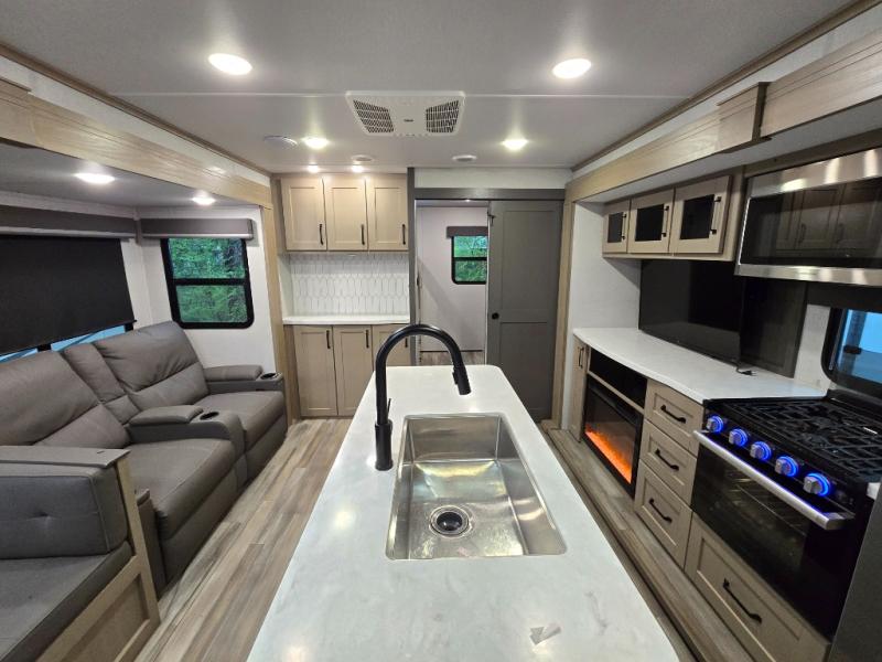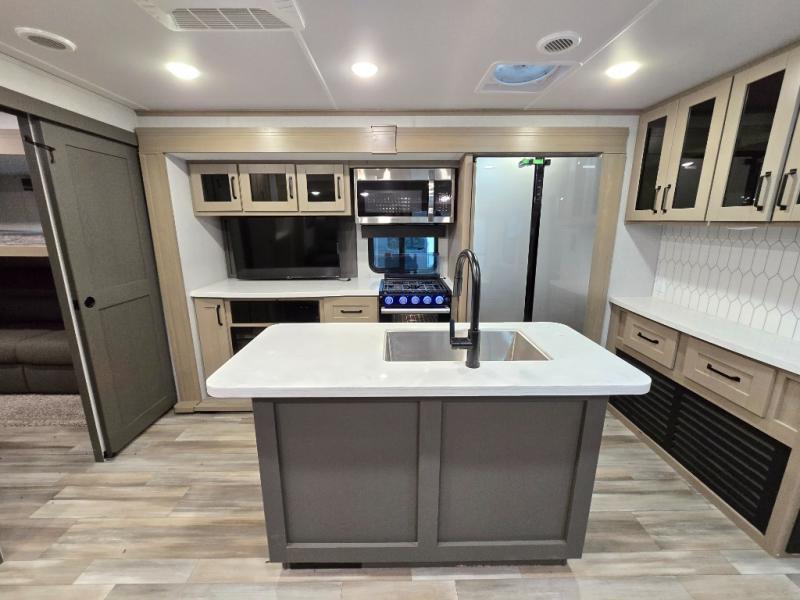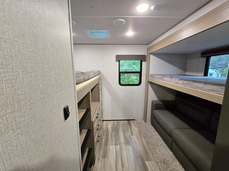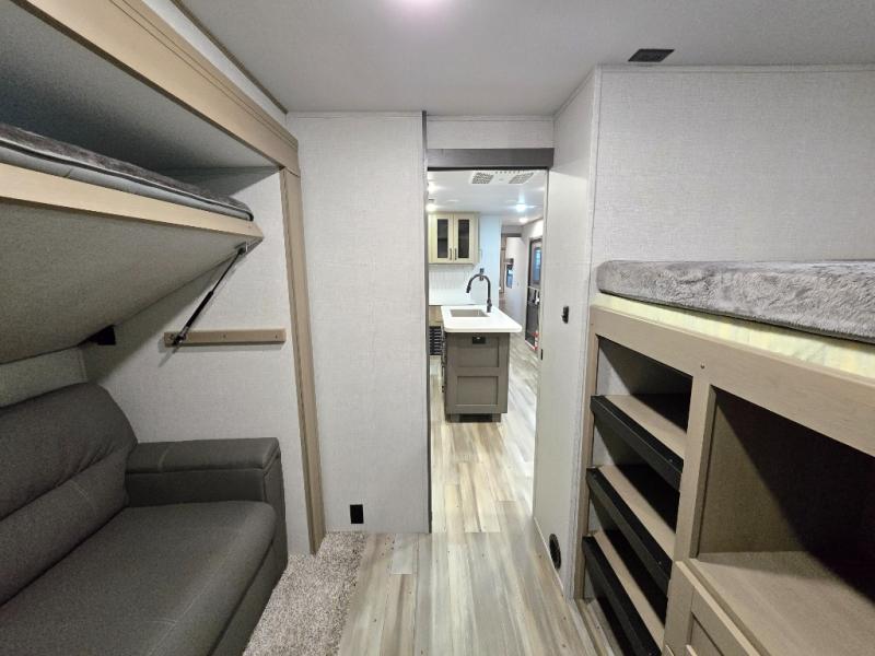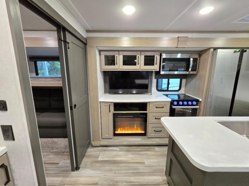 Finding the perfect trailer for a larger group is simple, take a look at this one for your next RV! The rear bunkhouse might be the first reason you fall in love because of the slide out with a flip bunk above a tri-fold sofa, the second bunk bed on the opposite side and storage below, and the large rear window for great views. The outside kitchen might be another reason allowing you to enjoy the outdoors while providing meals for everyone, and/or the inside gourmet kitchen with a 16 cu. ft. refrigerator, an island, and two hutches. Everyone can gather together and relax on the theater seating with cupholders and the booth dinette or choose a free standing dinette option, and to visit or watch the 40" LED HDTV with fireplace below. The full bathroom includes a space savings sliding door and linen storage, and the bedroom gives you a front walk-around queen bed with storage for your clothes on each side, plus there is an additional wardrobe with drawers and the option to add a washer/dryer to the prepped space.