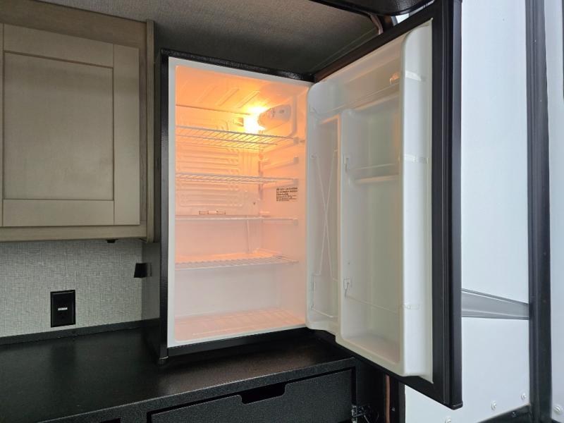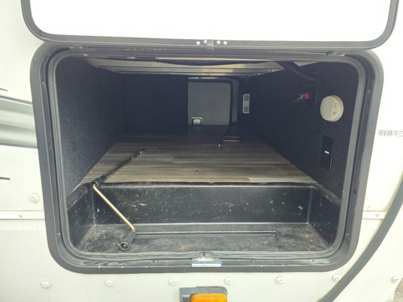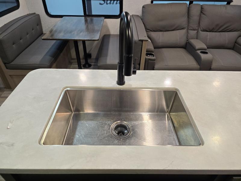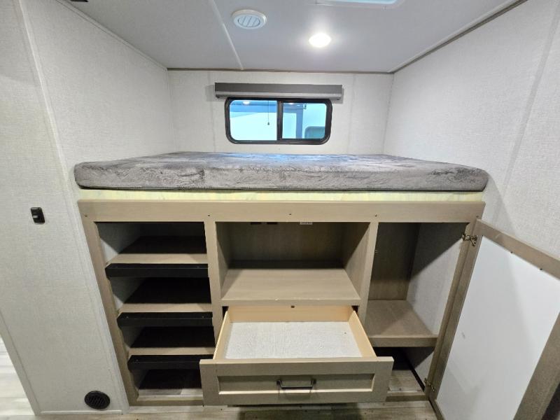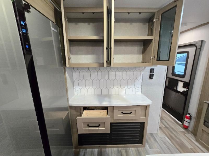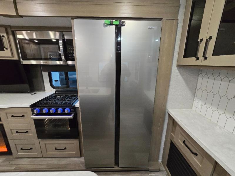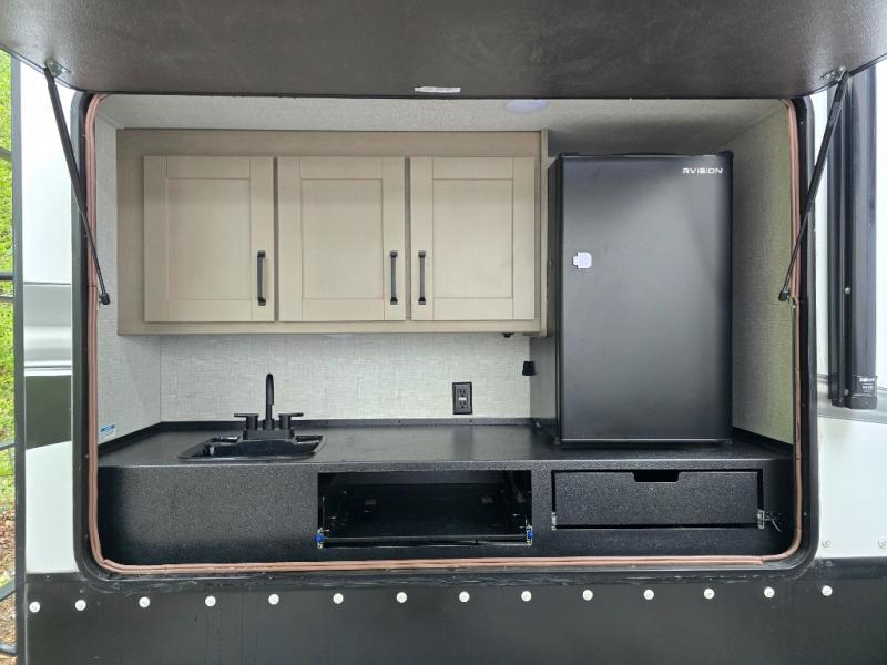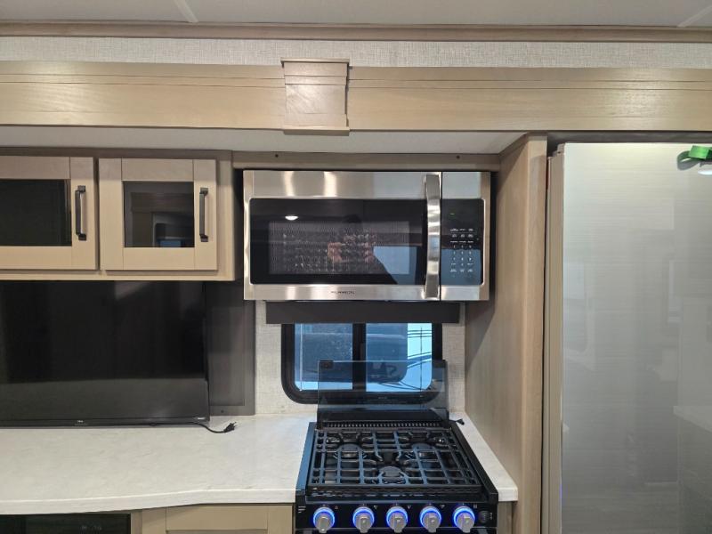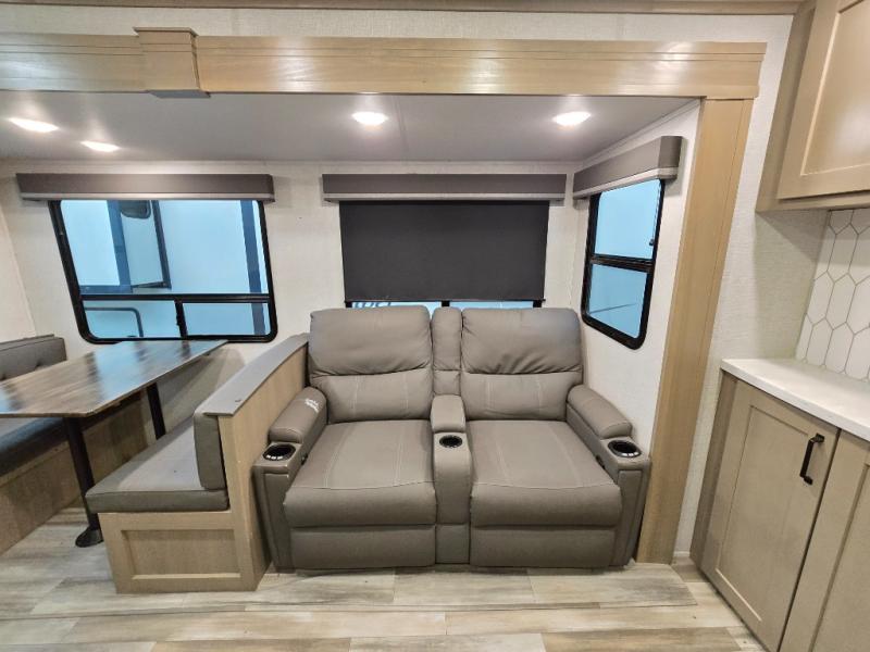 Finding the perfect trailer for a larger group is simple, take a look at this one for your next RV! The rear bunkhouse might be the first reason you fall in love because of the slide out with a flip bunk above a tri-fold sofa, the second bunk bed on the opposite side and storage below, and the large rear window for great views. The outside kitchen might be another reason allowing you to enjoy the outdoors while providing meals for everyone, and/or the inside gourmet kitchen with a 16 cu. ft. refrigerator, an island, and two hutches. Everyone can gather together and relax on the theater seating with cupholders and the booth dinette or choose a free standing dinette option, and to visit or watch the 40" LED HDTV with fireplace below. The full bathroom includes a space savings sliding door and linen storage, and the bedroom gives you a front walk-around queen bed with storage for your clothes on each side, plus there is an additional wardrobe with drawers and the option to add a washer/dryer to the prepped space.