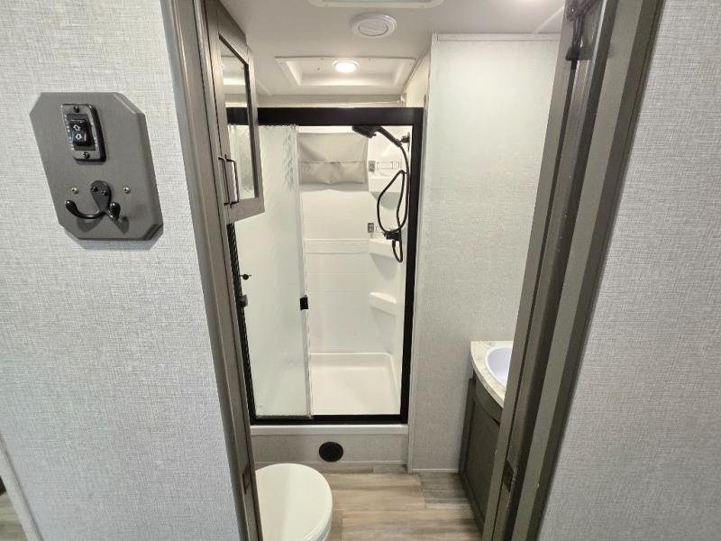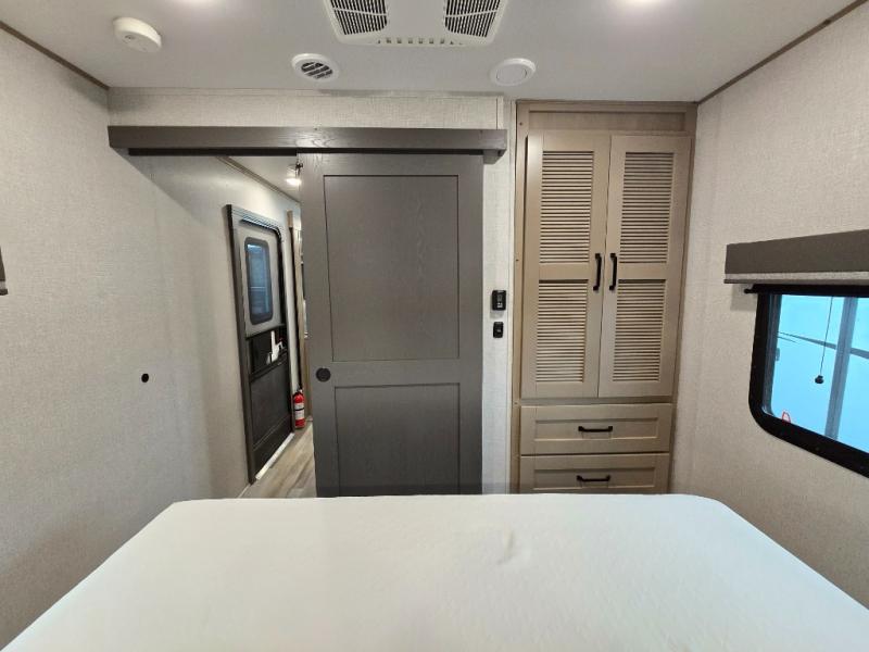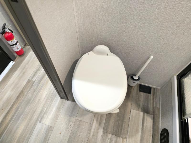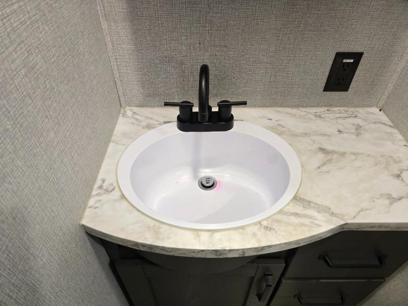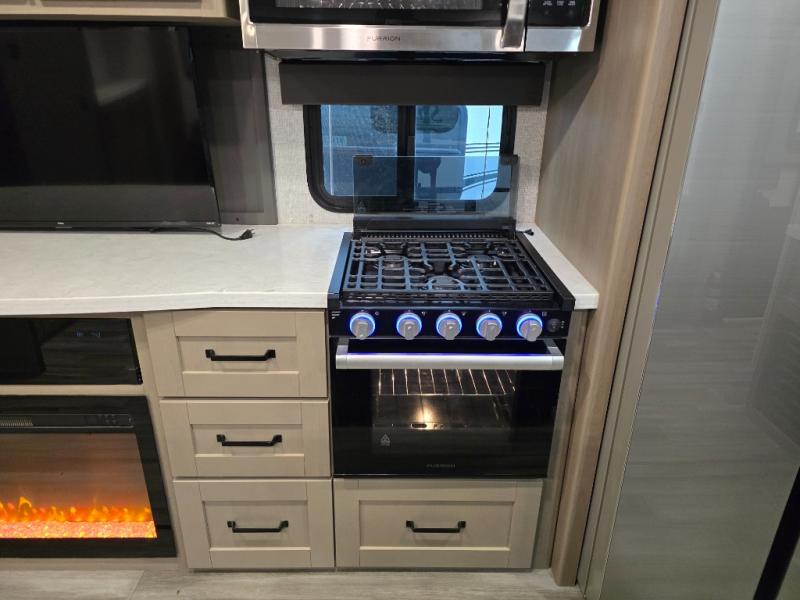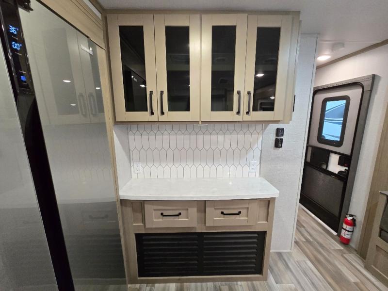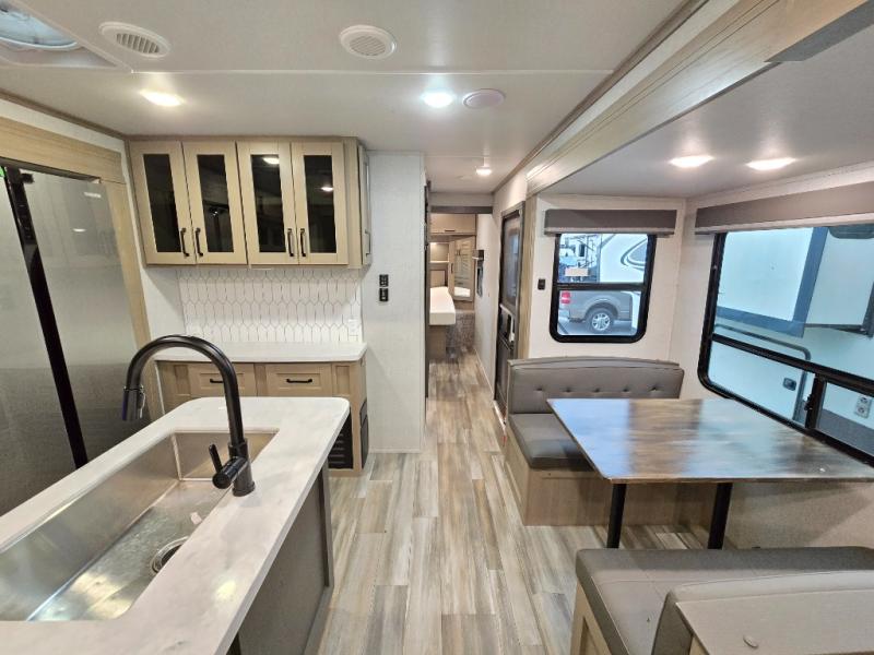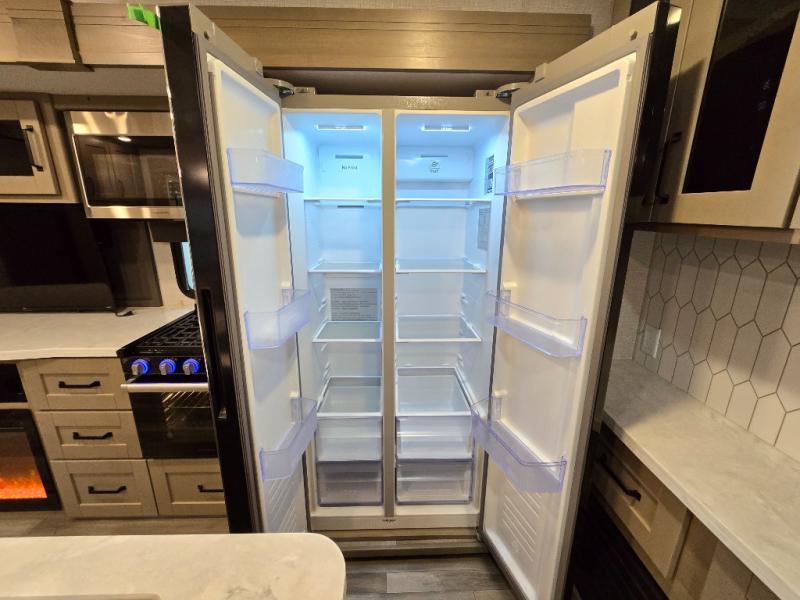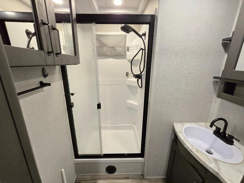 Finding the perfect trailer for a larger group is simple, take a look at this one for your next RV! The rear bunkhouse might be the first reason you fall in love because of the slide out with a flip bunk above a tri-fold sofa, the second bunk bed on the opposite side and storage below, and the large rear window for great views. The outside kitchen might be another reason allowing you to enjoy the outdoors while providing meals for everyone, and/or the inside gourmet kitchen with a 16 cu. ft. refrigerator, an island, and two hutches. Everyone can gather together and relax on the theater seating with cupholders and the booth dinette or choose a free standing dinette option, and to visit or watch the 40" LED HDTV with fireplace below. The full bathroom includes a space savings sliding door and linen storage, and the bedroom gives you a front walk-around queen bed with storage for your clothes on each side, plus there is an additional wardrobe with drawers and the option to add a washer/dryer to the prepped space.