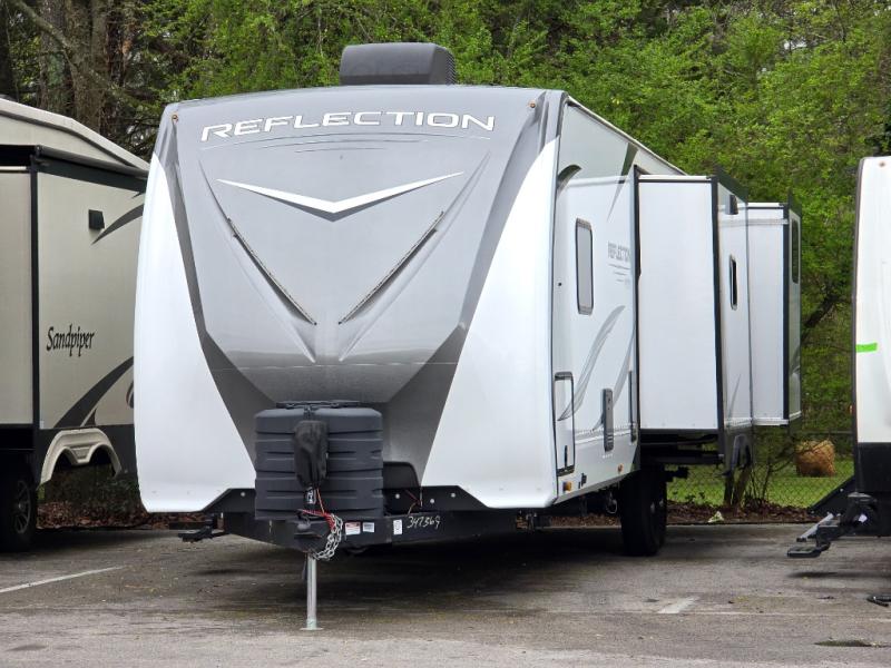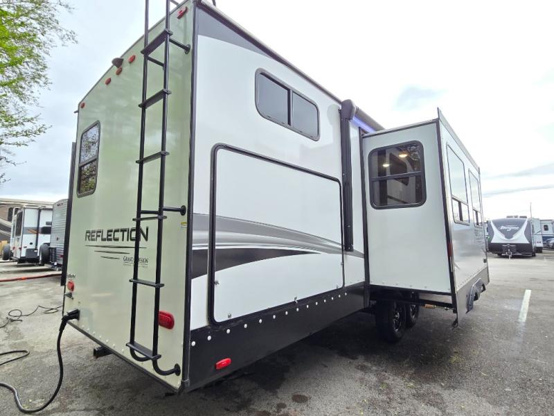 With any Reflection travel trailer by Grand Design, you will have a solar panel for off-grid camping and a 50 amp charge controller and inverter prep, a Universal All-In-One docking station, unobstructed pass-through storage, and nitrogen filled radial tires. Some other top features include the 30" stainless steel microwave, the maximum 7-foot headroom, and the ductless heating system with no vents in the floor to collect debris. Each is constructed of gel coat exterior sidewalls, residential 5" truss rafters, walk-on roof decking, a fiberglass and radiant foil roof and front cap insulation plus laminated aluminum framed side walls, roof and end walls in slide rooms. Choose luxury, value, and towability over all the others, take home a Reflection of your good taste!