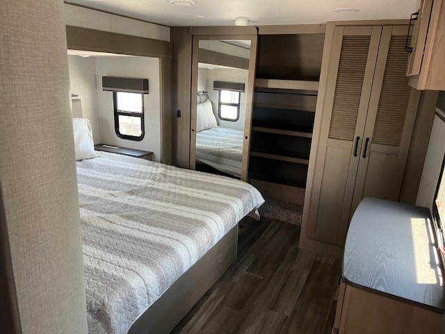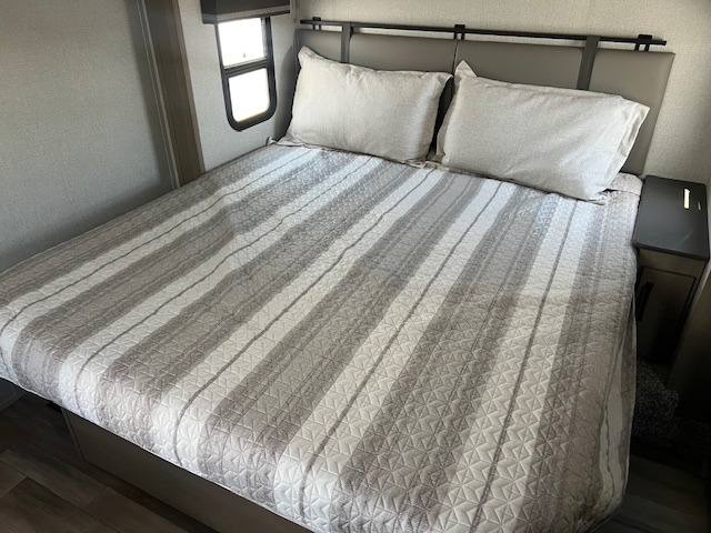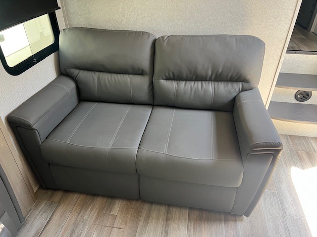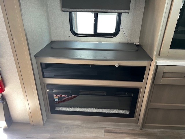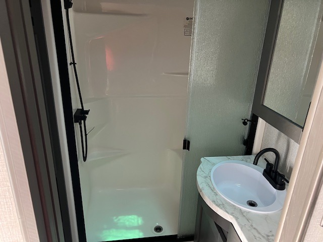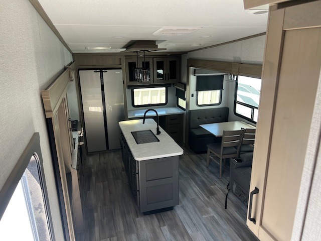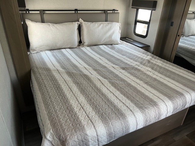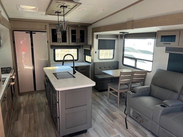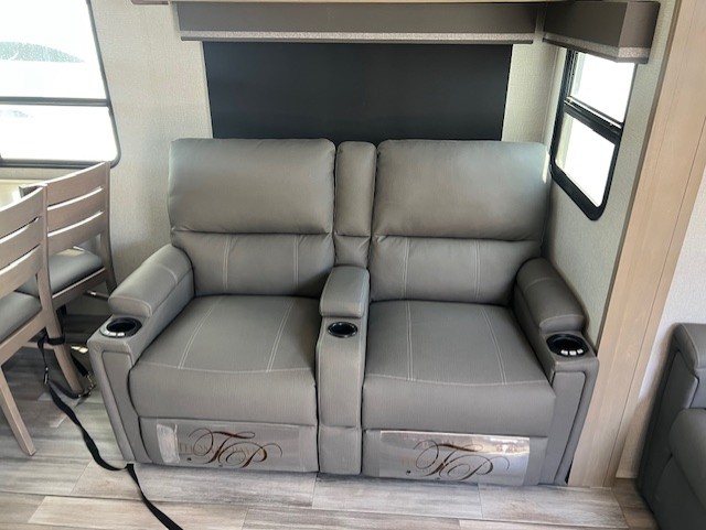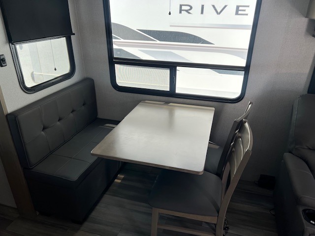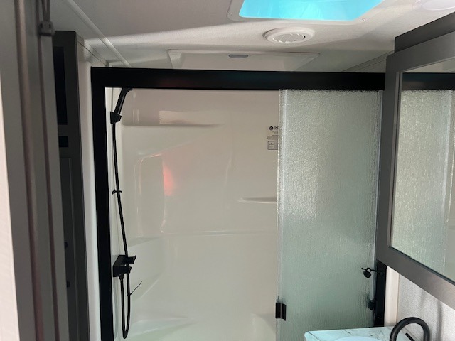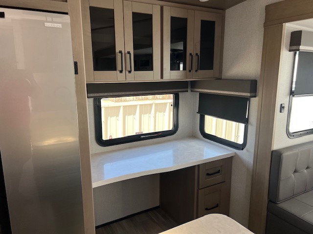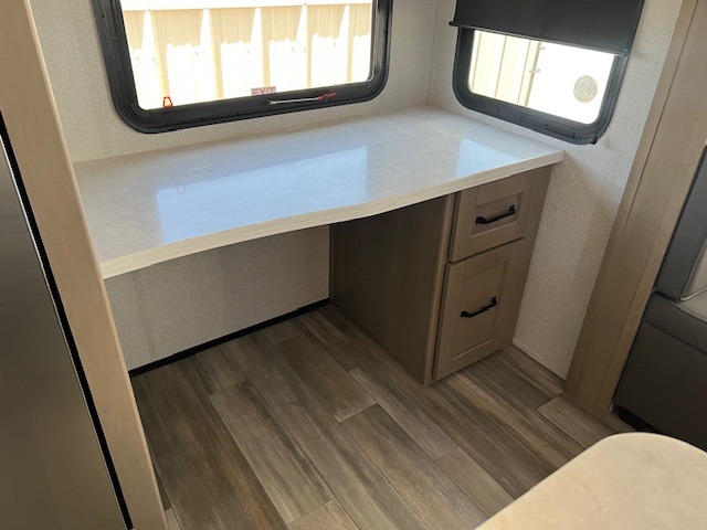 Comfortable accommodations are found throughout this fifth wheel so you can relax, unwind and enjoy your vacation be it for a weekend or a month and even when you have to work! Thanks to the rear desk with a chair and the bedroom with washer and dryer prep, you could stay in this RV as long as you like and keep all your clothes and linens clean. The front bedroom also provides a front wall wardrobe, a slide out queen bed and a dresser. The spacious shower has a glass door and there is linen storage in the full bathroom. The spacious main living and kitchen area has two slide outs with full kitchen amenities and seating with theater seats including cupholders, a booth dinette, and a tri-fold sofa. And the exterior offers an outside kitchen with a griddle, a 1.6 cu ft. refrigerator, and two power awnings!
