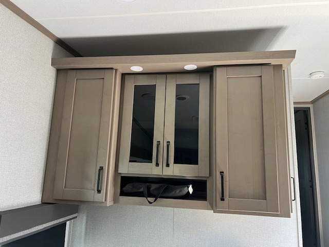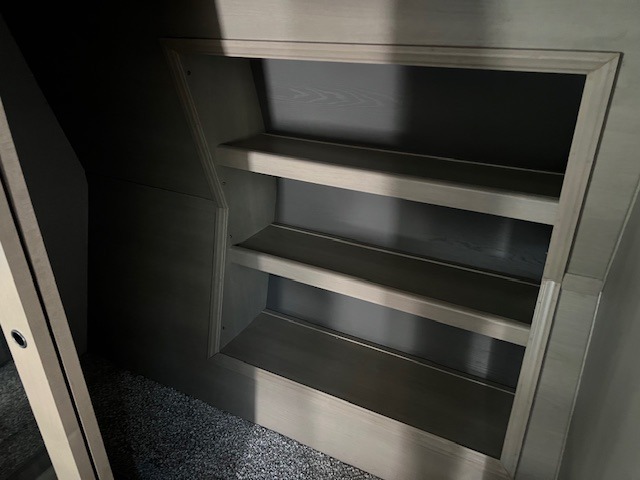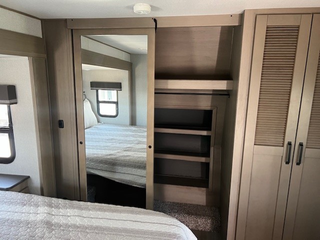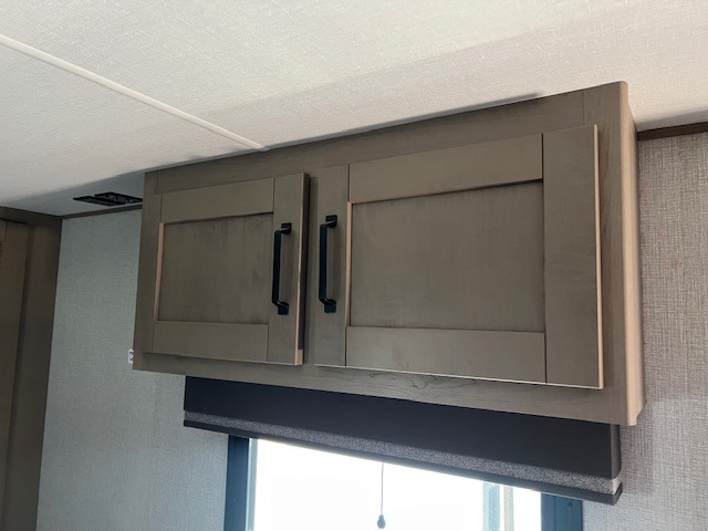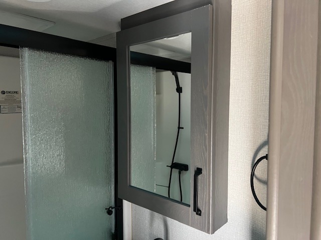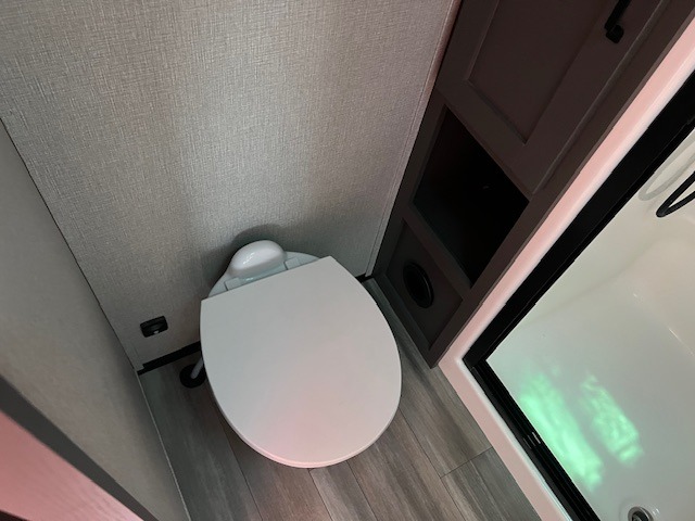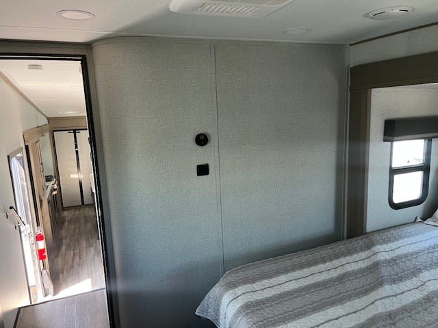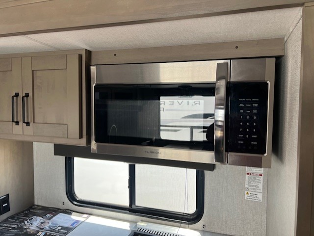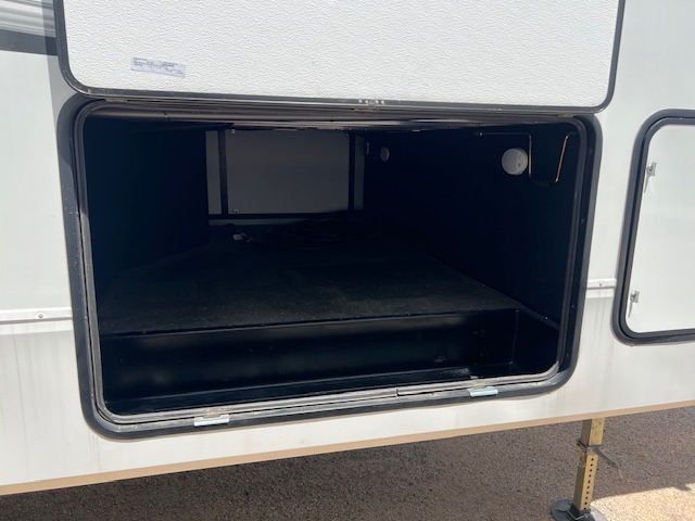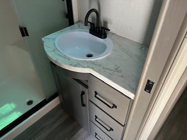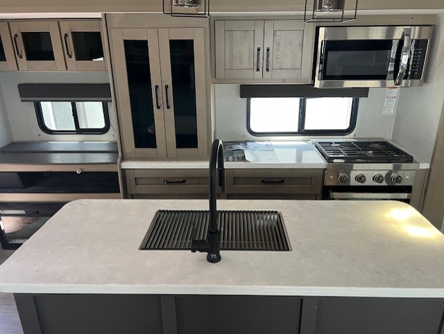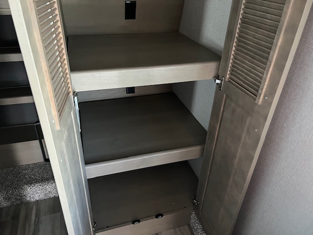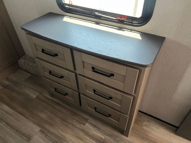 Comfortable accommodations are found throughout this fifth wheel so you can relax, unwind and enjoy your vacation be it for a weekend or a month and even when you have to work! Thanks to the rear desk with a chair and the bedroom with washer and dryer prep, you could stay in this RV as long as you like and keep all your clothes and linens clean. The front bedroom also provides a front wall wardrobe, a slide out queen bed and a dresser. The spacious shower has a glass door and there is linen storage in the full bathroom. The spacious main living and kitchen area has two slide outs with full kitchen amenities and seating with theater seats including cupholders, a booth dinette, and a tri-fold sofa. And the exterior offers an outside kitchen with a griddle, a 1.6 cu ft. refrigerator, and two power awnings!