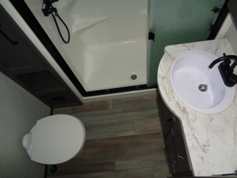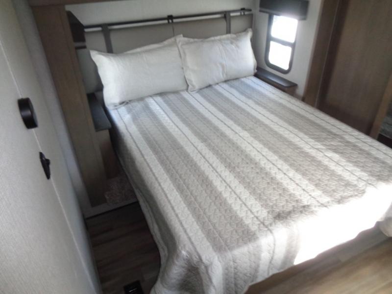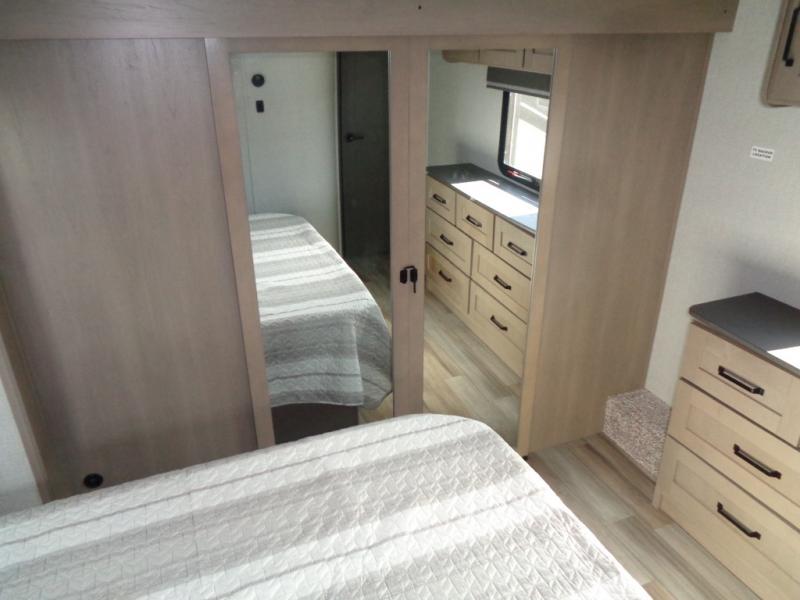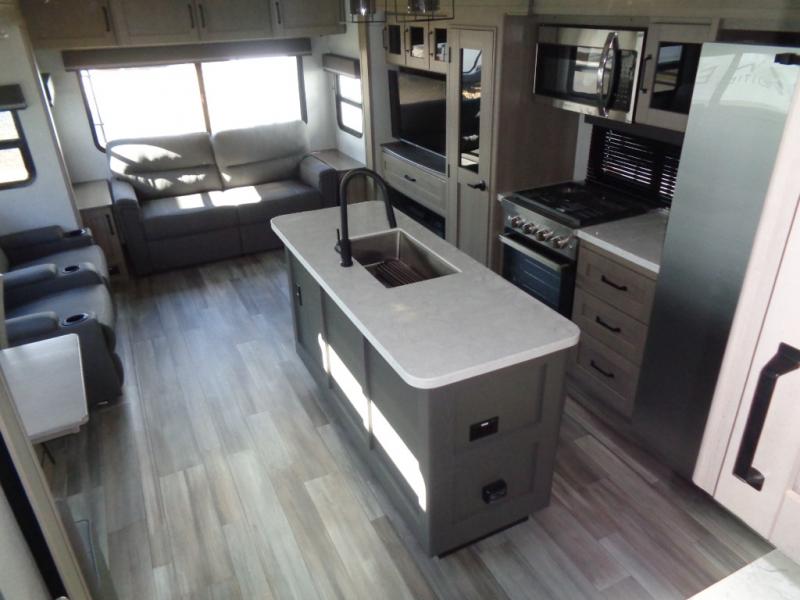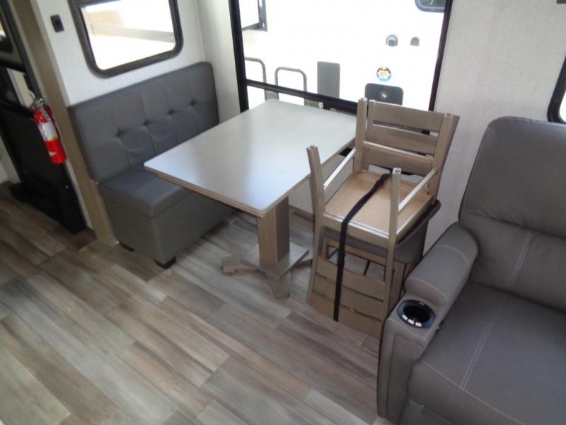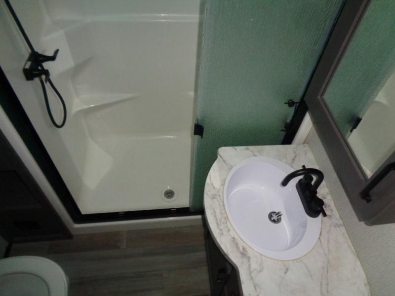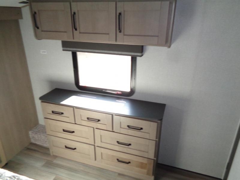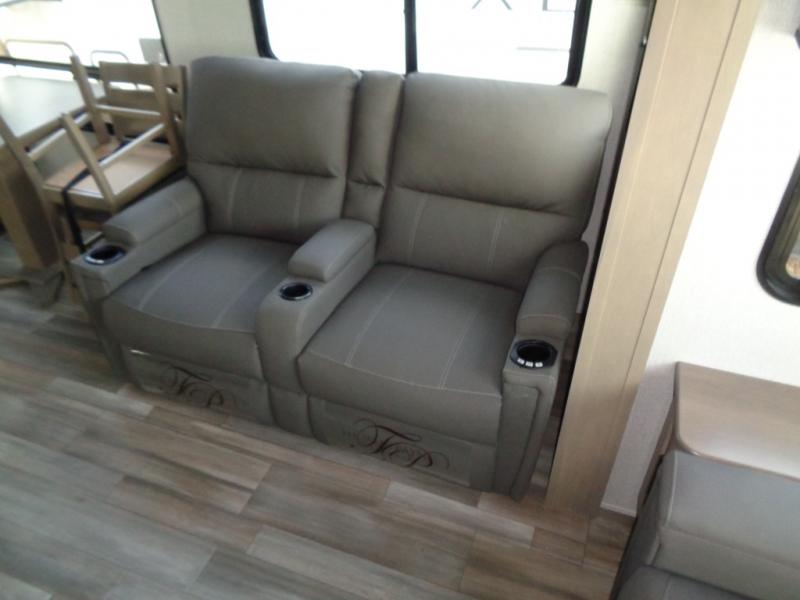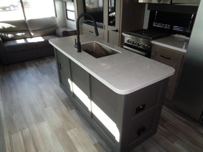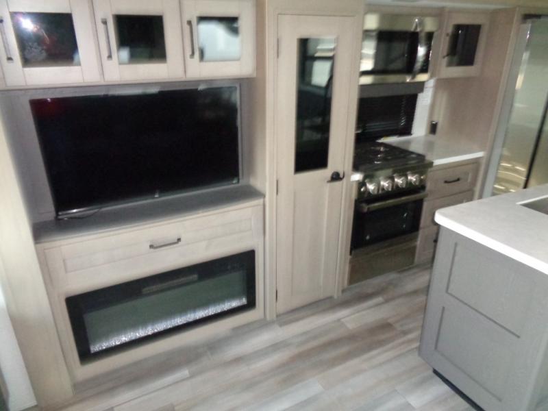You can enjoy a spacious rear living area in this RV with dual opposing slides offering you entertainment, kitchen amenities, seating and windows for great views! The rear tri-fold sofa also converts into extra sleeping space for an extra guest or two, just like the booth dinette does. Yet you might like to add the free standing dinette option. There are theater seats to enjoy while you place your drinks in the cupholders and watch the entertainment center with a 40" LED HDTV and fireplace. The pantry is big enough to store your favorite snacks, and the kitchen island will make meal prepping easier, plus there is a 16 cu. ft. refrigerator to store any leftovers. The full bathroom has a 30" x 48" fiberglass shower and a linen closet to store your towels. The front private bedroom has a comfortable queen bed slide that can be switched out for the optional king bed, a dresser with overhead cabinets, and a full wall wardrobe that is prepped to add the optional washer and dryer so that you can extend your camping trip with clean clothes!