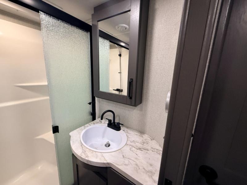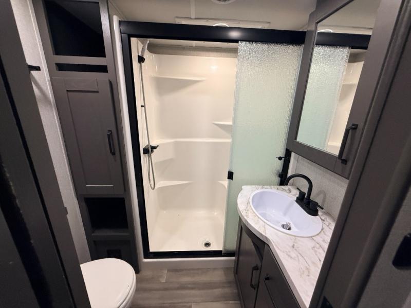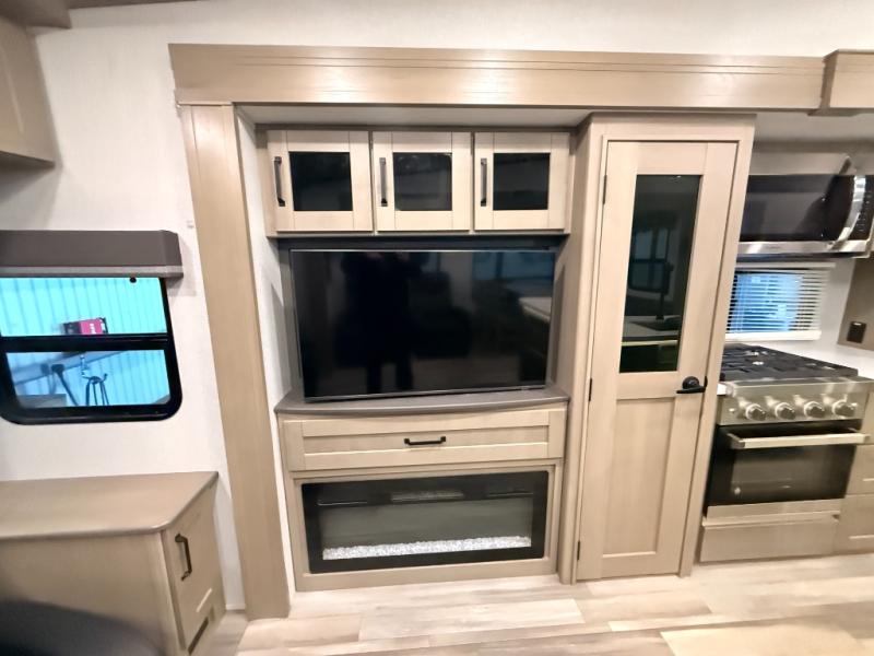 You can enjoy a spacious rear living area in this RV with dual opposing slides offering you entertainment, kitchen amenities, seating and windows for great views! The rear tri-fold sofa also converts into extra sleeping space for an extra guest or two, just like the booth dinette does. Yet you might like to add the free standing dinette option. There are theater seats to enjoy while you place your drinks in the cupholders and watch the entertainment center with a 40" LED HDTV and fireplace. The pantry is big enough to store your favorite snacks, and the kitchen island will make meal prepping easier, plus there is a 16 cu. ft. refrigerator to store any leftovers. The full bathroom has a 30" x 48" fiberglass shower and a linen closet to store your towels. The front private bedroom has a comfortable queen bed slide that can be switched out for the optional king bed, a dresser with overhead cabinets, and a full wall wardrobe that is prepped to add the optional washer and dryer so that you can extend your camping trip with clean clothes!