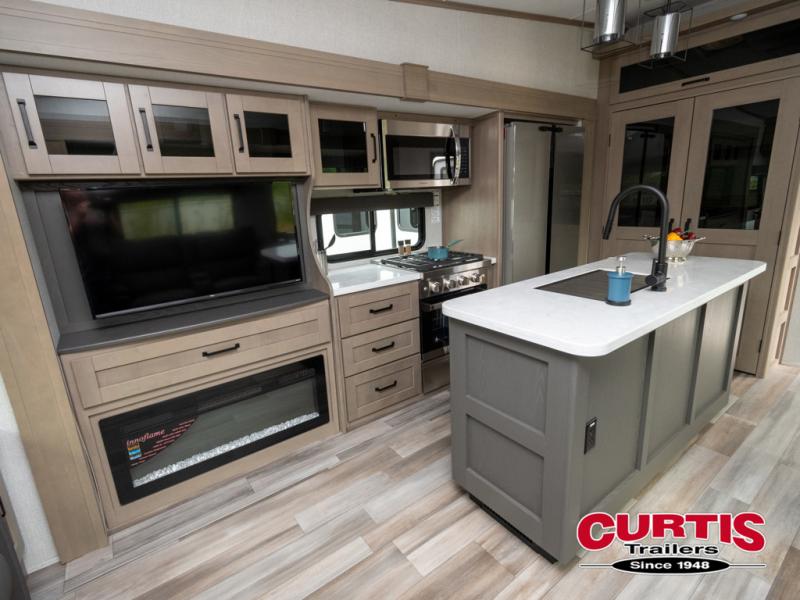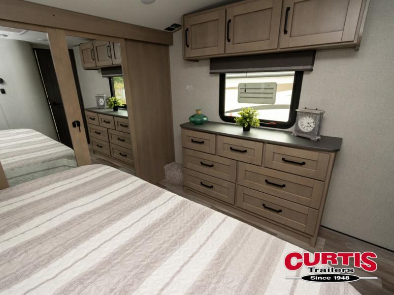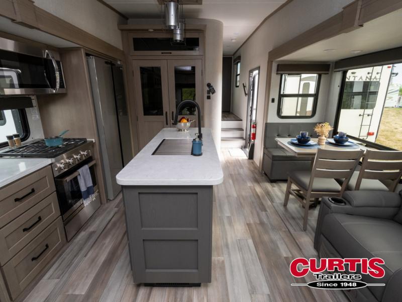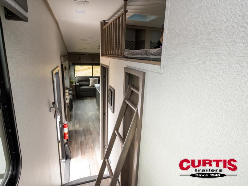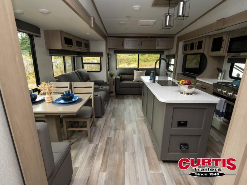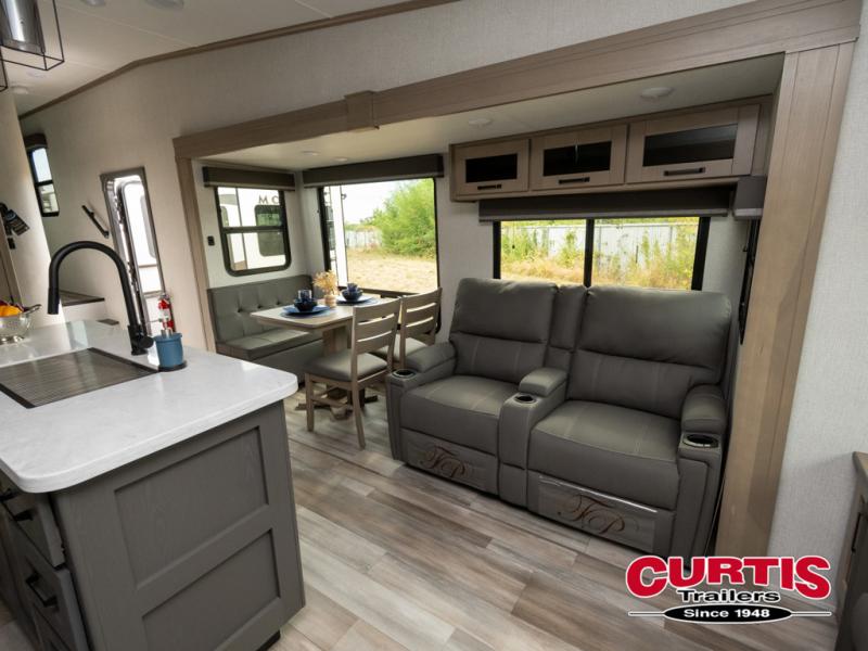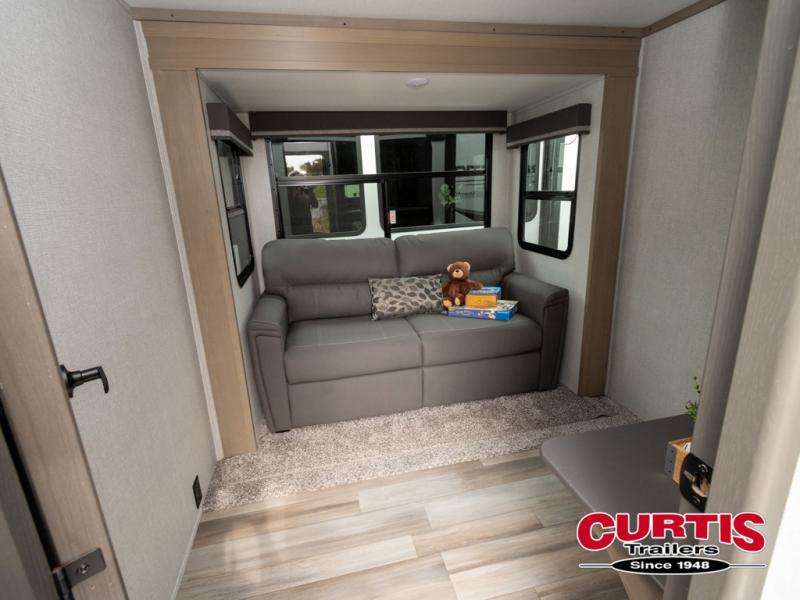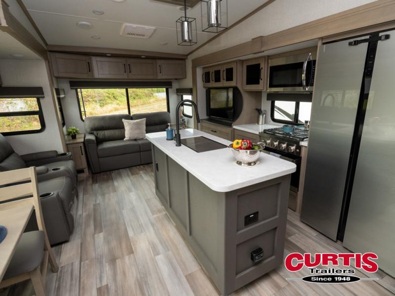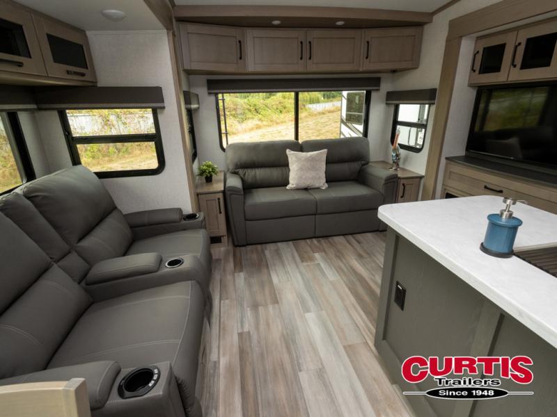 Travel to see new state parks, RV resorts or your family in other states as you tow this fifth wheel to each destination! You will enjoy comfort and convenience, plus a place to work, and be able to offer extra sleeping space for friends and family when they visit. The middle extra room provides a tri-fold sofa slide, a desk, a wardrobe, plus a 64" x 88" upper bed loft area with access from the hallway, which provides two different places to accommodate overnight guests. The full bathroom will keep everyone refreshed, and the front bedroom allows you to sleep on a queen bed slide or choose the king option. And you will love the front wardrobe, the dresser, and the option to add a washer/dryer. The main living and kitchen area provides plenty of seating from the rear tri-fold sofa, the booth dinette or choose the free standing dinette option, and the theater seats with cupholders. And the kitchen island, the appliances, and the large pantry allow you to take everything you need with you.
