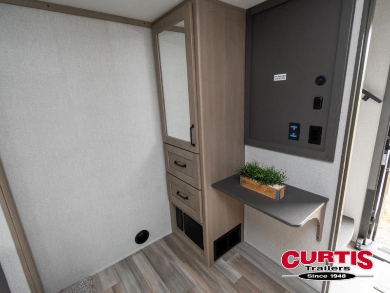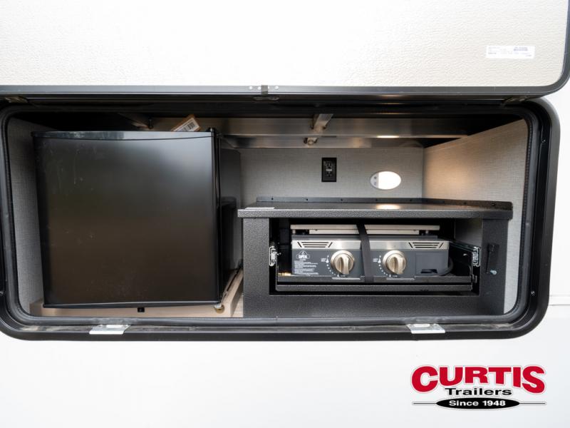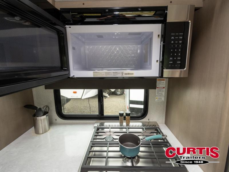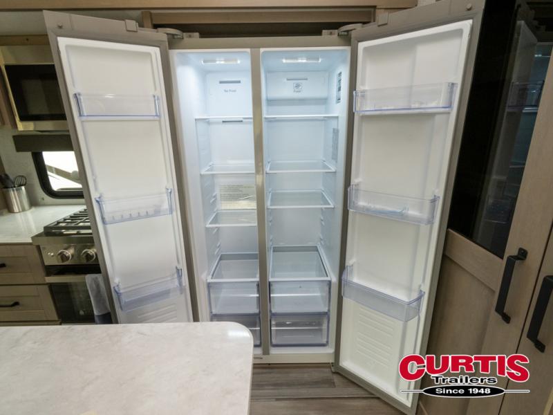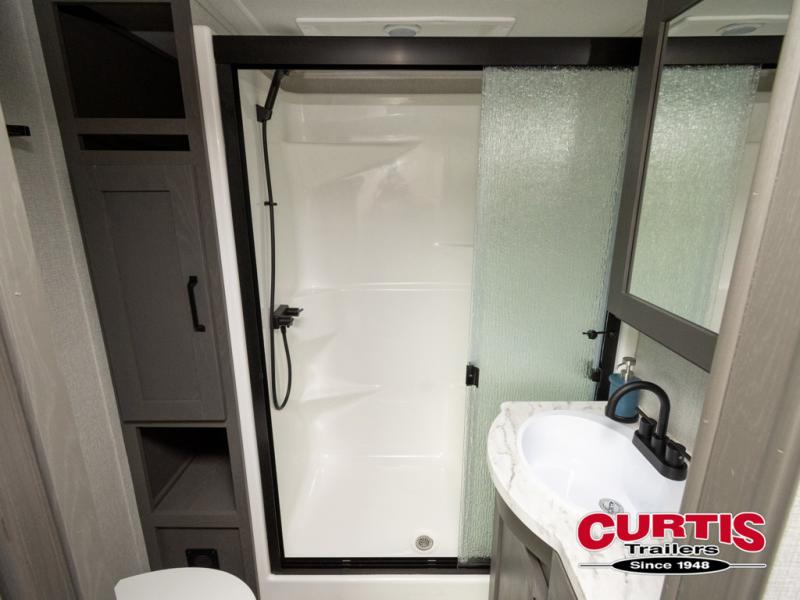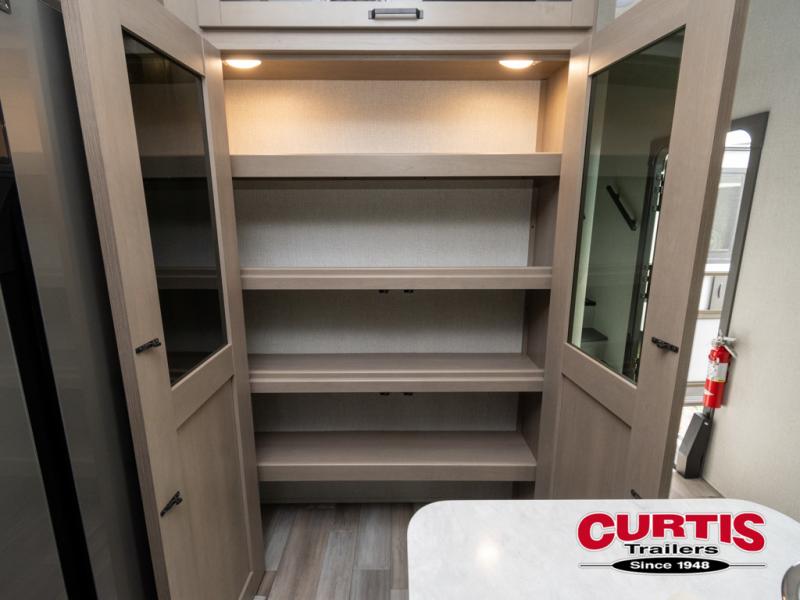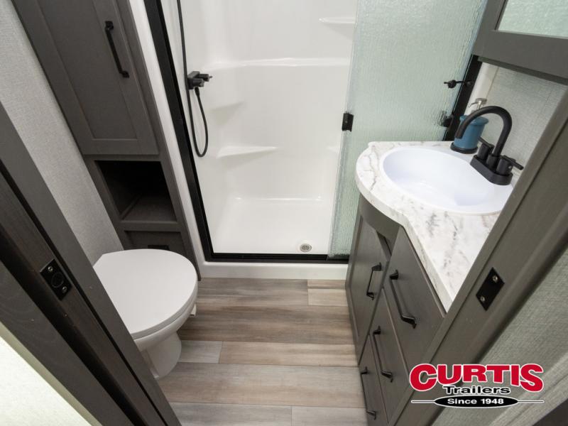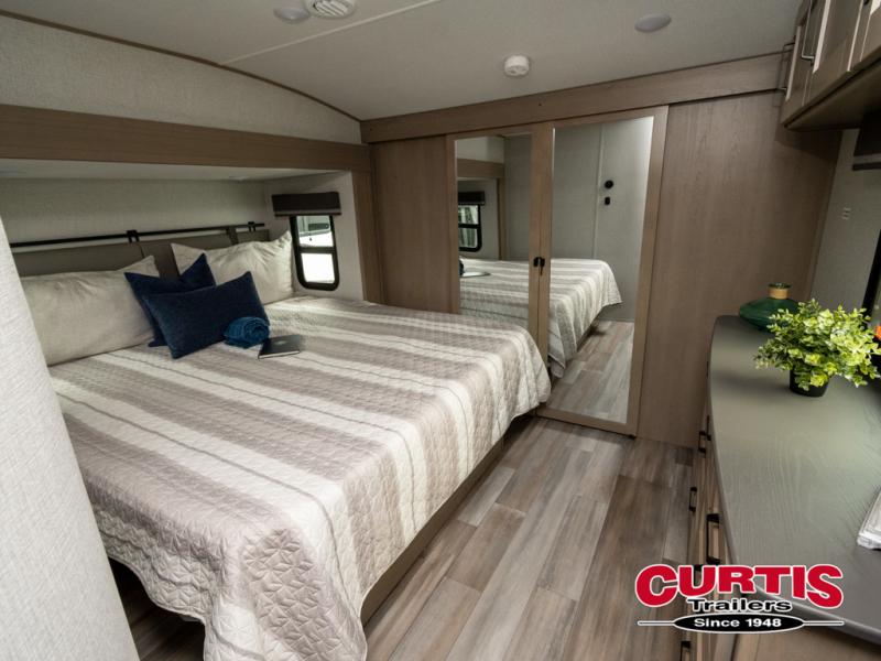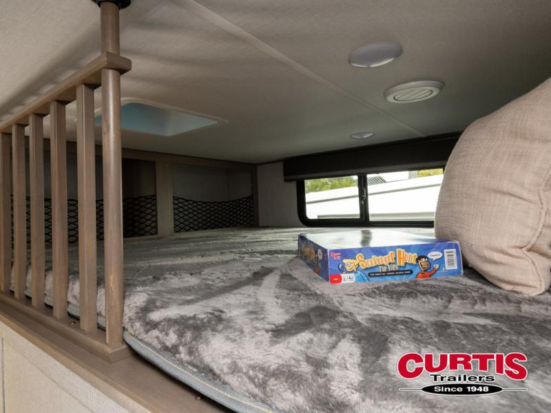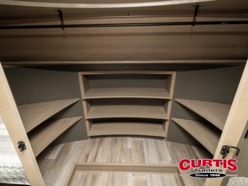 Travel to see new state parks, RV resorts or your family in other states as you tow this fifth wheel to each destination! You will enjoy comfort and convenience, plus a place to work, and be able to offer extra sleeping space for friends and family when they visit. The middle extra room provides a tri-fold sofa slide, a desk, a wardrobe, plus a 64" x 88" upper bed loft area with access from the hallway, which provides two different places to accommodate overnight guests. The full bathroom will keep everyone refreshed, and the front bedroom allows you to sleep on a queen bed slide or choose the king option. And you will love the front wardrobe, the dresser, and the option to add a washer/dryer. The main living and kitchen area provides plenty of seating from the rear tri-fold sofa, the booth dinette or choose the free standing dinette option, and the theater seats with cupholders. And the kitchen island, the appliances, and the large pantry allow you to take everything you need with you.
