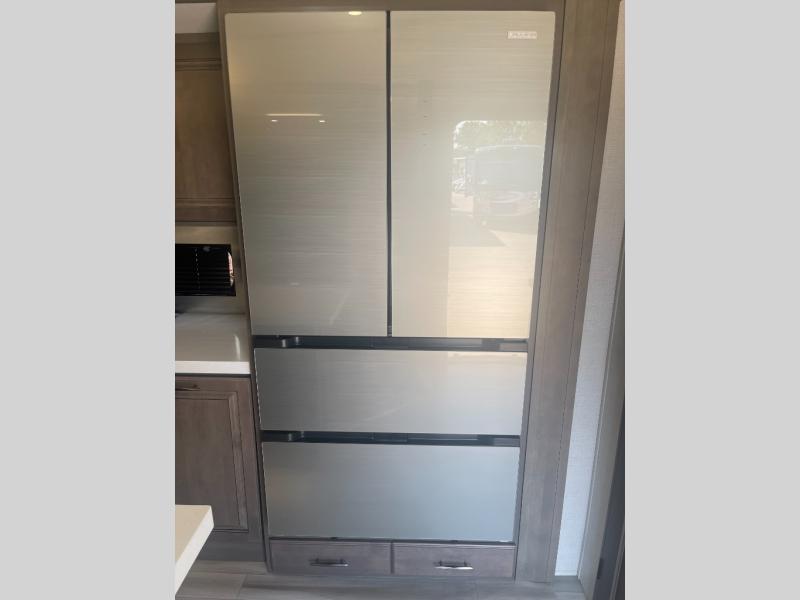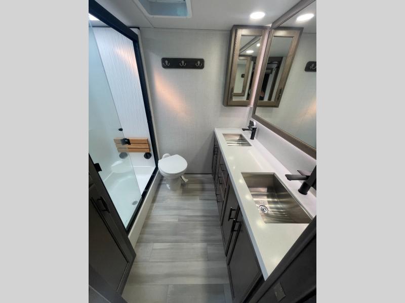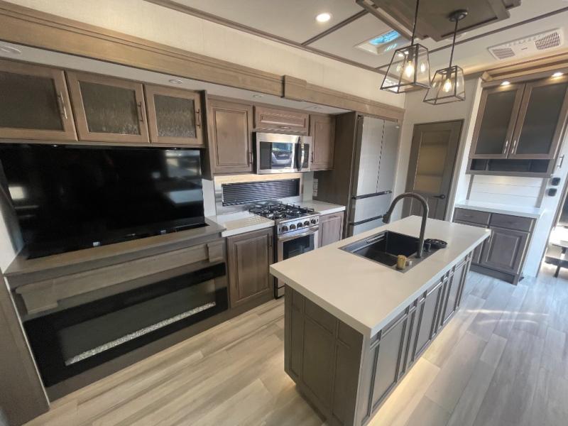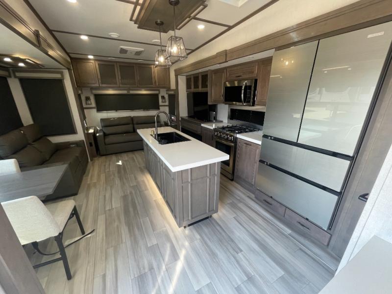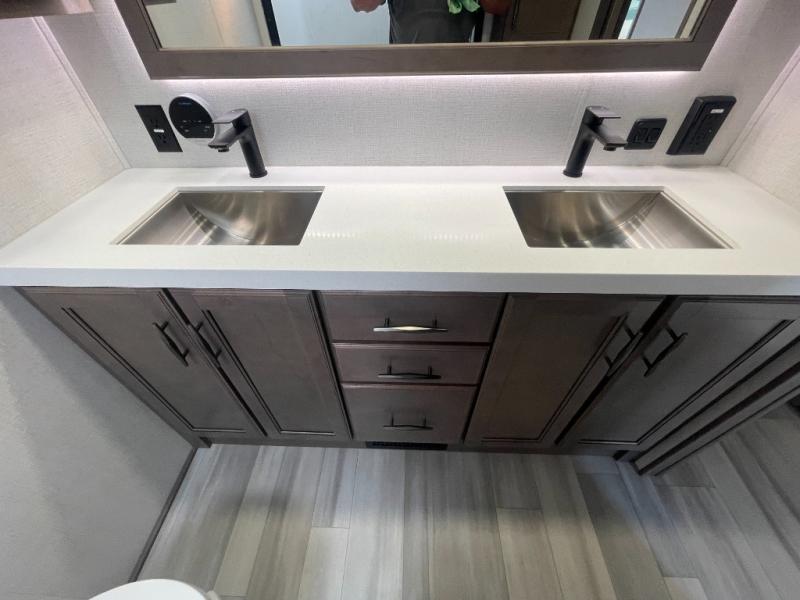 Are you looking to upgrade from a travel trailer to a fifth wheel? If so, this model will be perfect for you! Once you arrive at the campground, you can unload your gear from the pass-through storage, put out the two power awnings, then relax with a cold drink. Inside, you can kick your feet up on the theater seating, play a game at the free-standing dinette, or relax on the tri-fold sofa. The chef of your group will have a kitchen island with a Smart sink, dishwasher prep if you want the option to make cleaning up easier, plus a spacious 20 cu. ft. 12V refrigerator. There is also a 24" residential oven, convenient pull-out trash cans, plus a pantry and a hutch for storage galore! Having two bath sinks in the full bath is sure to be a big convenience when getting ready for bed, and the queen bed slide out (king bed optional) in the front bedroom will provide a great night's rest. You will also find a front wardrobe, a slide-top dresser with an LED TV, plus washer/dryer prep!