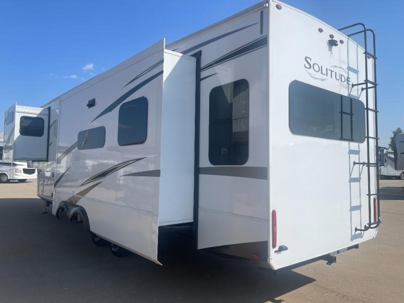 Each Solitude fifth wheel by Grand Design features a 101" wide-body construction, heavy duty 7,000 lb. axles, frameless tinted windows, and high-gloss gel coat sidewalls. You can camp year around thanks to the Weather-Tek Package that includes a 35K BTU high-capacity furnace, an all-in-one enclosed and heated utility center, and a fully enclosed underbelly with heated tanks and storage. Inside, you'll love the premium roller shades, hardwood cabinet doors, solid surface countertops and sinks, plus residential finishes throughout to make you truly feel at home. Each model also includes a MORryde CRE3000 suspension system, self adjusting brakes, and a MORryde pin box that will provide smooth towing from home to campground. Affordable luxury is possible with the Solitude fifth wheels; choose yours today!